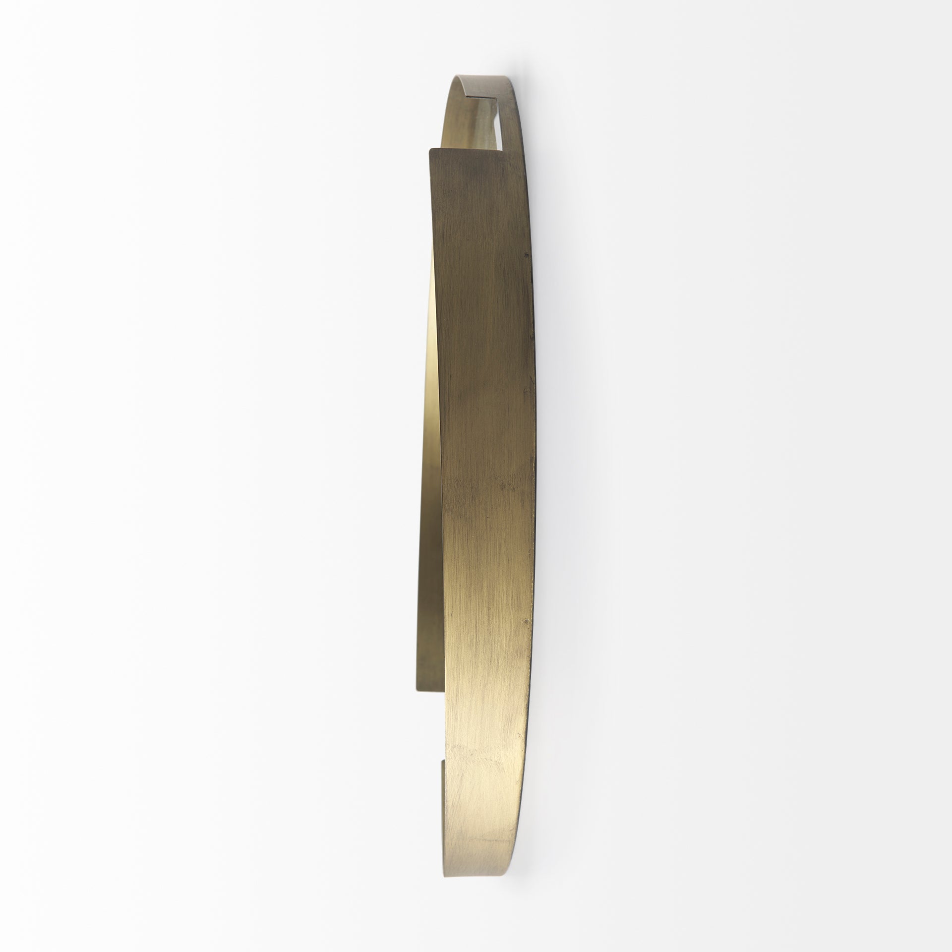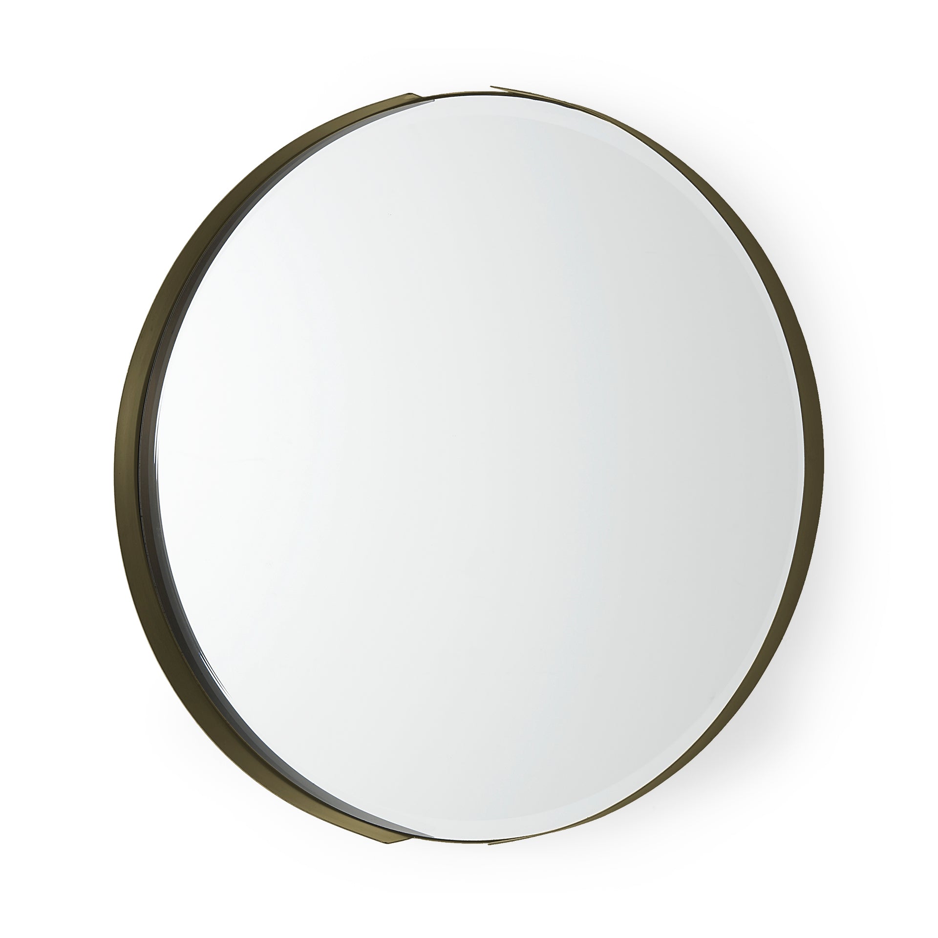 Slivers of flat iron edging encircle the round mirrored glass, leaving two offset gaps that deliver a touch of visual interest and elegance, and harmonize perfectly with the antique gold finish.Β