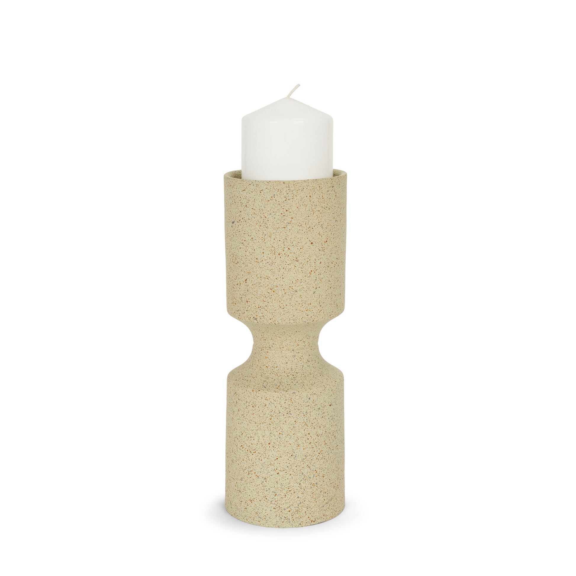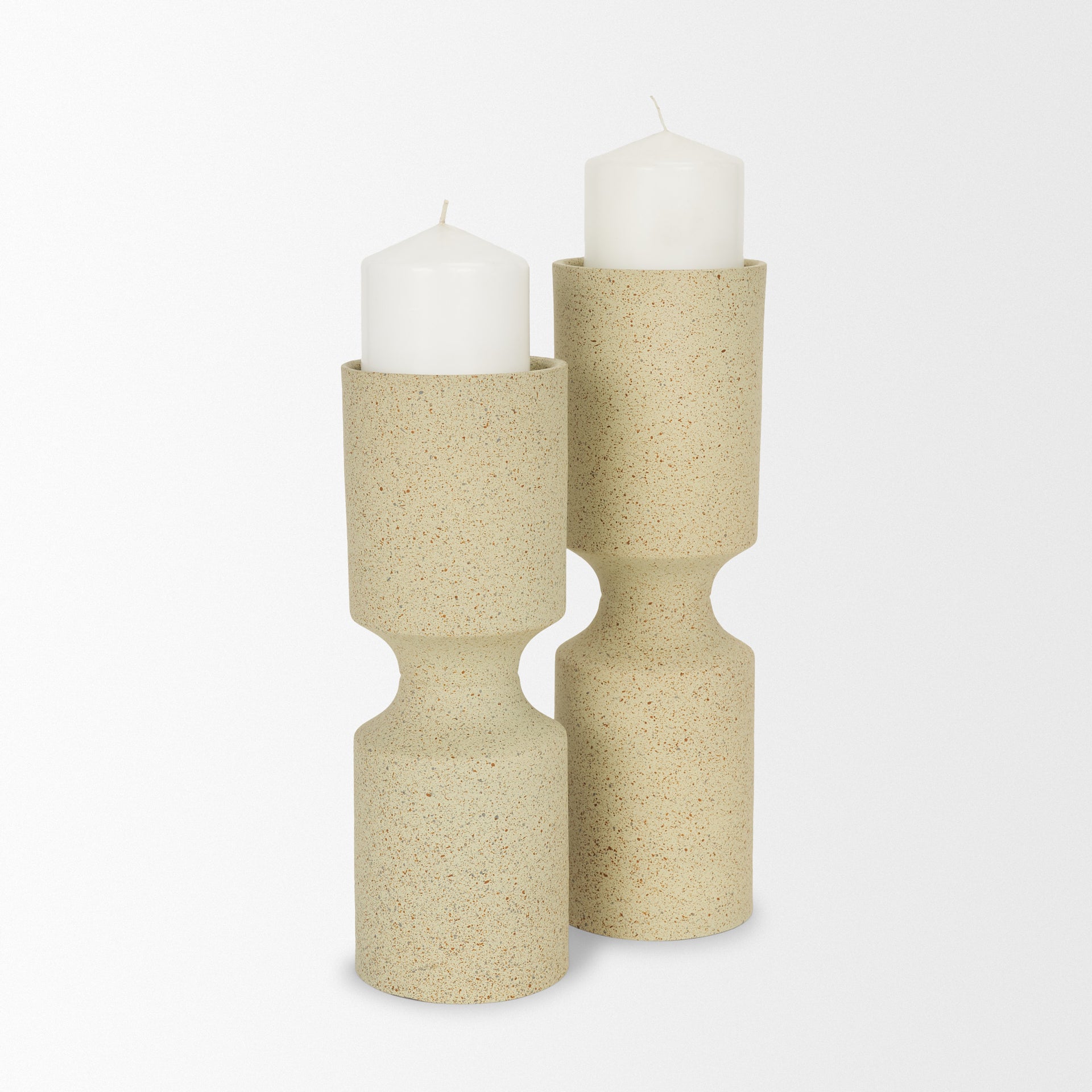 The Akira Candle Holder is crafted from metal with a sandy textured beige finish.