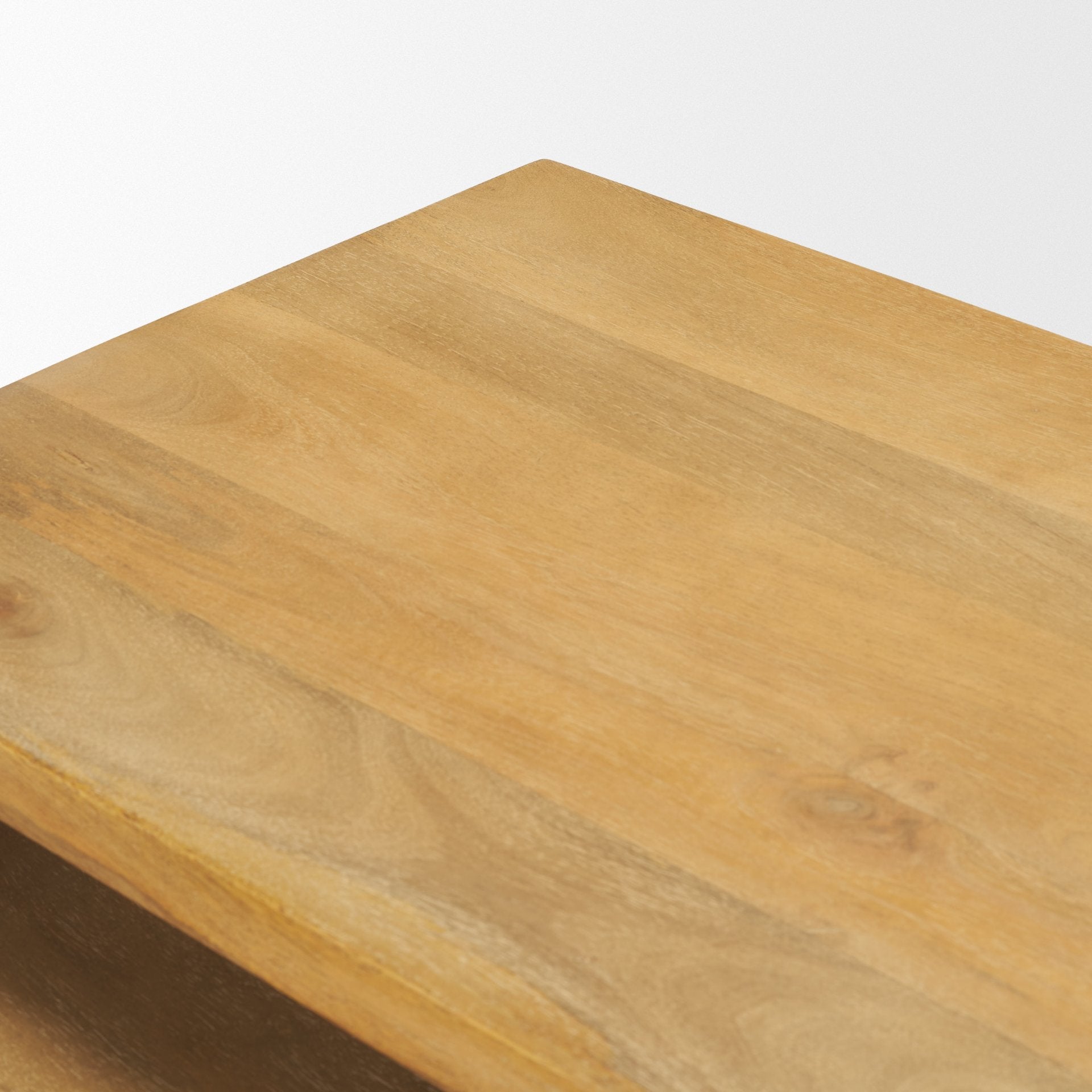 A duo of versatile nesting tables in simple cubic forms, made from brown mango wood, which will fit perfectly in the modern home or office space