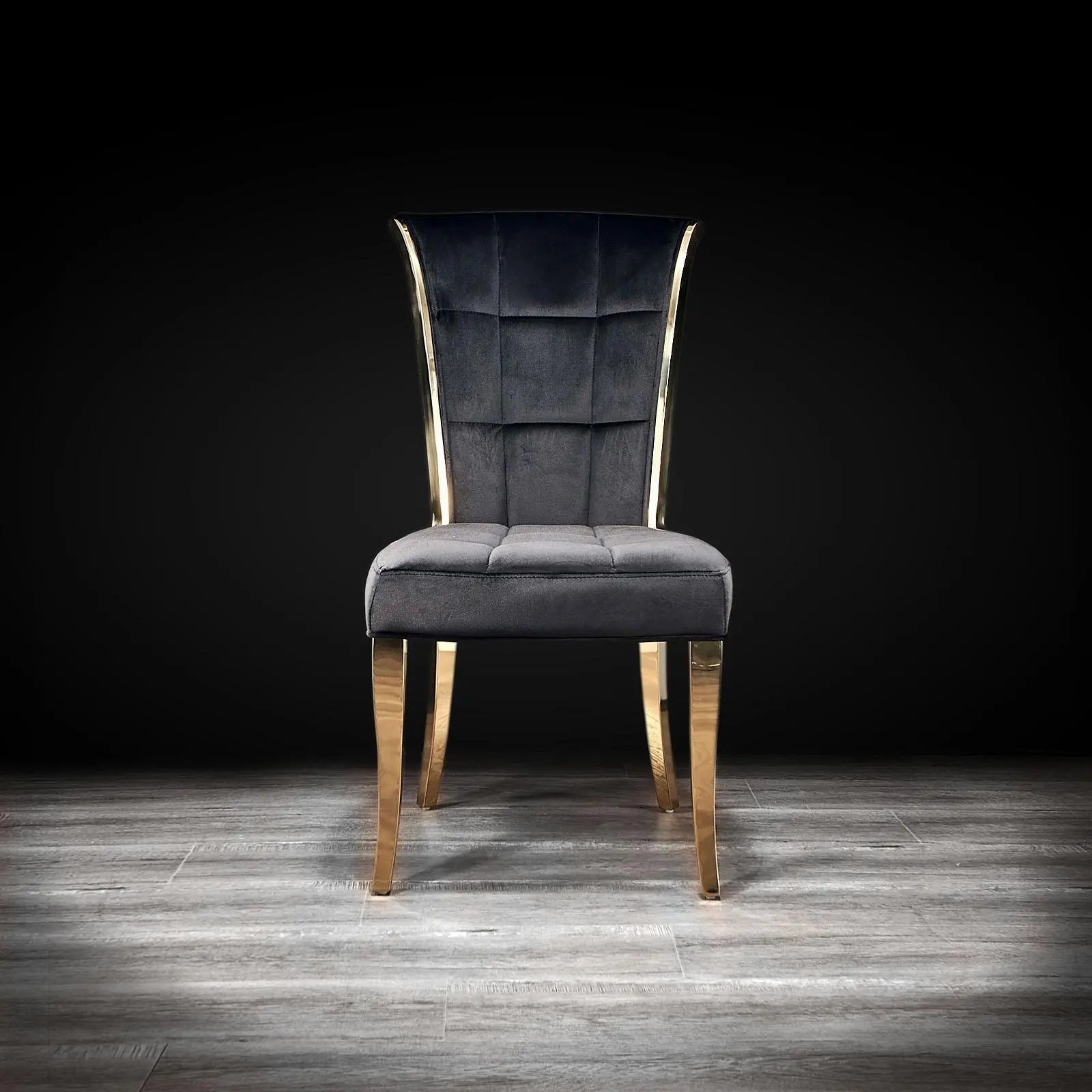 Alanso stylish dining chair features a pushed in tufted design detail on the back support. The chair has midcentury modern lines with elegant new materials. The velvet upholstery gives the chair a luxurious feel and look while the Gold stainless-steel finish on the frame adds a touch of contemporary to this elegant chair by Norhaus Furniture. Available in Black, Beige, Taupe, Darl Blue, Dark Green and Gray colors.
