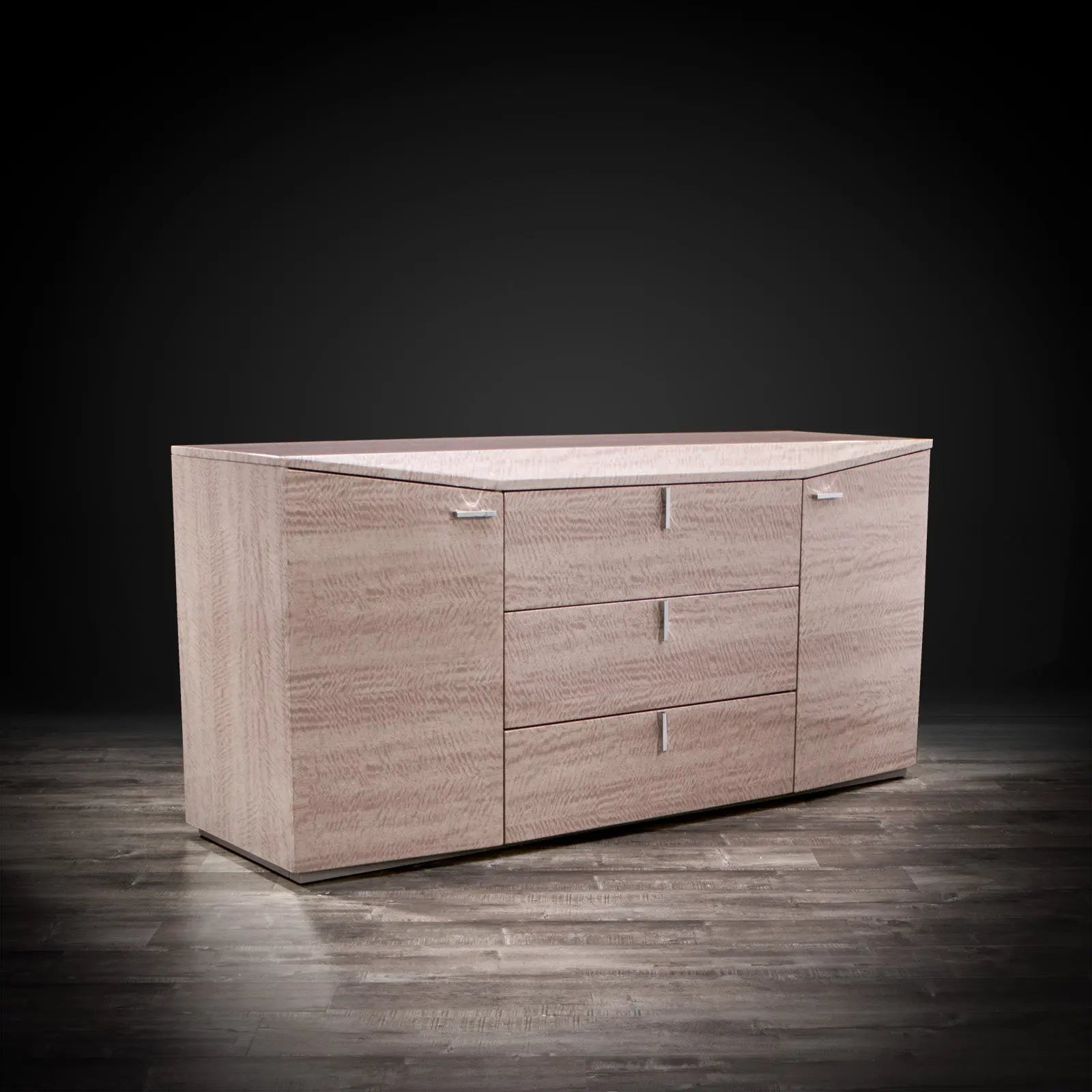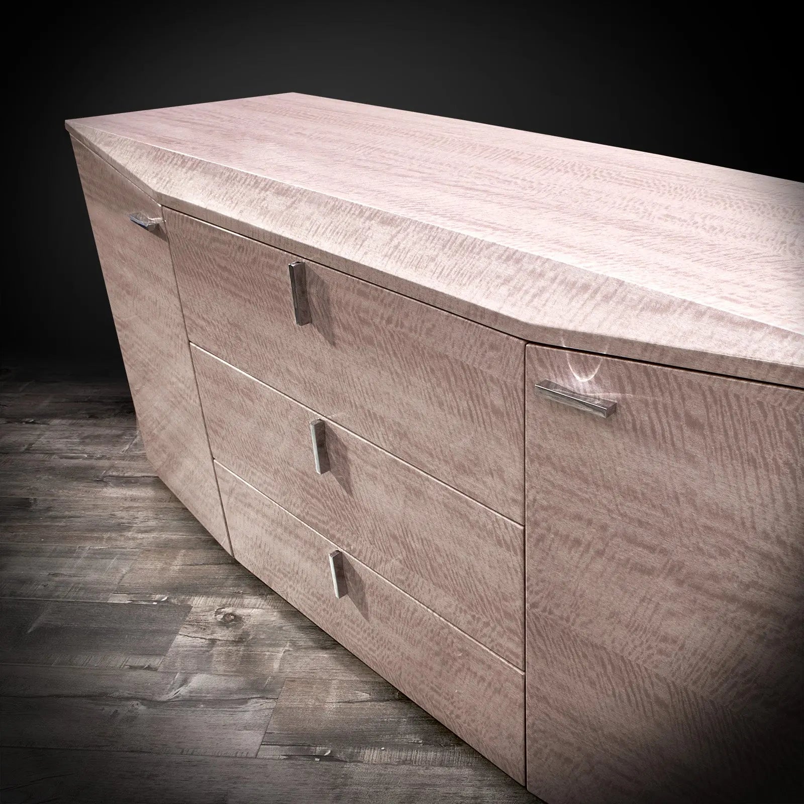 Contemporary lines married with the impeccable aesthetic sense of Roberto Cassie Amalfi will bring a new level of luxury to your home or office. This beautiful buffet table features perfectly polished stainless-steel handles that perfectly compliment its elegant clear lacquer finish and entrancingly gorgeous shape. The wood grain on this piece is striking and presents a subtle but distinct homage to the natural world and its influence on the tradition of craftsmanship. If you want to breathe new life into the room and present a feeling of sophistication and elegance, you owe it to yourself to consider this truly stunning piece.