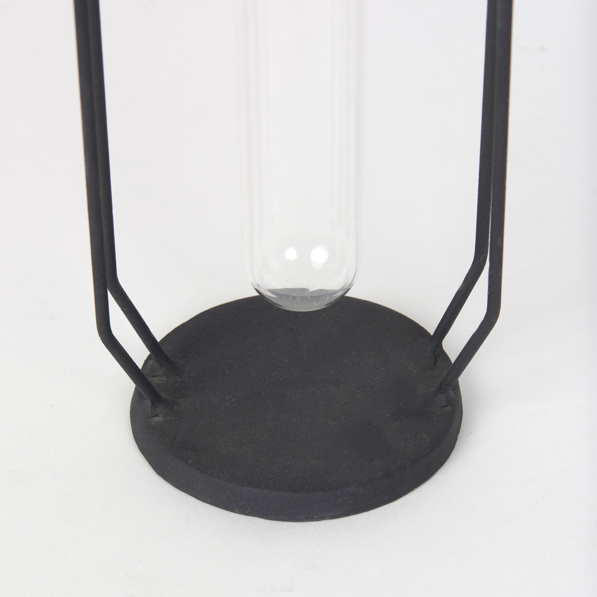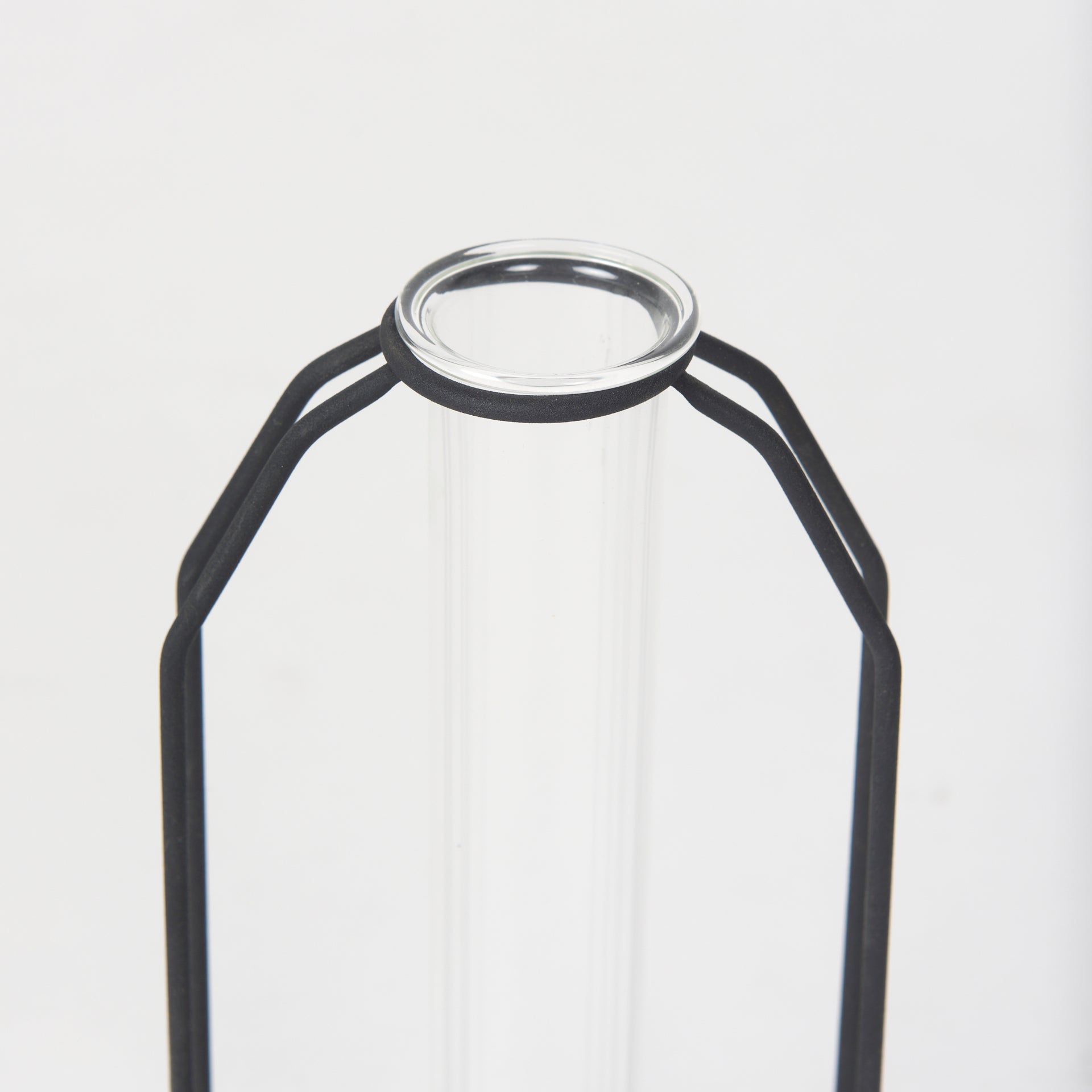 The Aria features a black iron frame with slender, arched arms that hold a glass vial-shaped vase – perfect for the modern or contemporary interior