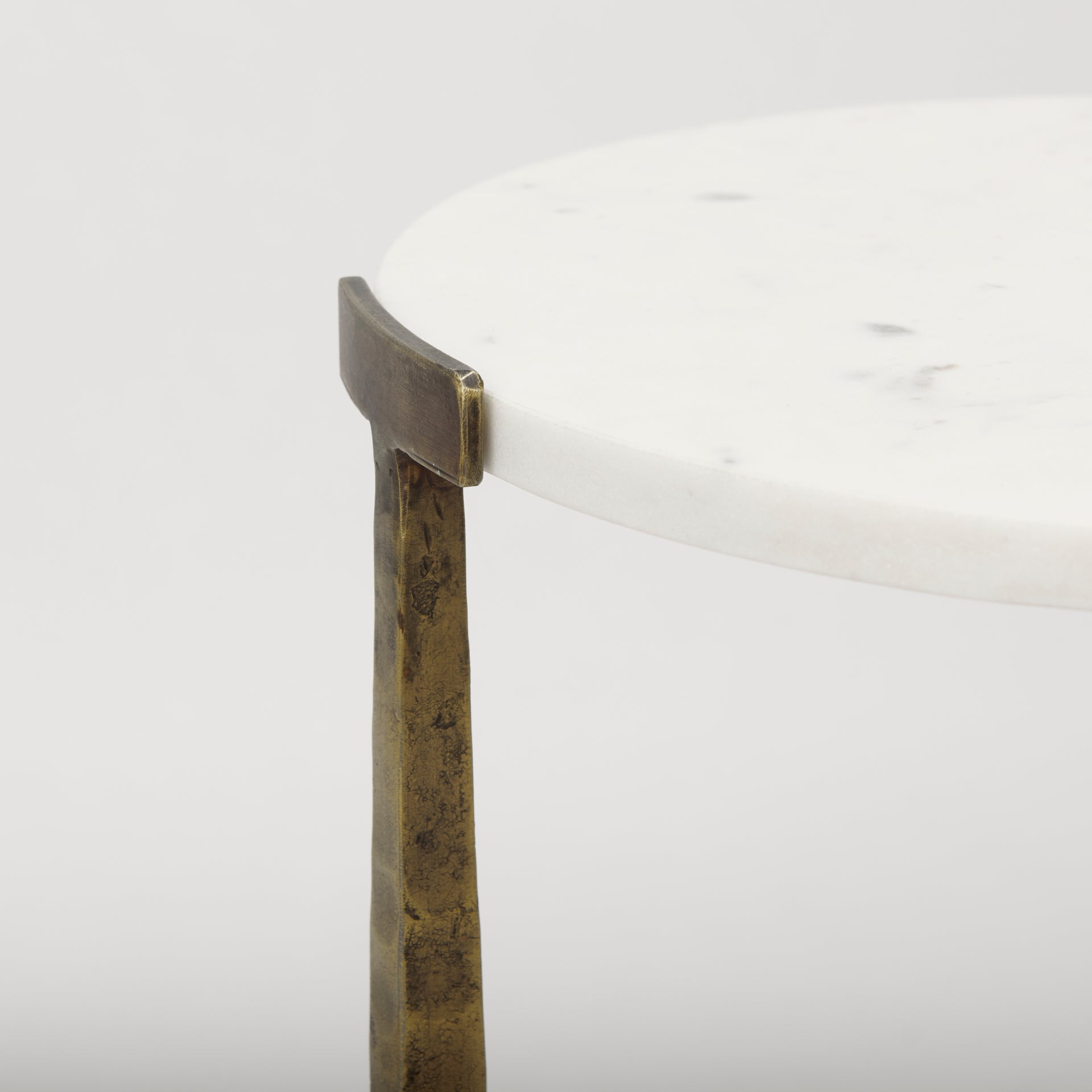 The Atticus Side Tables feature a solid white marble that is set in a hammered iron metal, cross-leg frame with an antique gold finish.