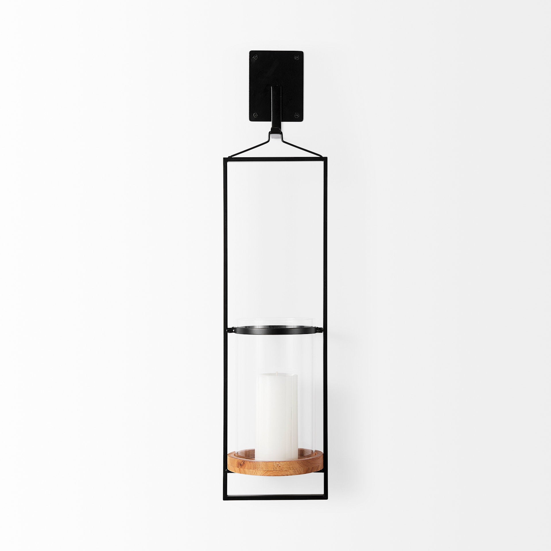 This candlelight wall sconce features a rectangular iron frame hanging sleekly from a square metal hook. A round, wooden plate accommodates a tall pillar candle that is held securely in place by a metal ring in the middle.Β