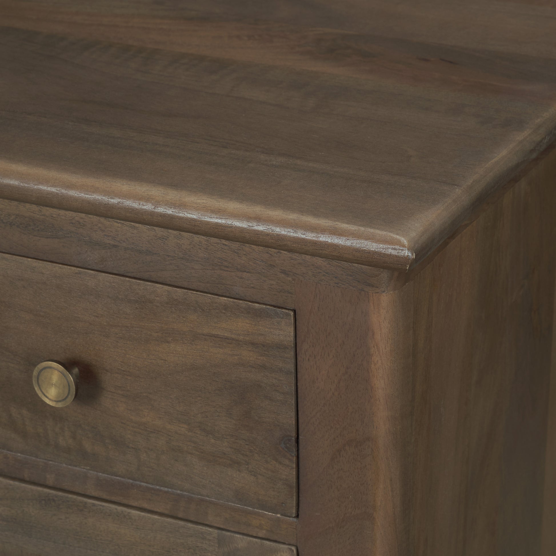 Constructed from solid mango wood in a smooth, dark brown finish accented by antiqued brass finished iron metal hardwareΒ