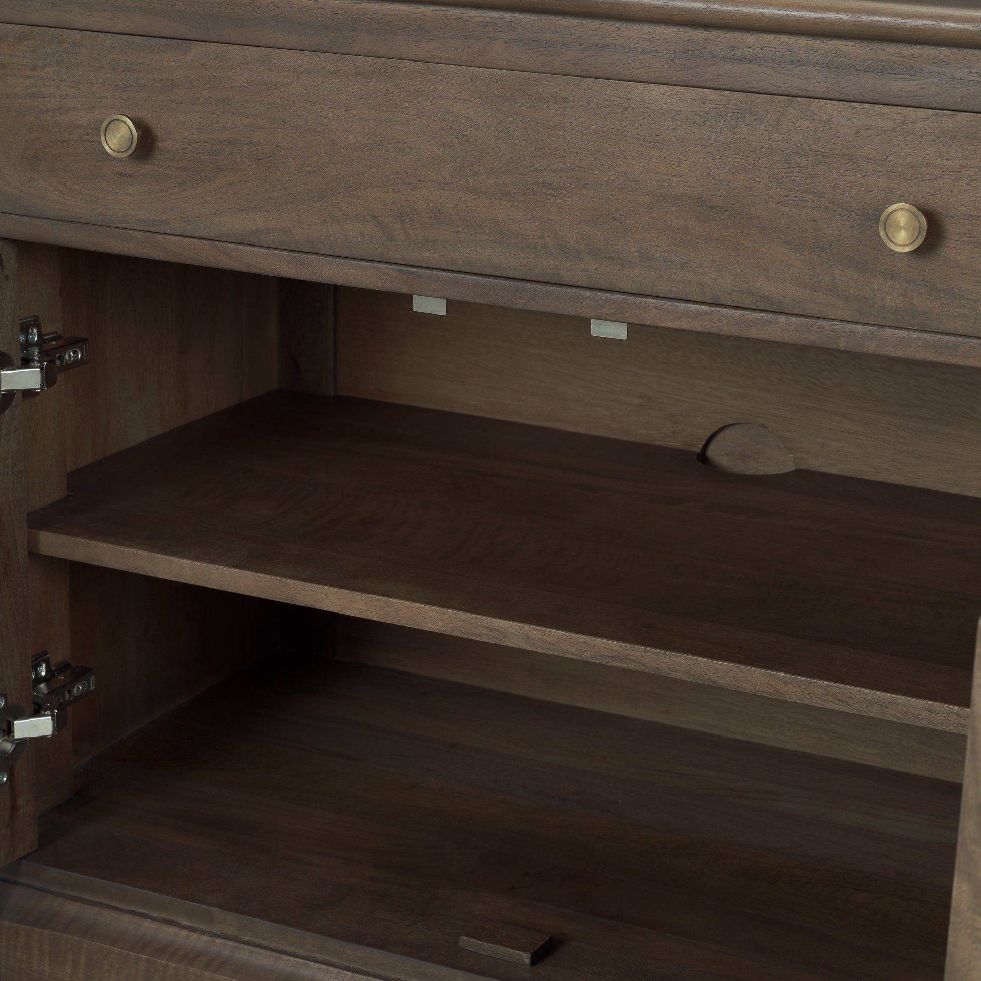 Braxton is a two door accent cabinet constructed from smooth, dark brown solid wood featuring one drawer, embellished by dark aged brass finished metal knobs.