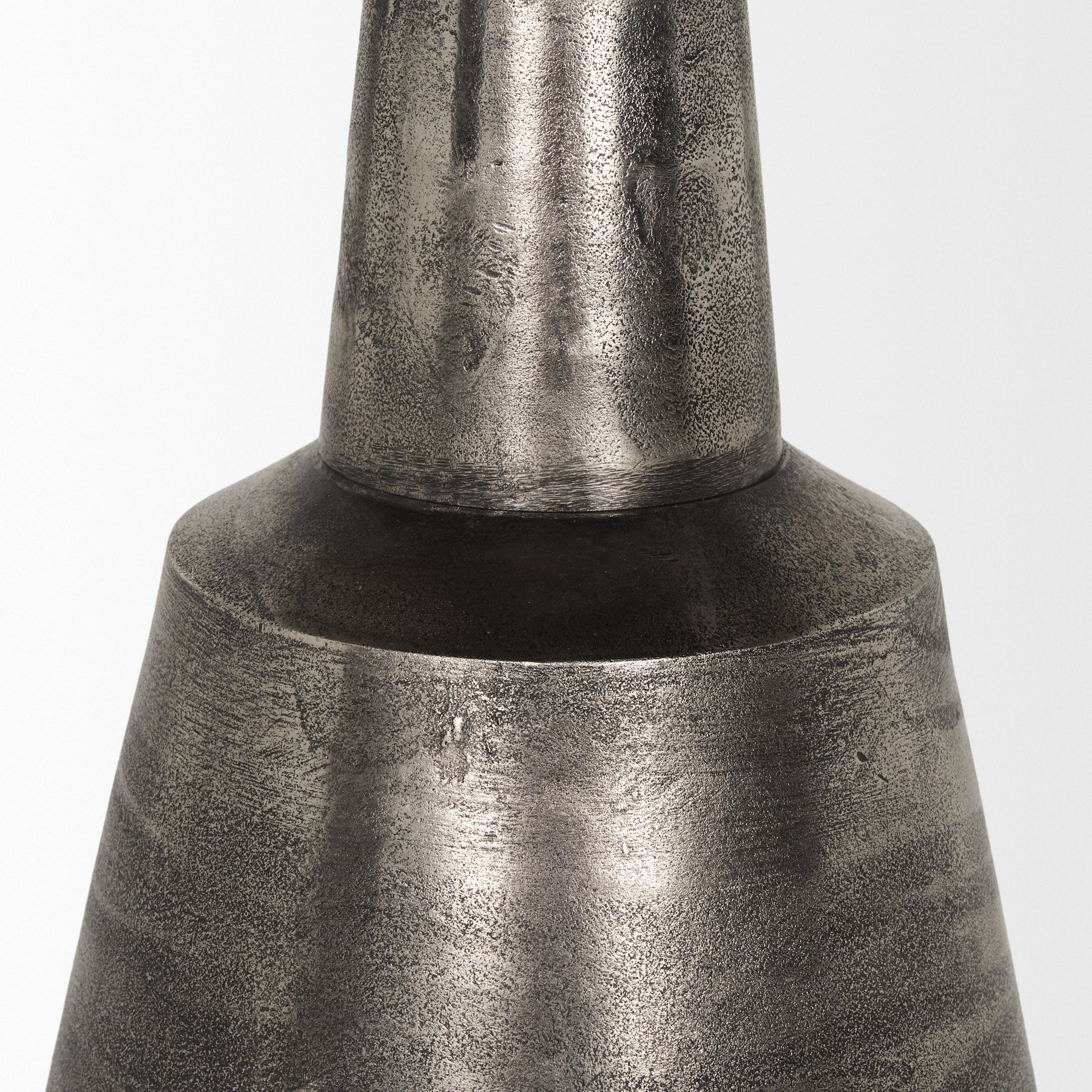 The textured metal enhances the intriguing polished nicel finish.
