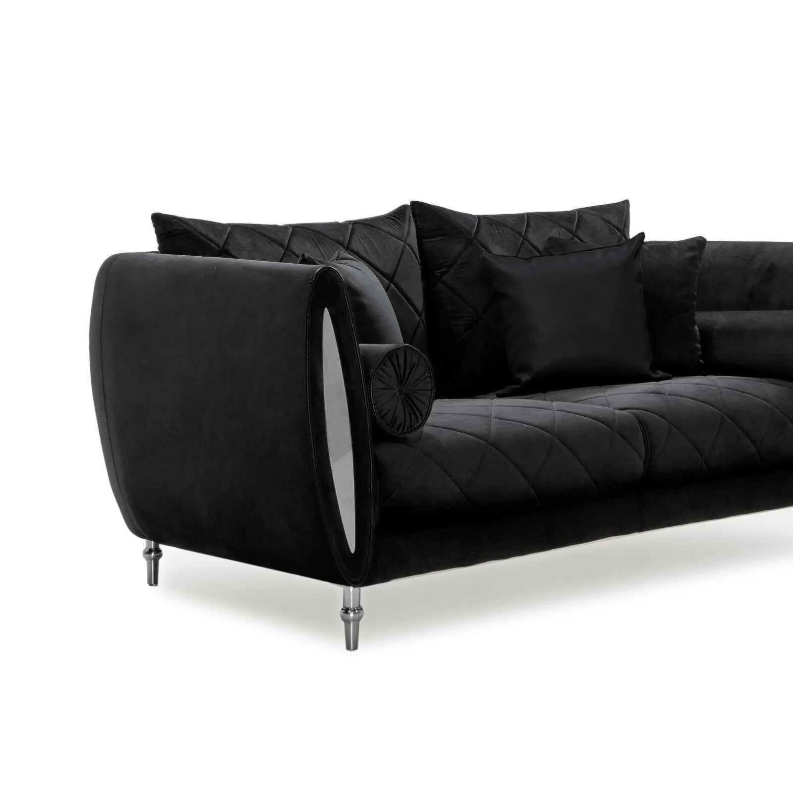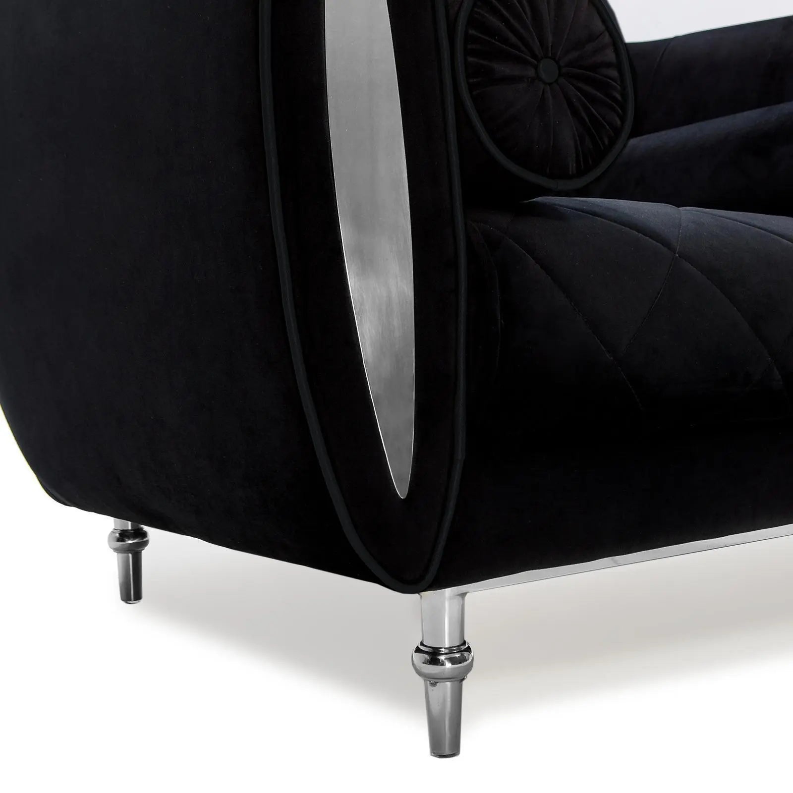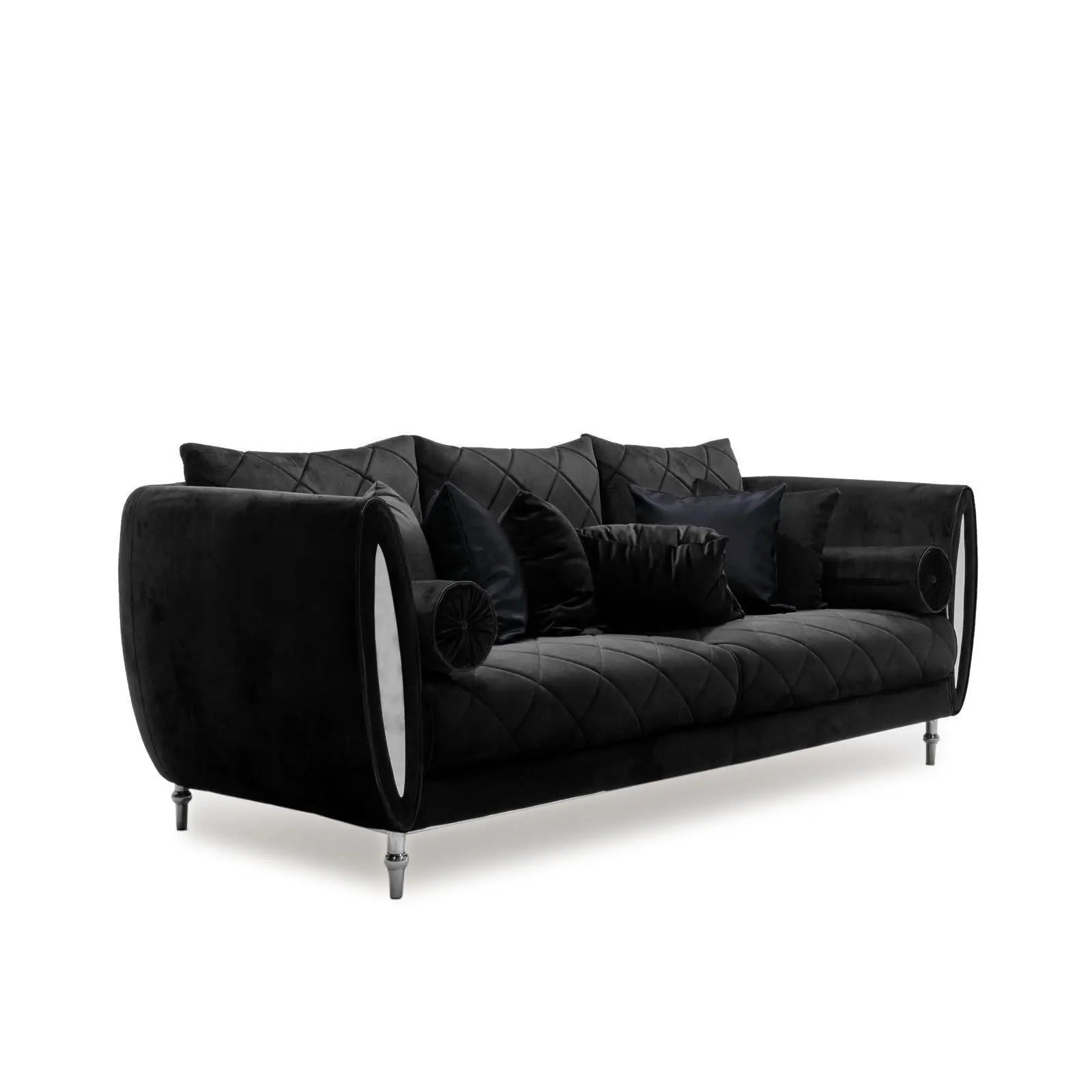 Cerchio Sofa Set by Norhaus Furniture is made with a beautiful black velvet performance. The cerchio have a quilted back and seat detail made with a luxurious padded fabric. The pillows are included as pictured for each piece, the sofa has a silver arm detail and a stainless steel leg finished in gold.