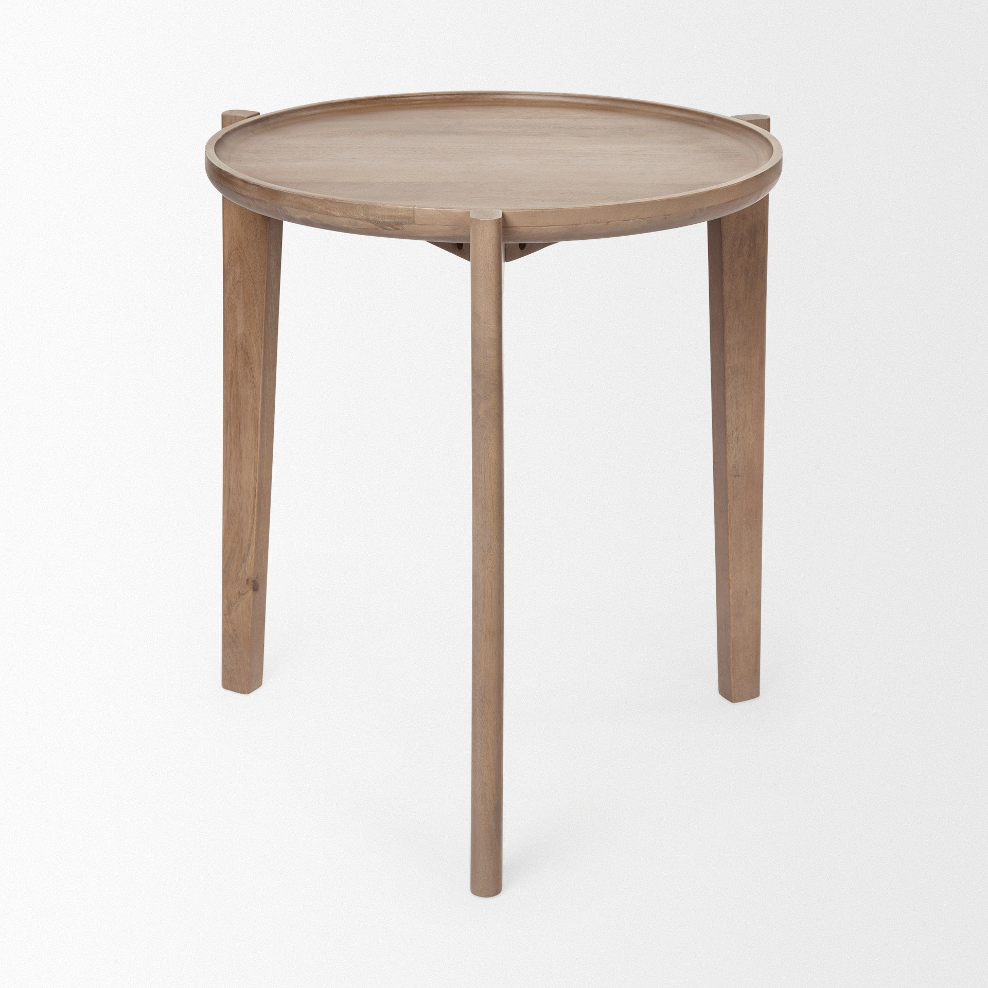 This accent table is made entirely from solid Mango wood. It has a round top with a lipped edge that rests snuggly atop three straight legs.Β
