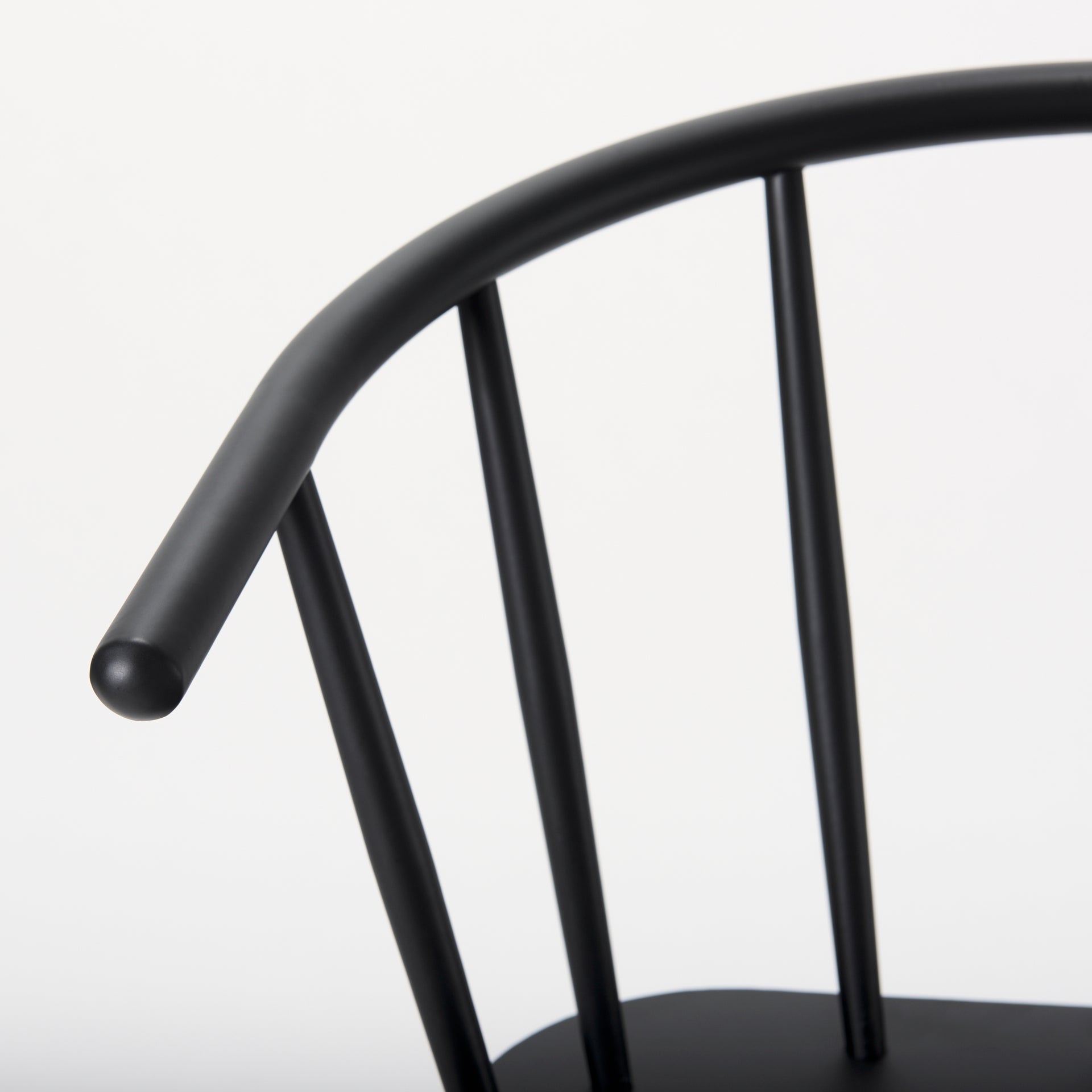 A modern counter or bar stool with a traditional twist, designed in metal and finished with a smooth matte black color