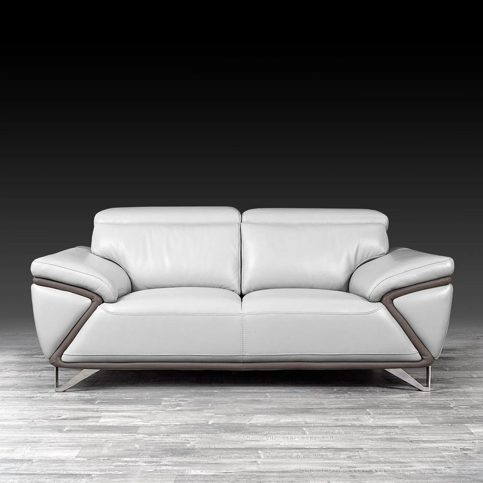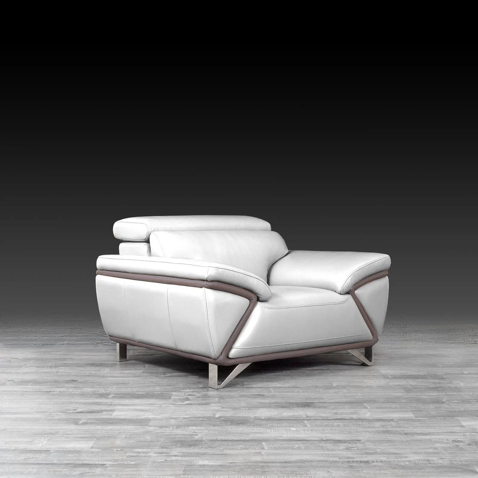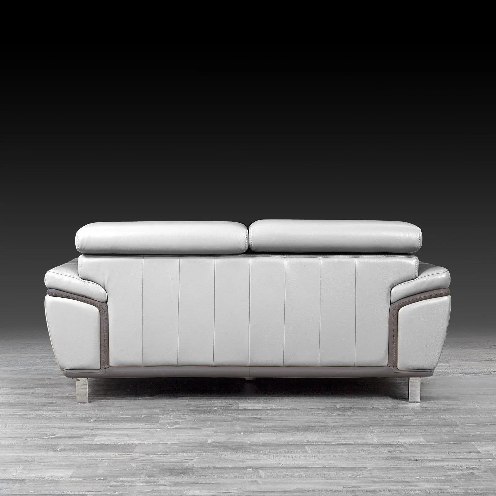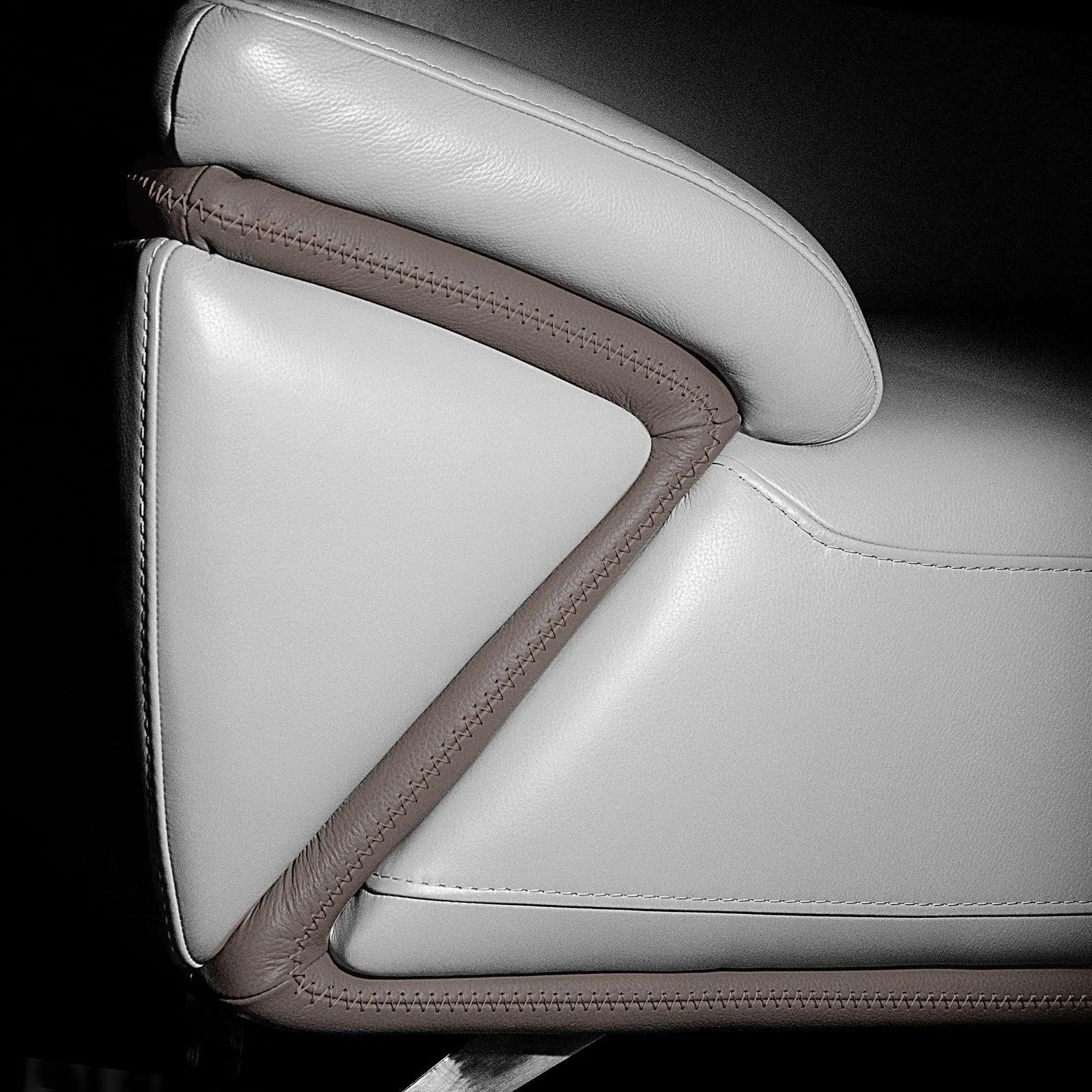 Dante sofa set by Norhaus Furniture is an elegant and contemporary sofa design made with the highest quality top grain beige leathers and features a two tone accent detail. It also has a zigzag stitch which adds to the character of this piece. The adjustable headrest provide extra comfort and the wide arms made this set the perfect lounging and comfortable piece. Dante features polished stainless steel legs.