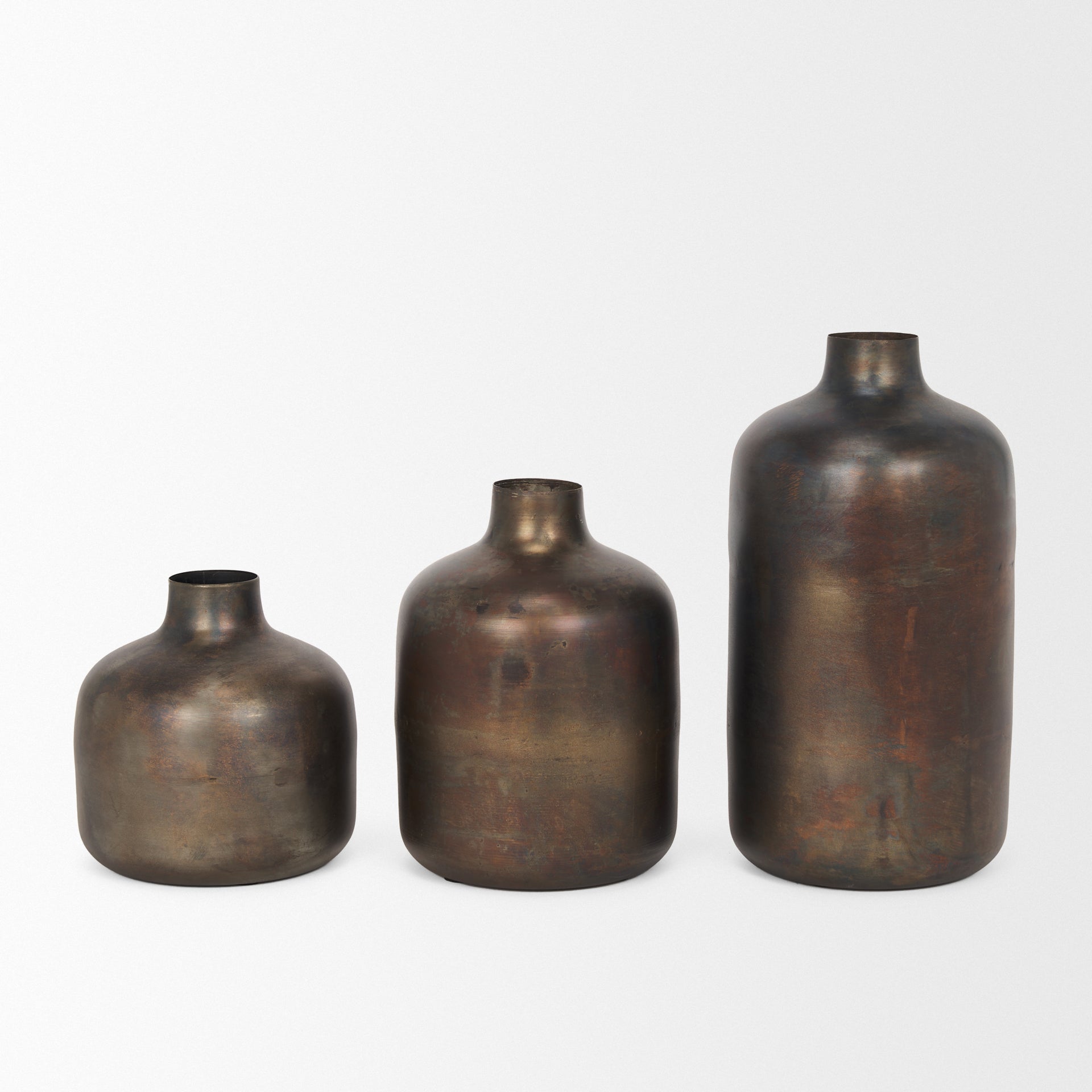 The Daya Vases are handmade from GI sheet metal with a smooth antiqued-brass finish.