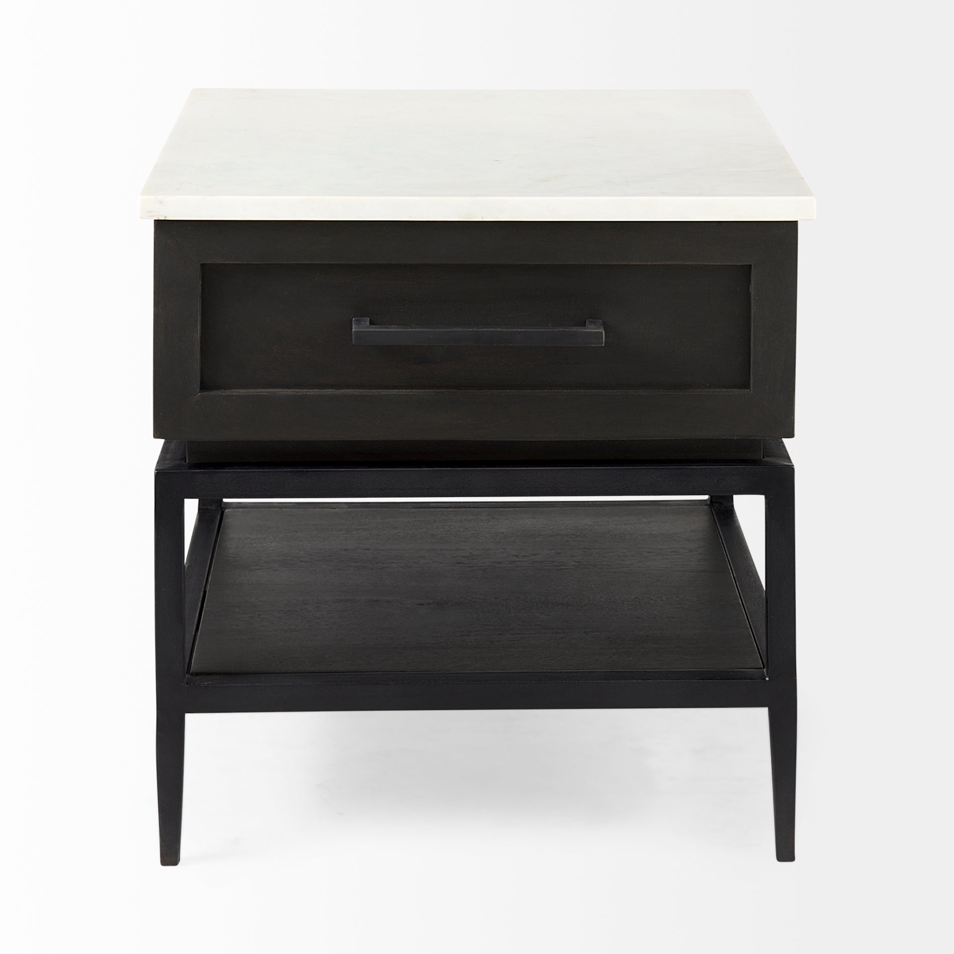 This modern side table blends a fusion of materials in a clean, straightforward design. It features a solid Mango wood body with one drawer and a bottom shelf, topped by a rectangular marble slab and supported, off the floor, by four iron legs.Β