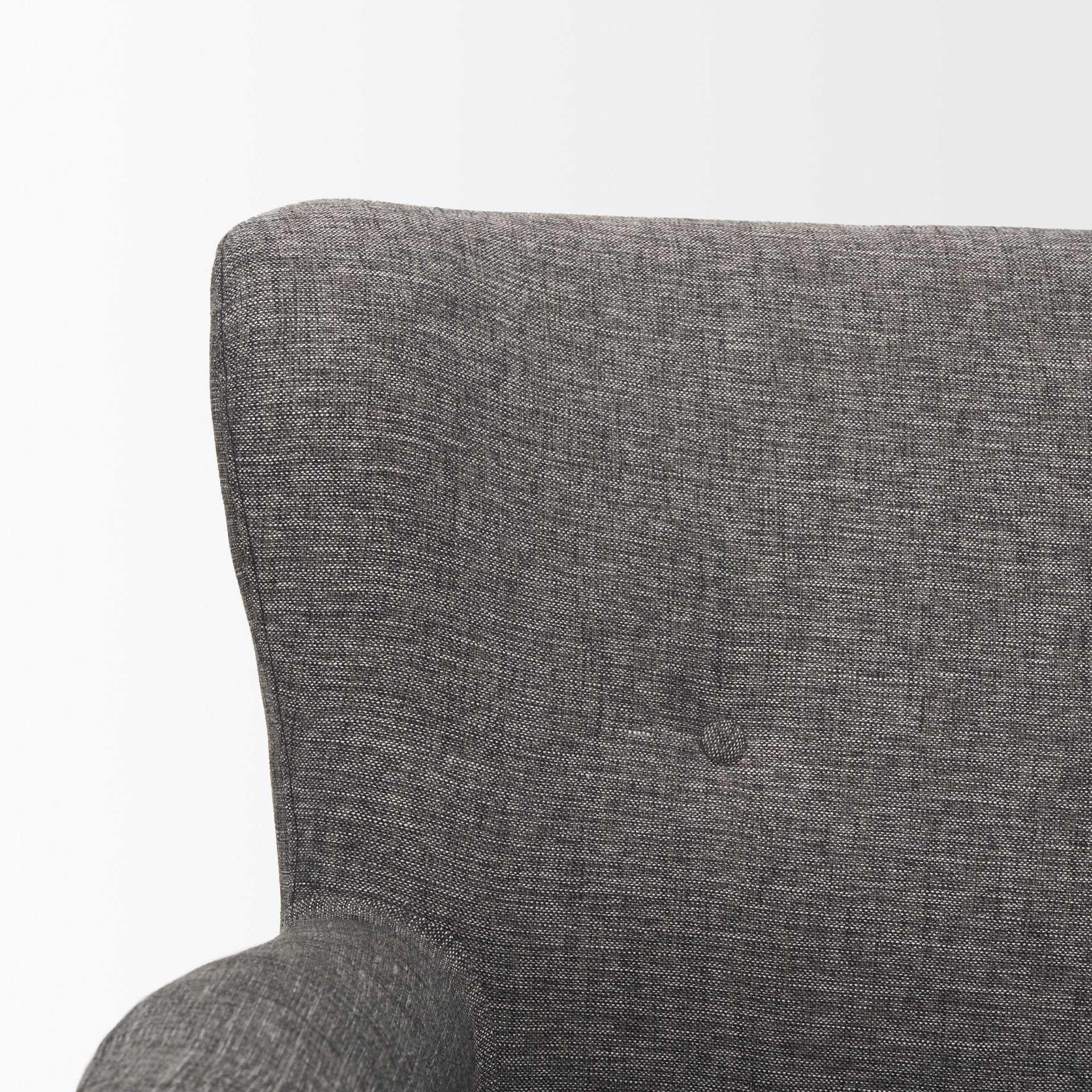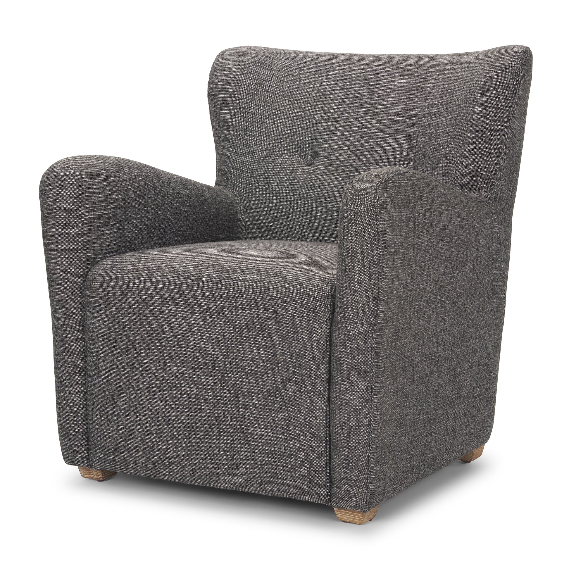 The Dunstan Accent Chair is upholstered in a gray twill fabric with 2 buttons on the backrest and medium brown wood feet.