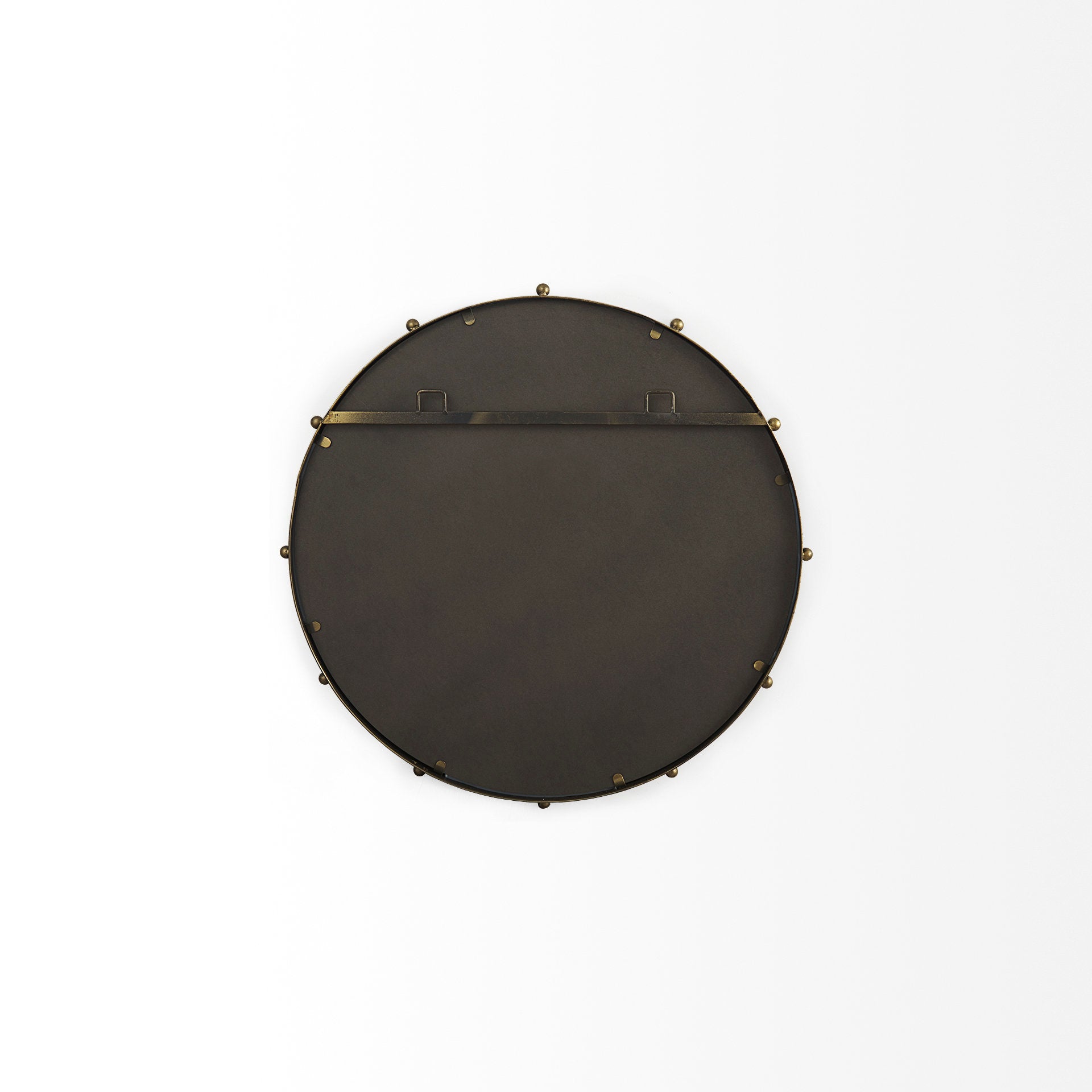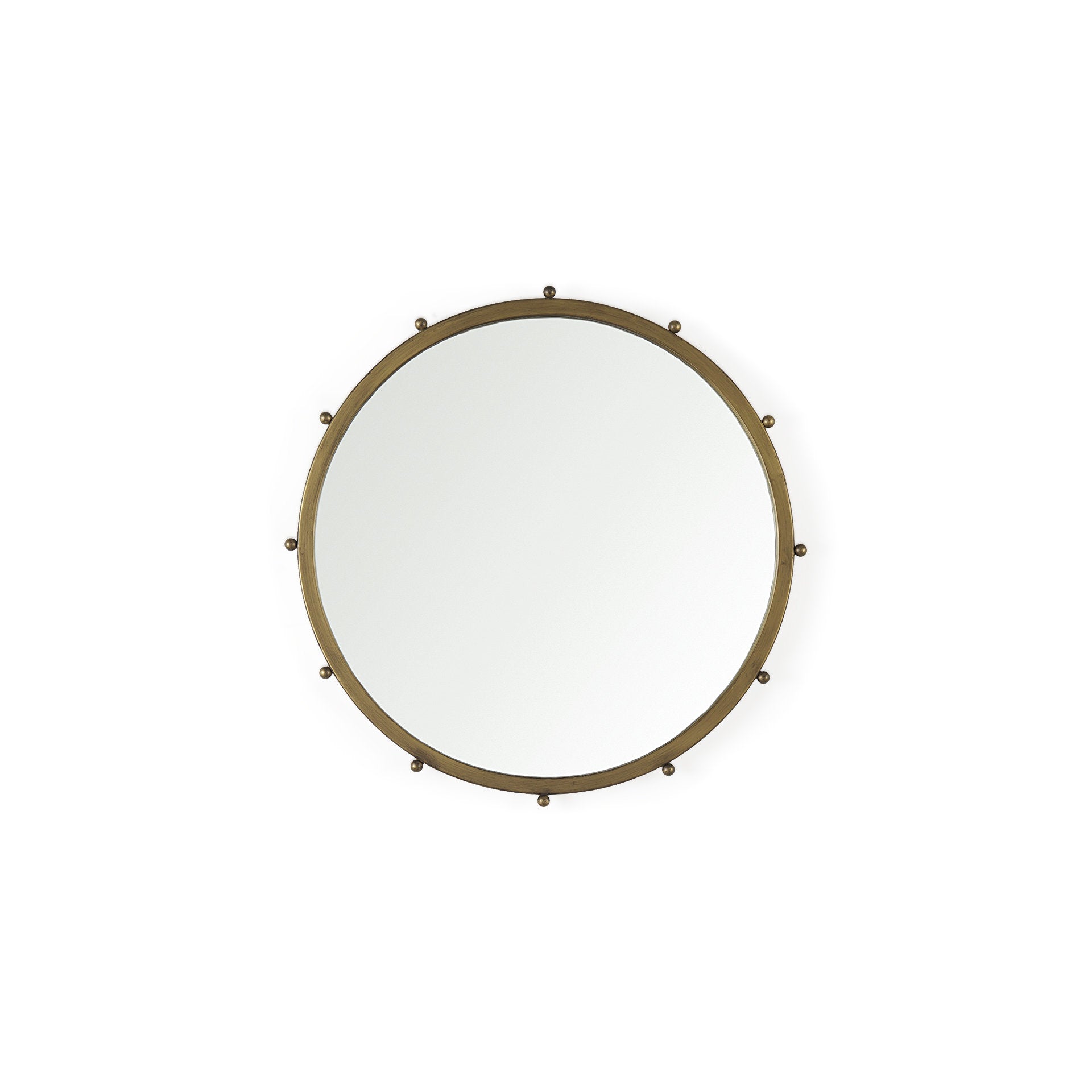 The Elena is a round metal wall mirror trimmed with dainty metal beads