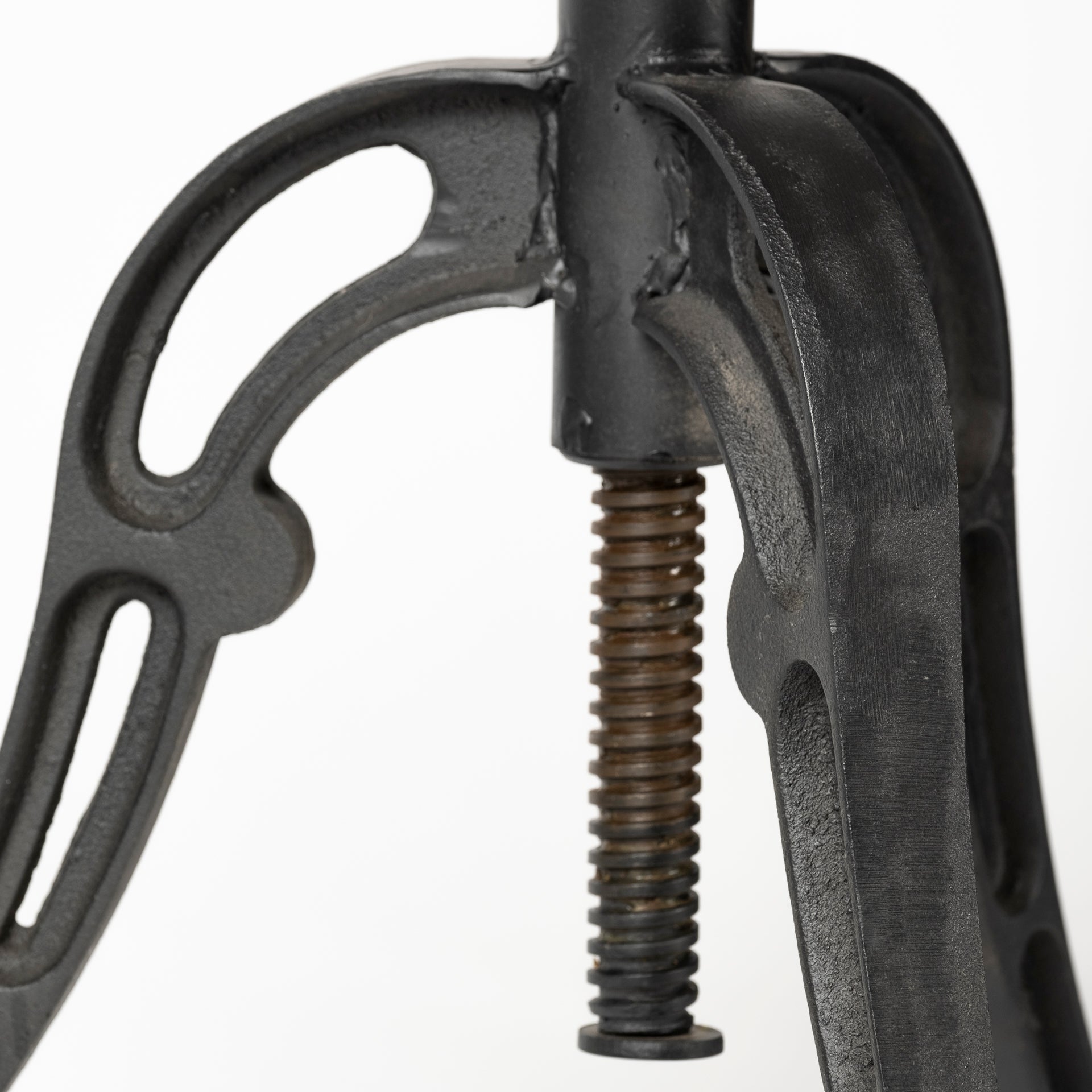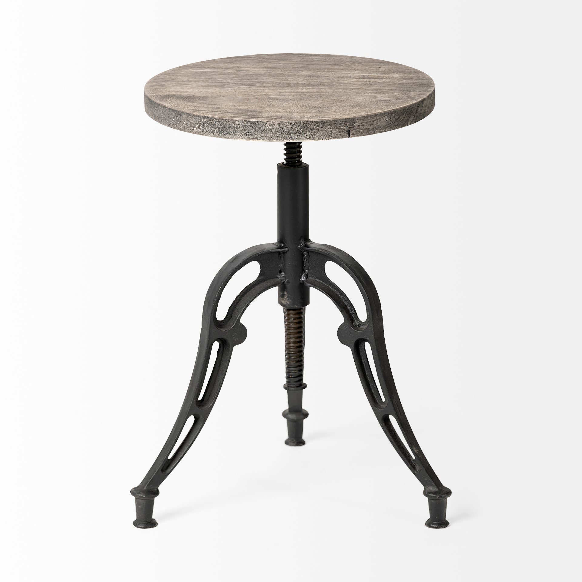 Featuring a round seat braced by a three-legged, industrial-inspired iron base that is equipped with a crankshaft, the Emslie I is truly unique in terms of design, blending unexpected materials and colors to elevate your space.