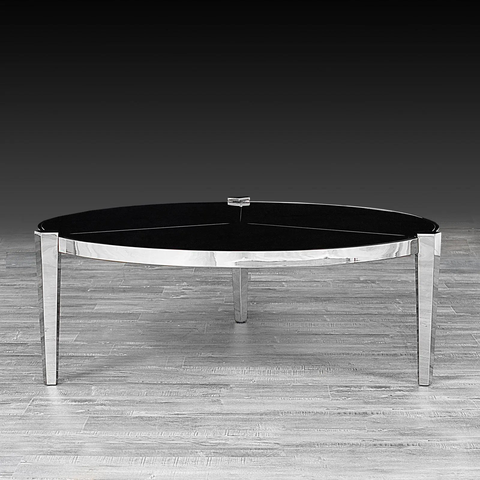 Enzo Luxury Twin Round Coffee Table by Roberto Grassie has a 12mm tempered black glass top and a silver polished stainless-steel base.