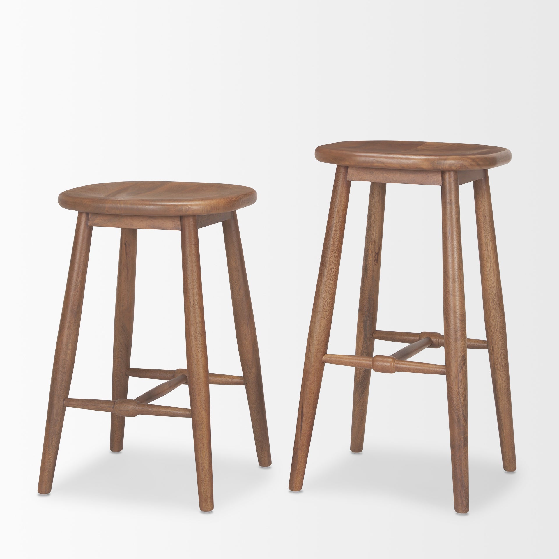 Ernest Bar Stool is made of smooth, medium brown mango wood with tapered spindle-style legs.