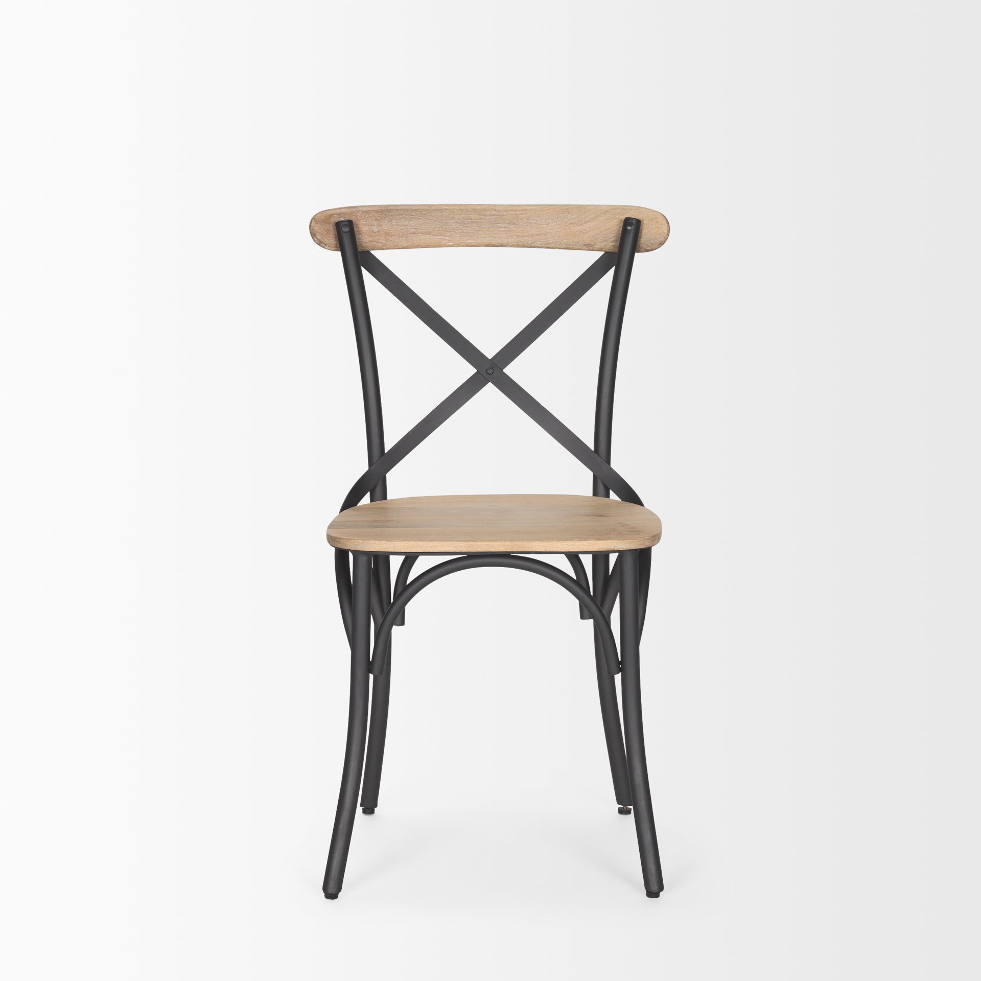 The Etienne Dining Chair is crafted out of wood and finished in a smooth, light brown and has an iron metal crisscross backrest.