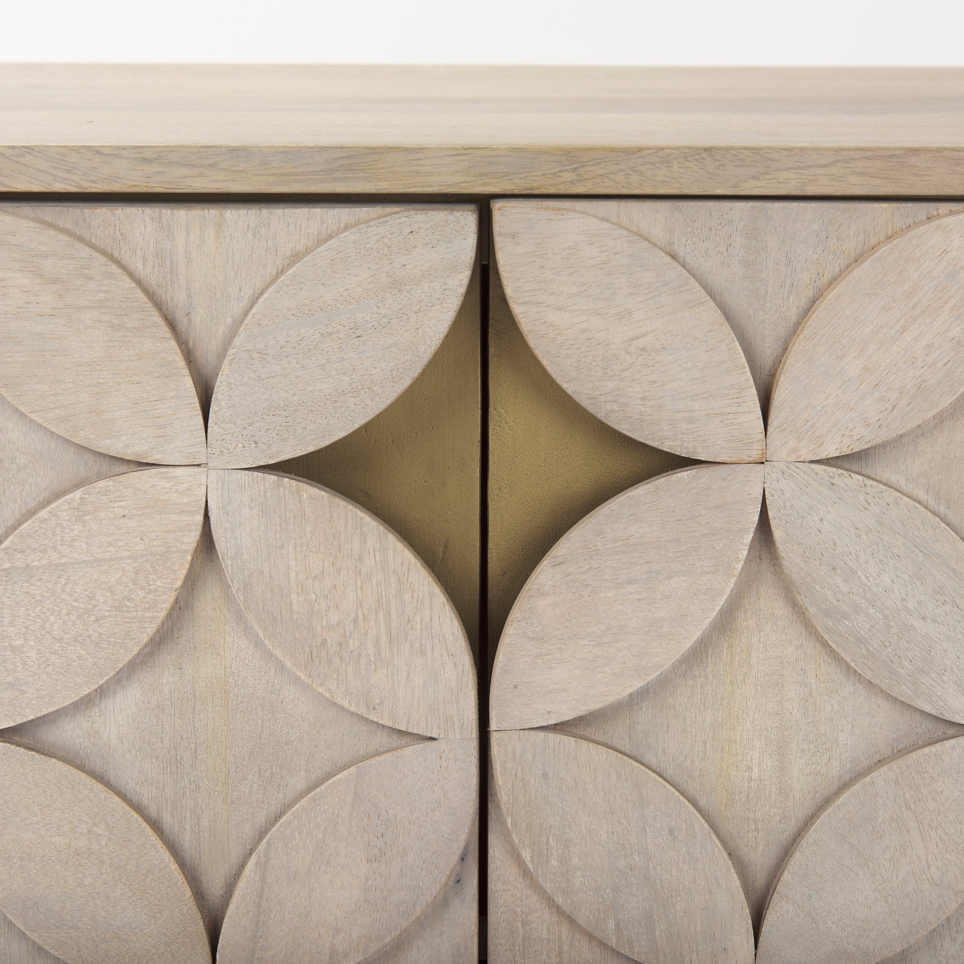 A real showstopper of an accent cabinet that will suit the luxe and contemporary aesthetic. This cabinet is glamorous with a star-in-circle, raised pattern and durably crafted out of golden mango wood