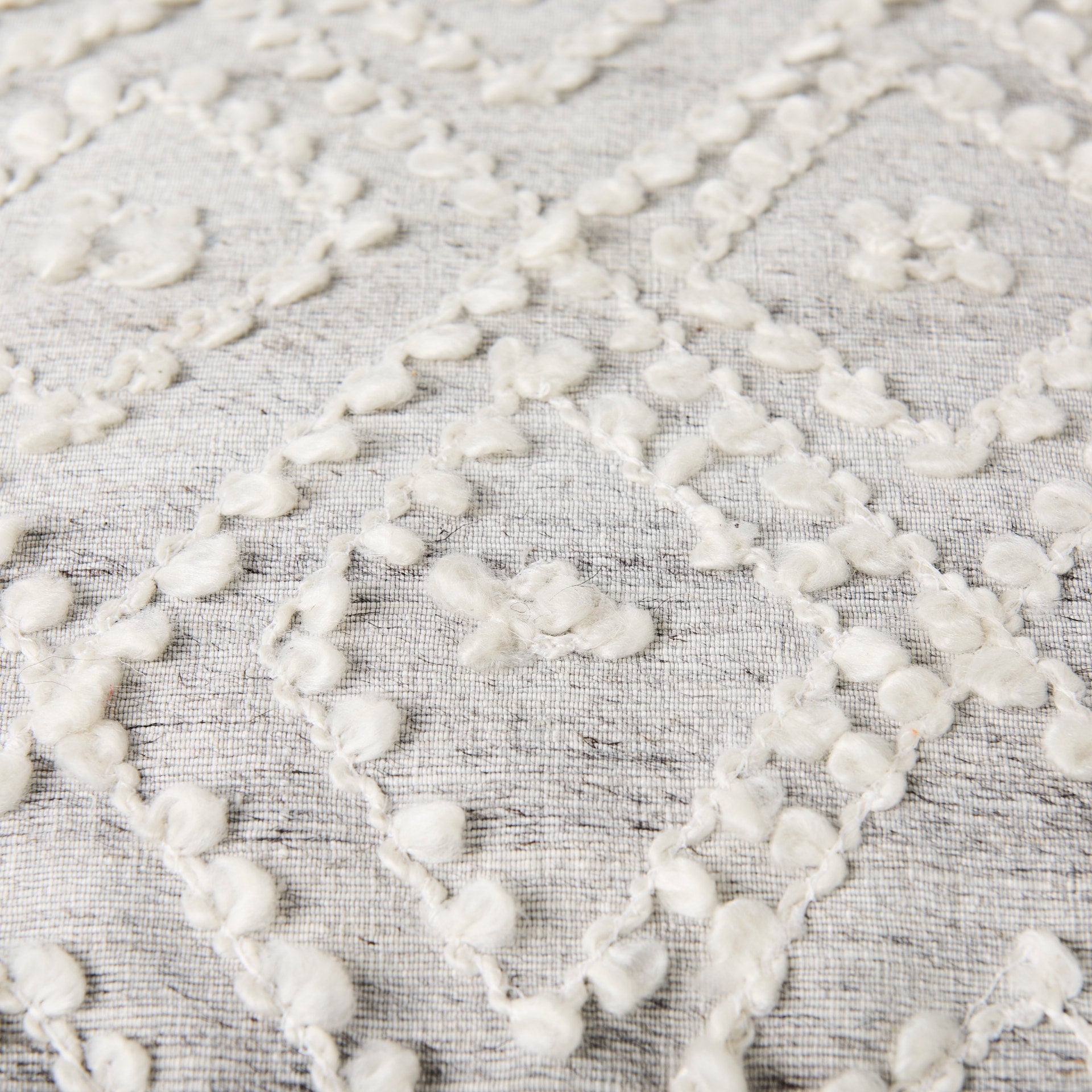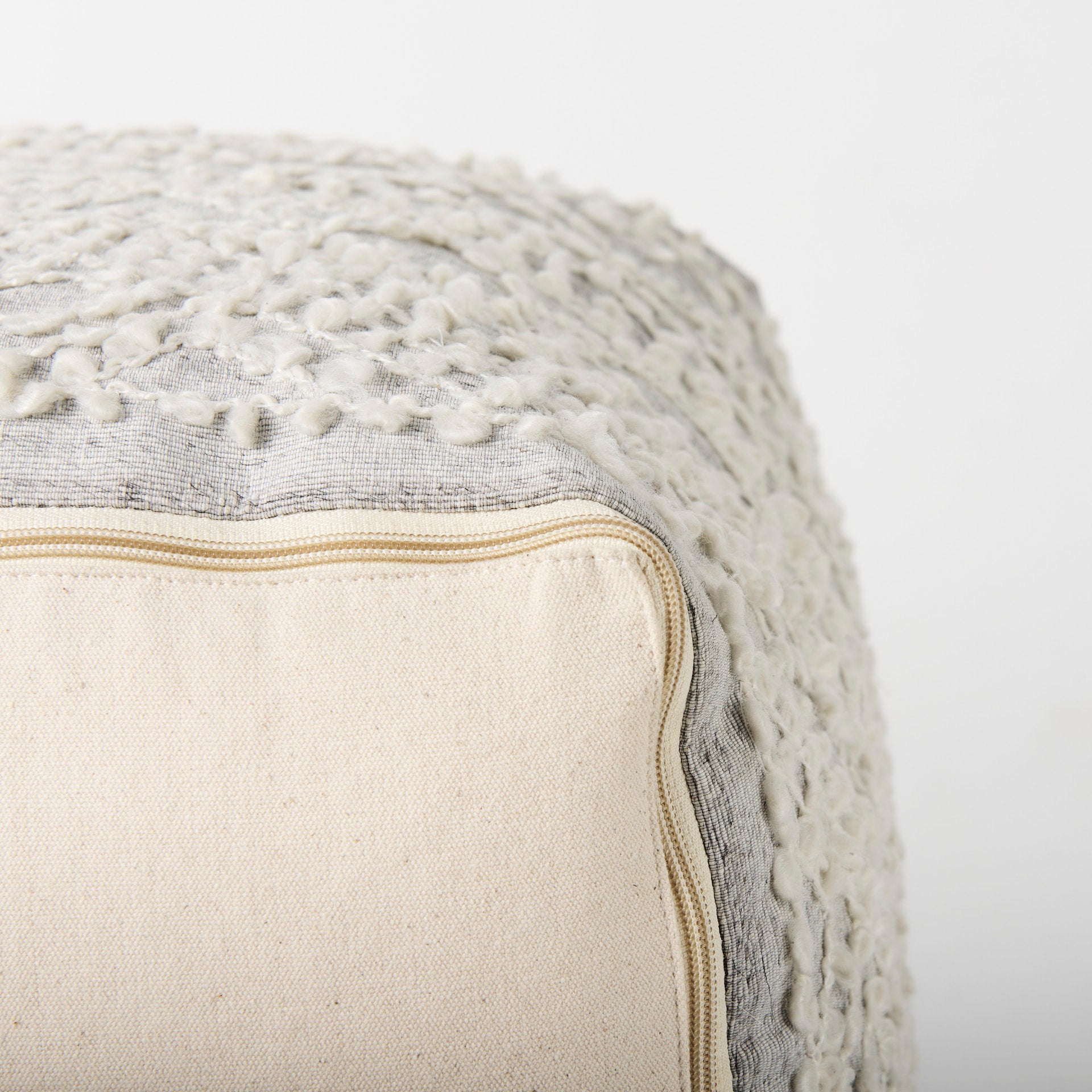 Farida is a light gray pouf, carefully constructed from a blend of wool and polyester.
