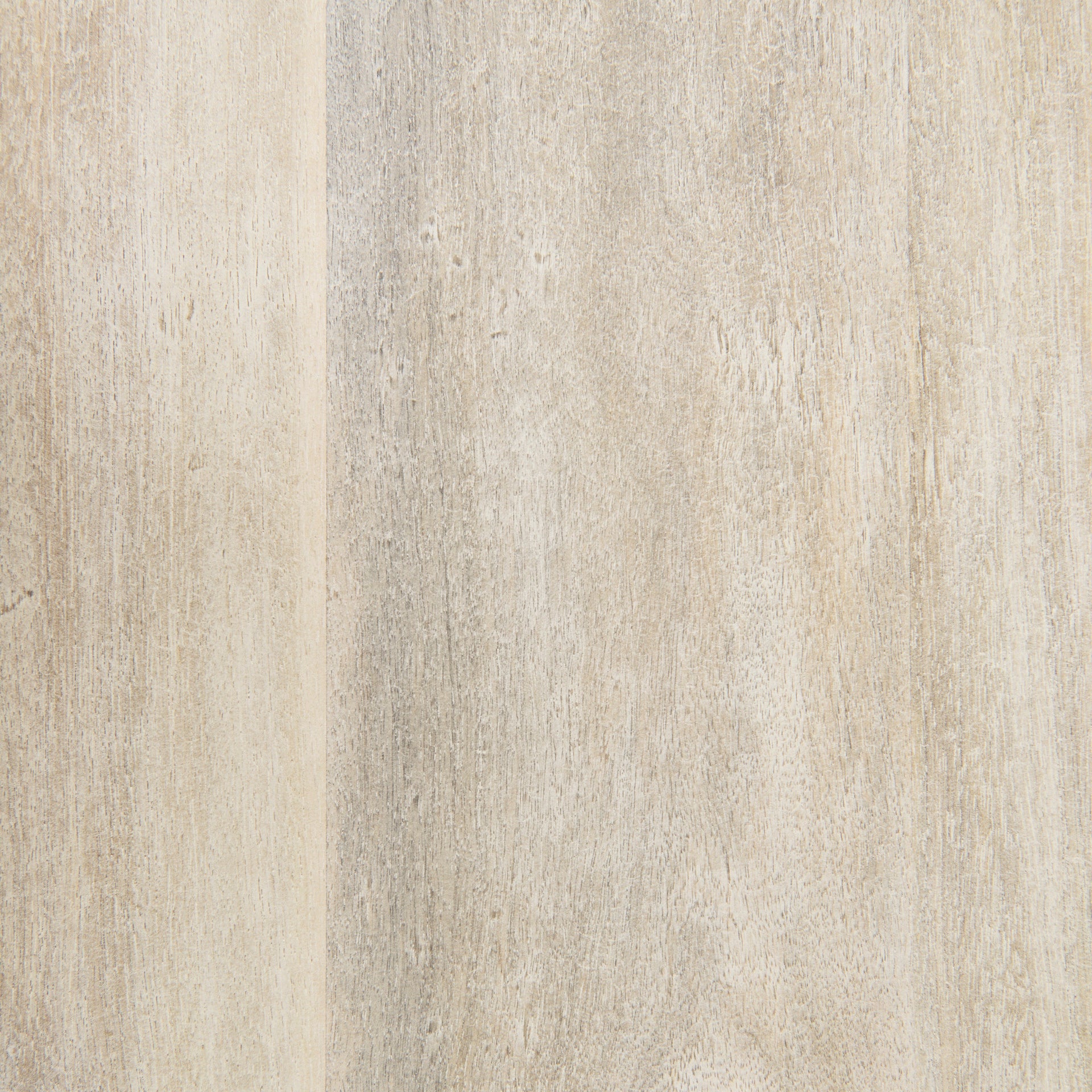 The beige wood is smooth textured with a washed finish that lets its gray undertones and natural character show through. The iron base features a subtle, antique gold finish.Β