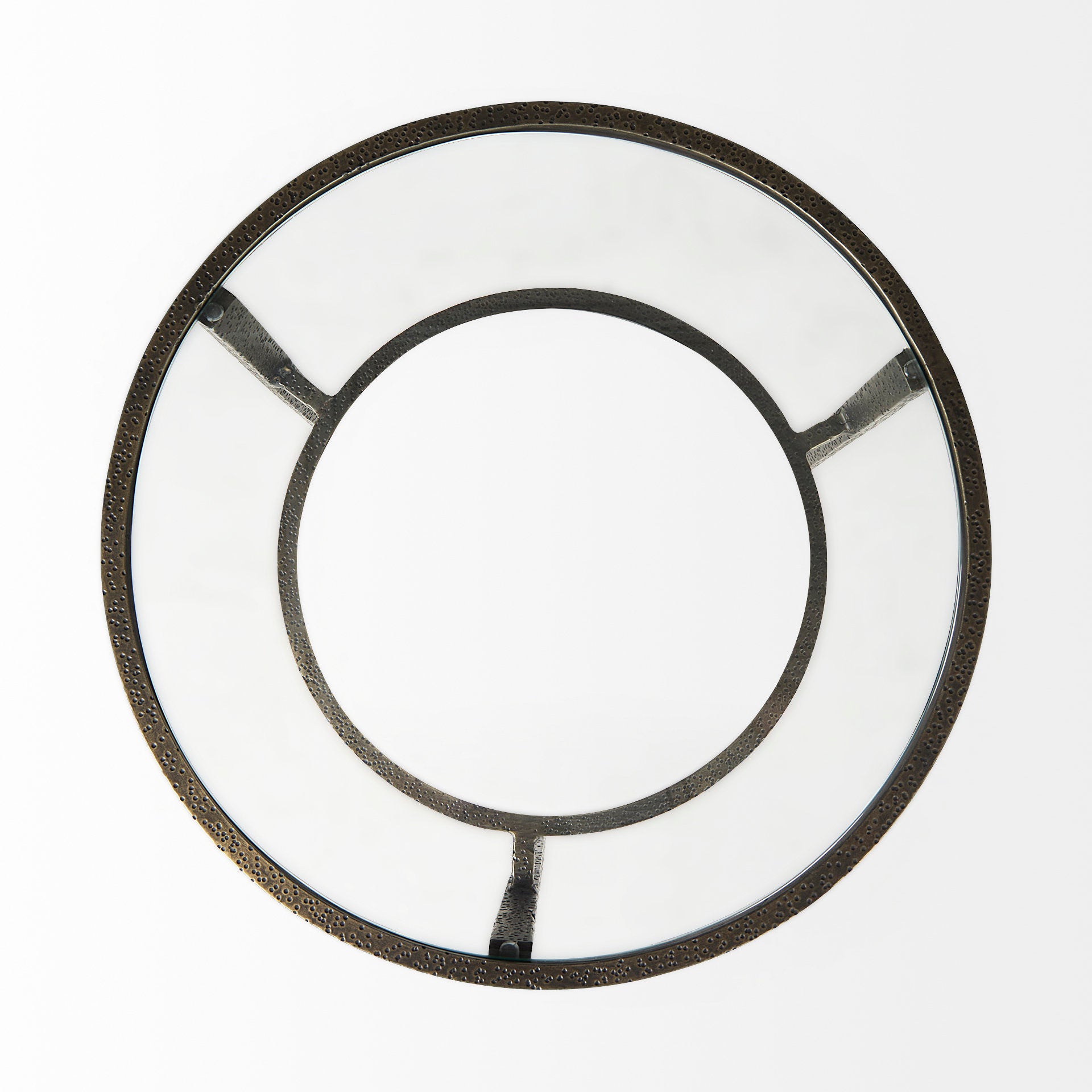 The Felicity has metal framing that is finished in a beautiful antique gold color, and features small ridge patterns that speak to its classic look and feel. Creamy white marble with grey veining through it acts as an additional surface space at the base of the table, while the glass top allows for an airy look and feel.Β