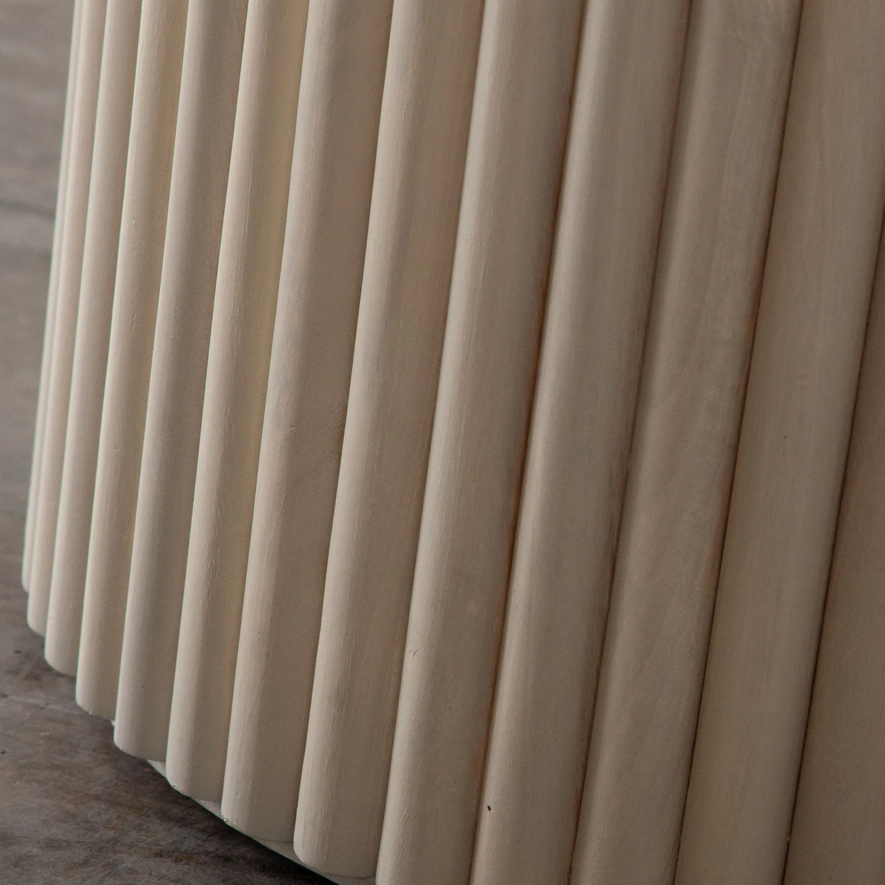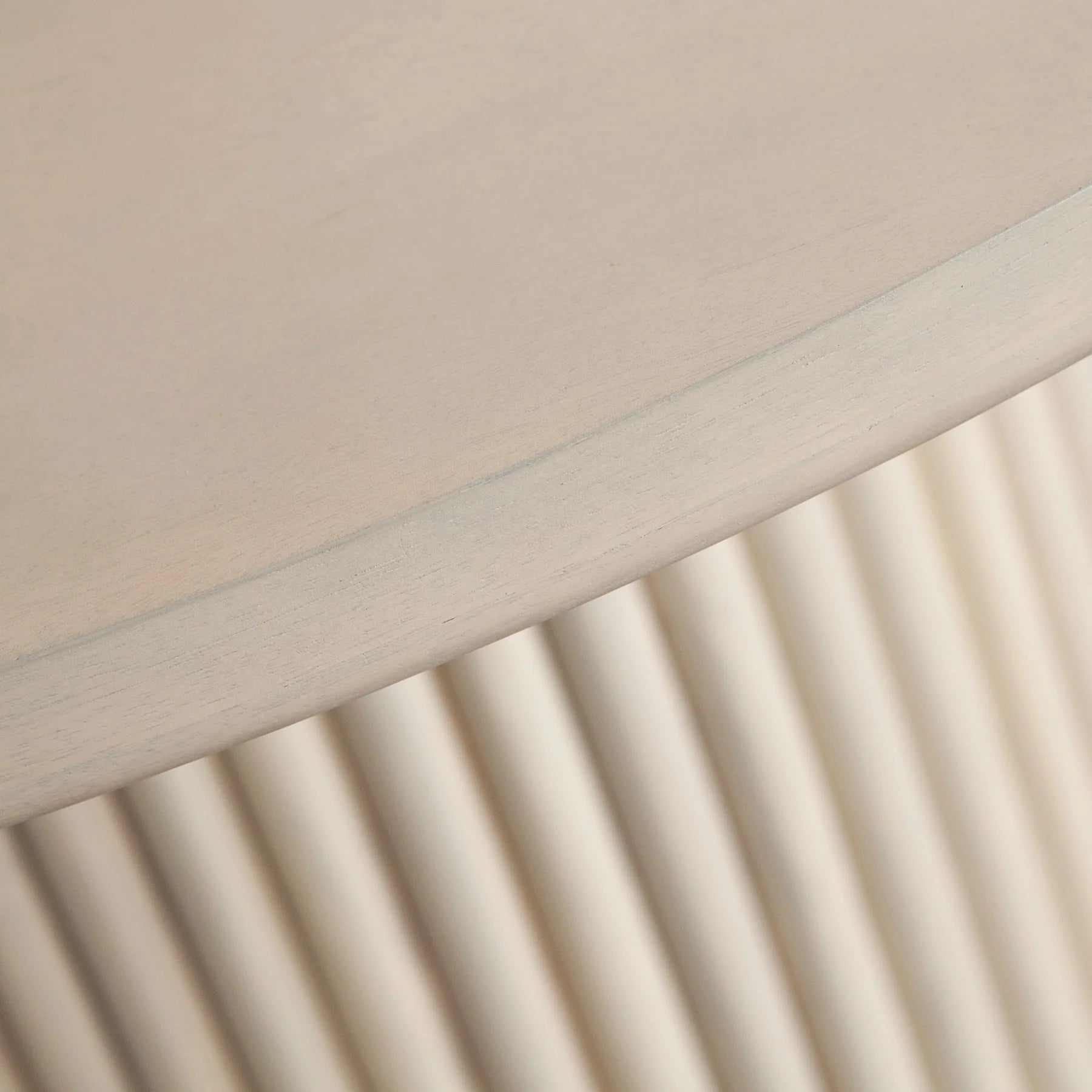 Though simple in silhouette, this table stands out with its intricately hand-carved, fluted pedestal base. The smooth Mango wood top features a soft Greige finish that complements a variety of interior styles and color palettes.