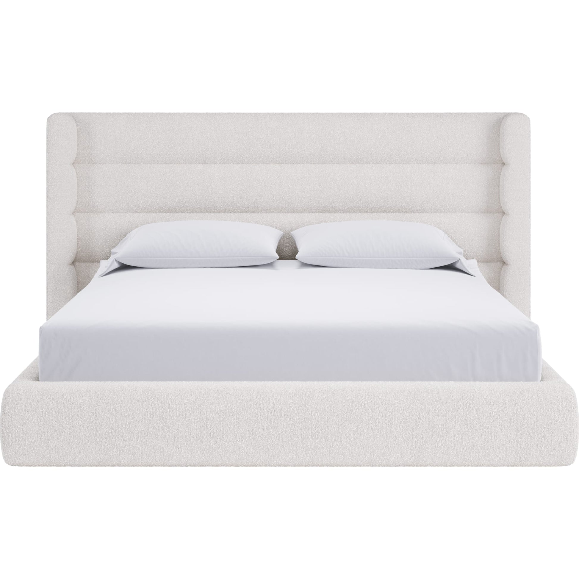 With continuous channeling from wing to wing, radiused edges and a low slung platform frame, this bed is soft modernism defined. Covered in a versatile off-white boucle, it pairs effortlessly with colors and wood tones.