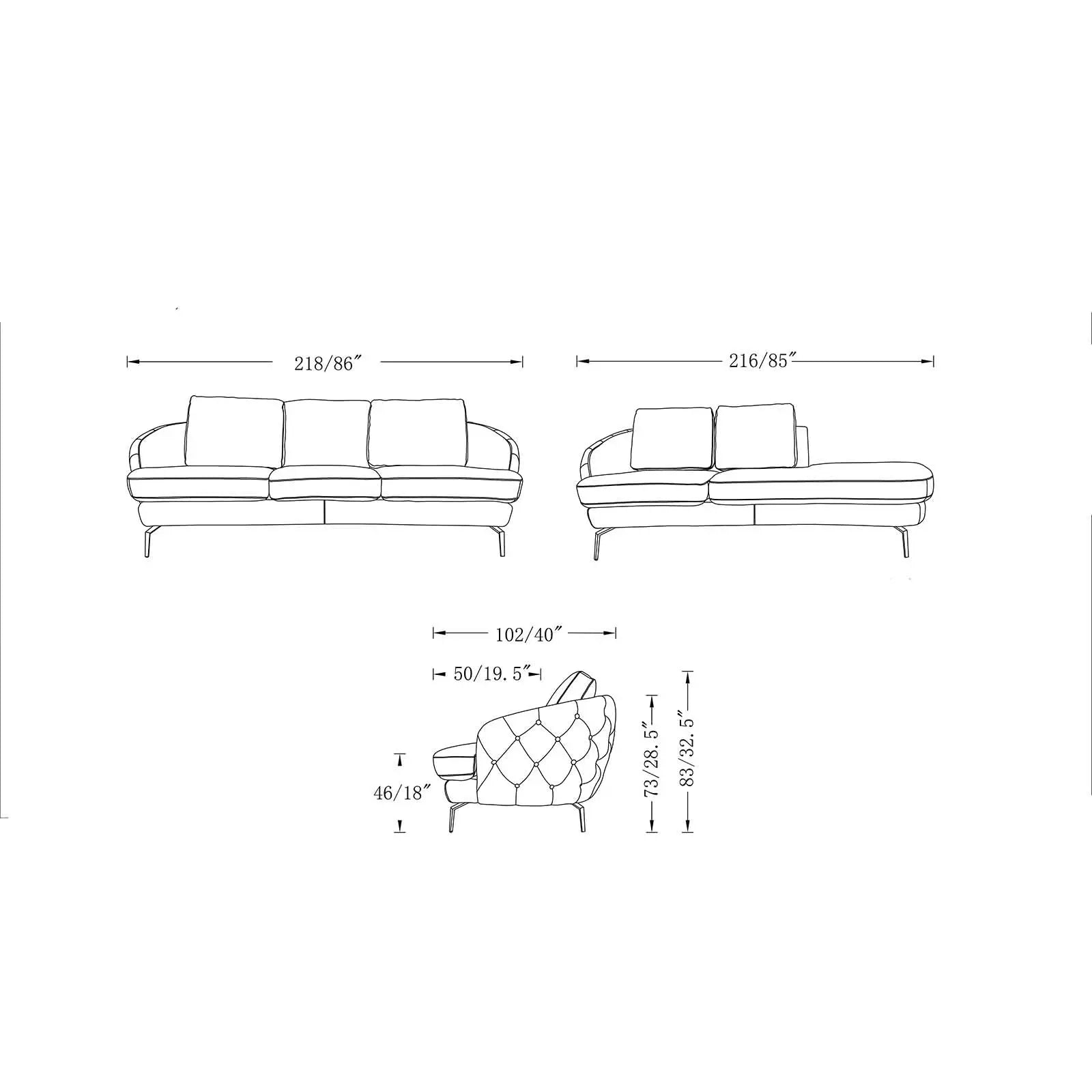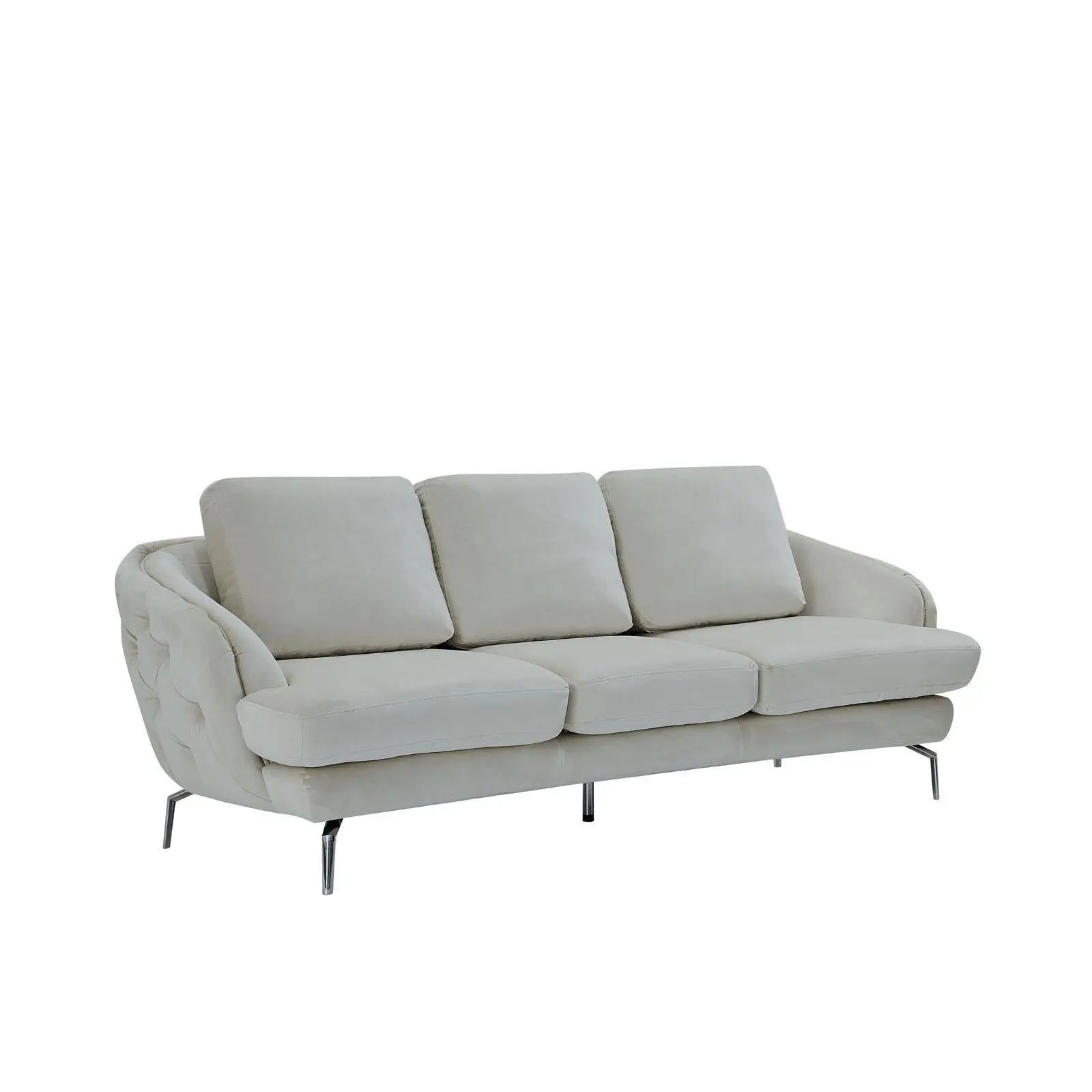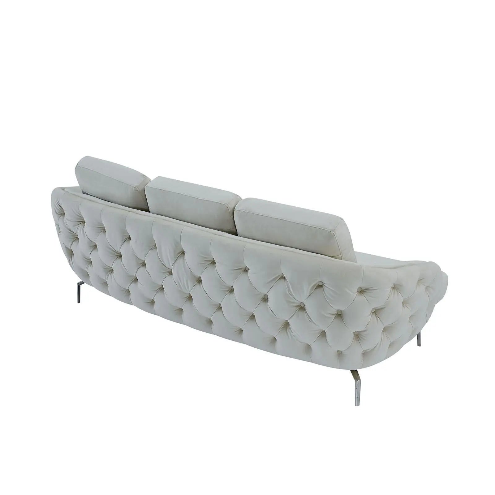 Guilia Sofa set features a sofa loveseat and a chaise, it is upholstered in a velvet fabric and features an elegant, tufted back with polished stainless-steel legs. Features a compact arm detail and it is perfect for smaller spaces.