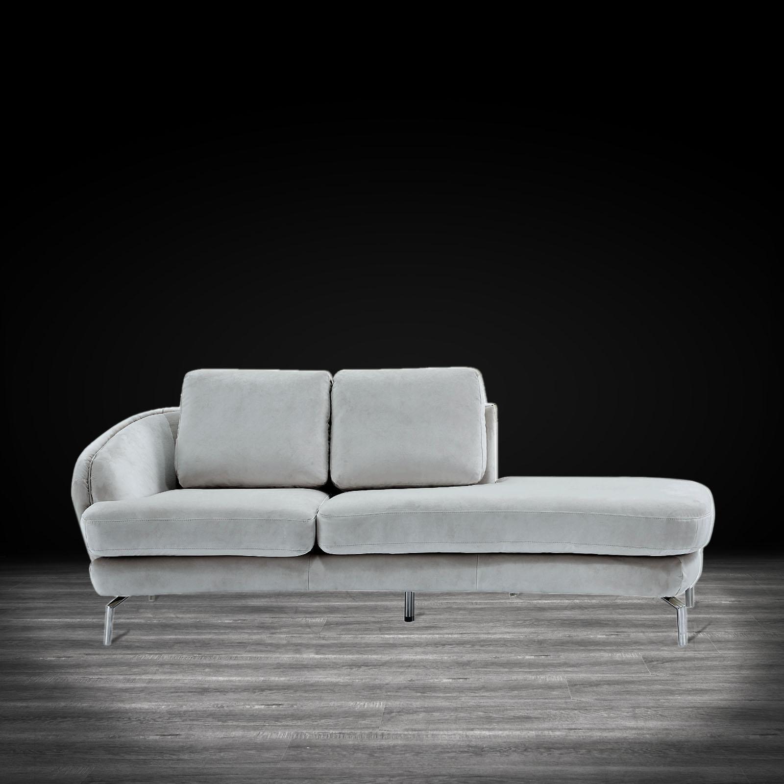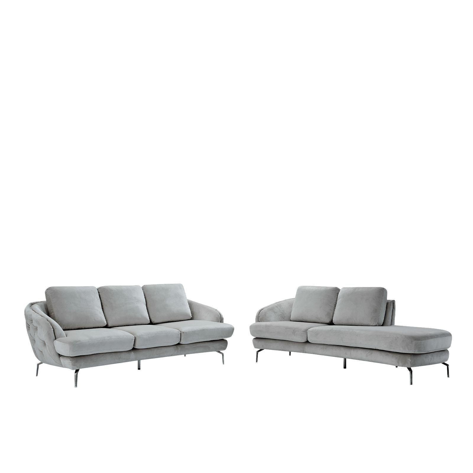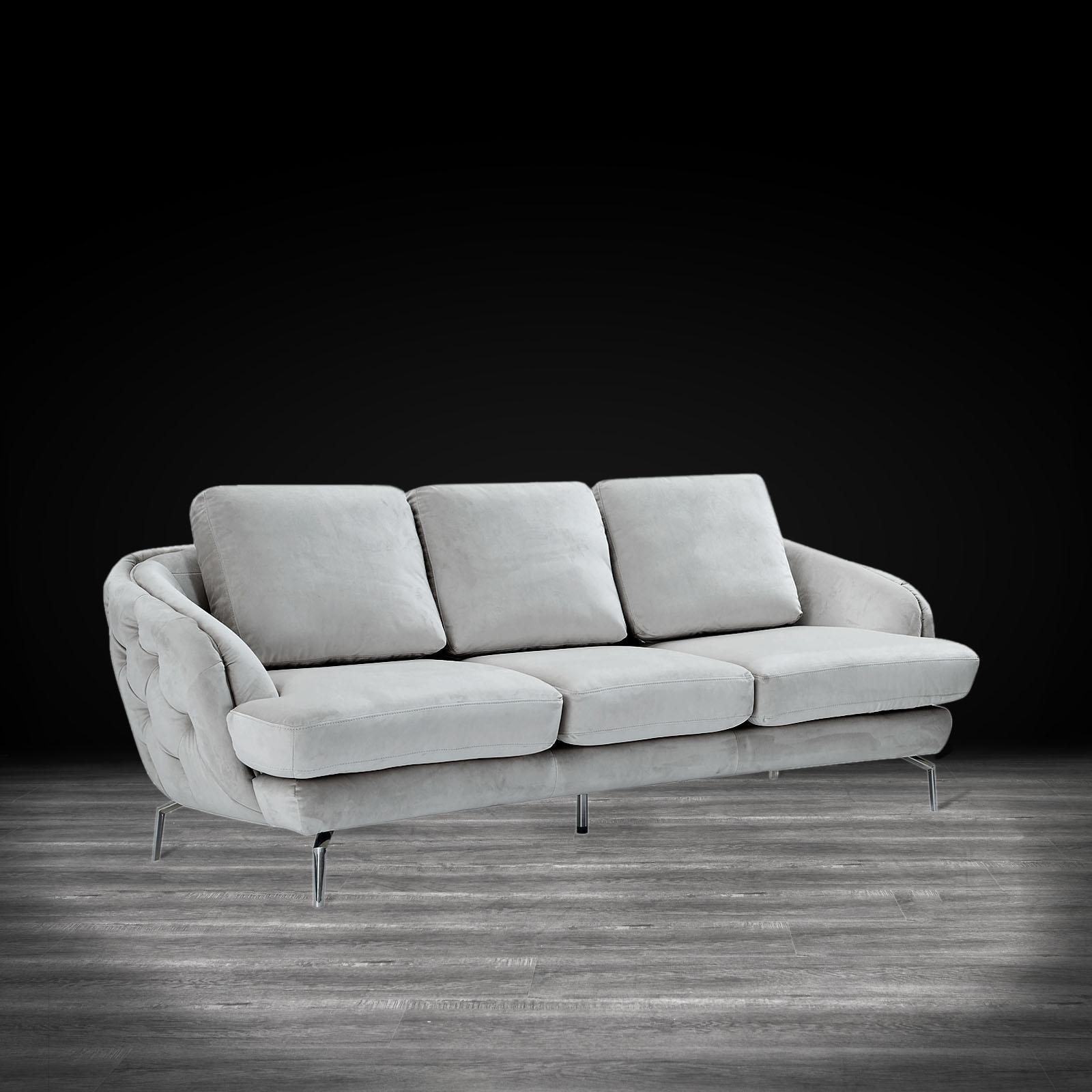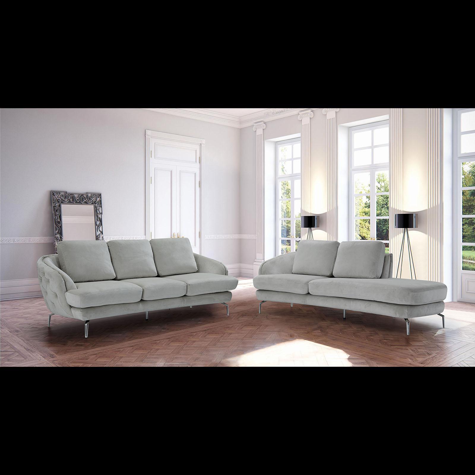 Guilia Sofa set features a sofa loveseat and a chaise, it is upholstered in a velvet fabric and features an elegant, tufted back with polished stainless-steel legs. Features a compact arm detail and it is perfect for smaller spaces.