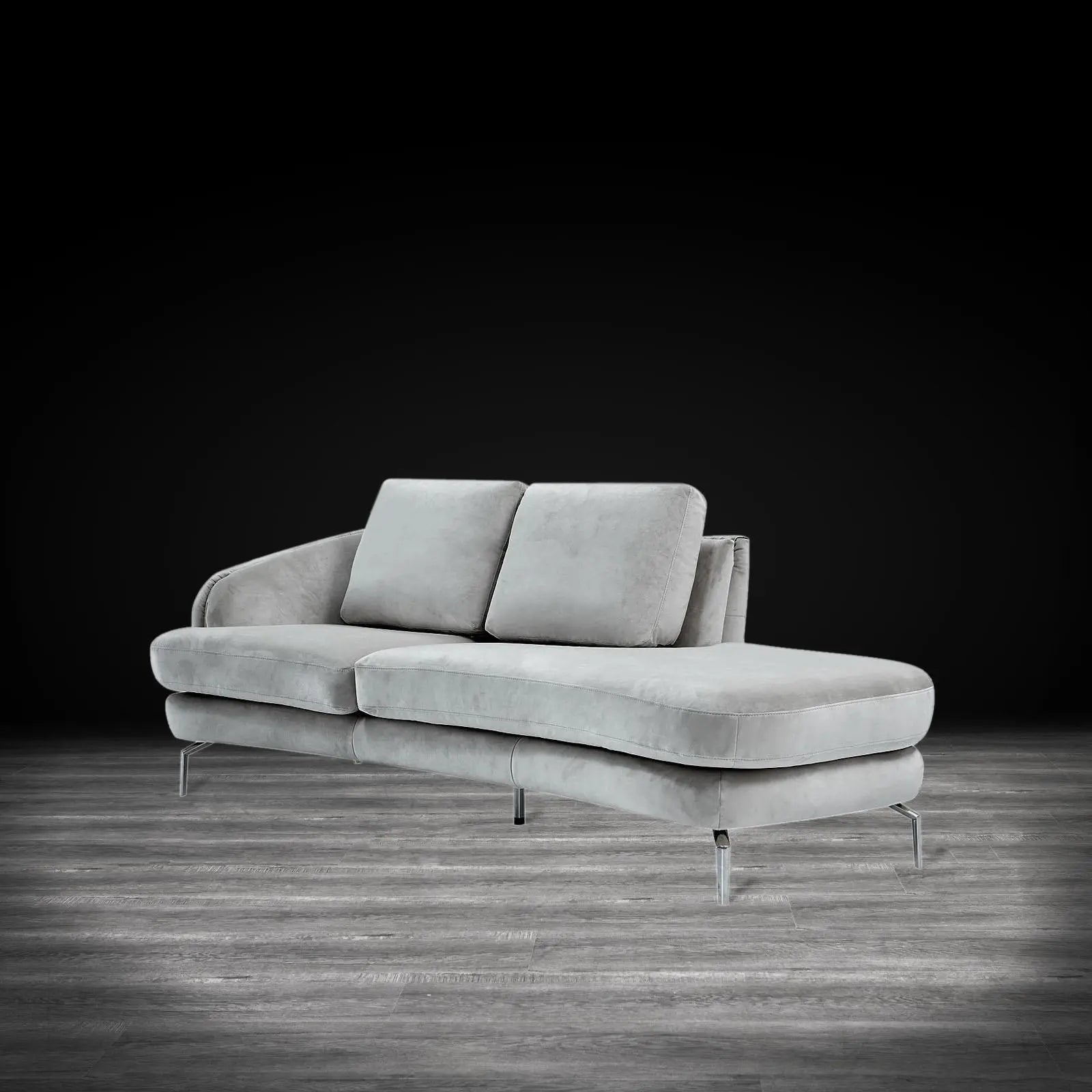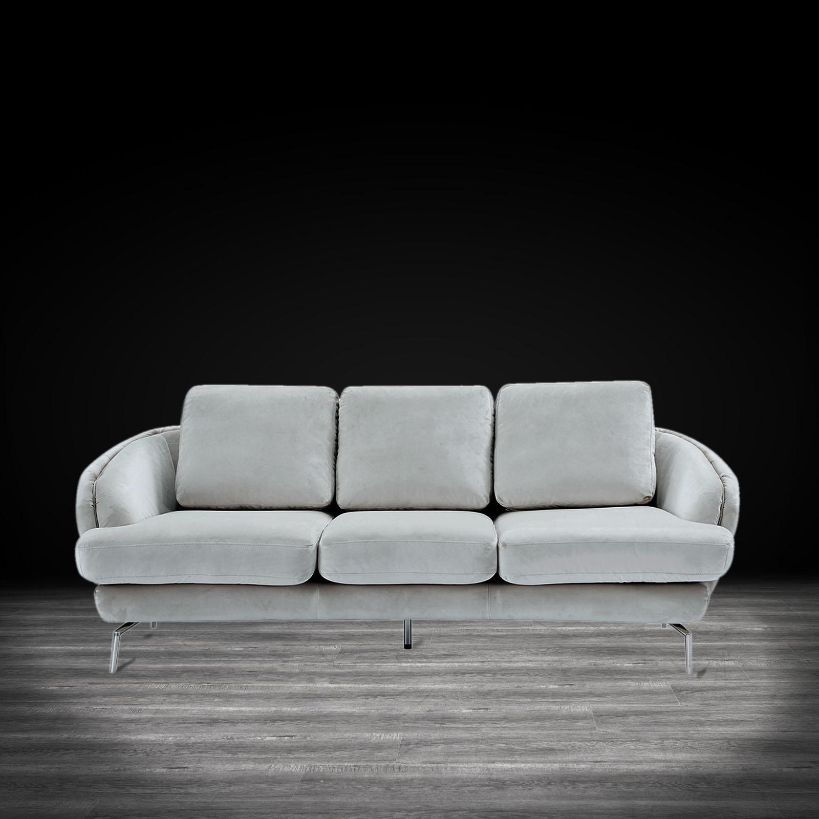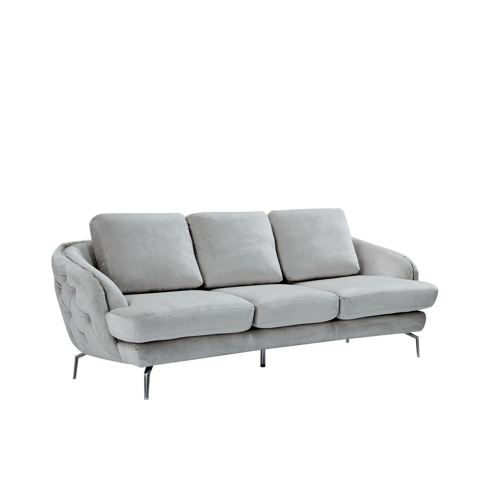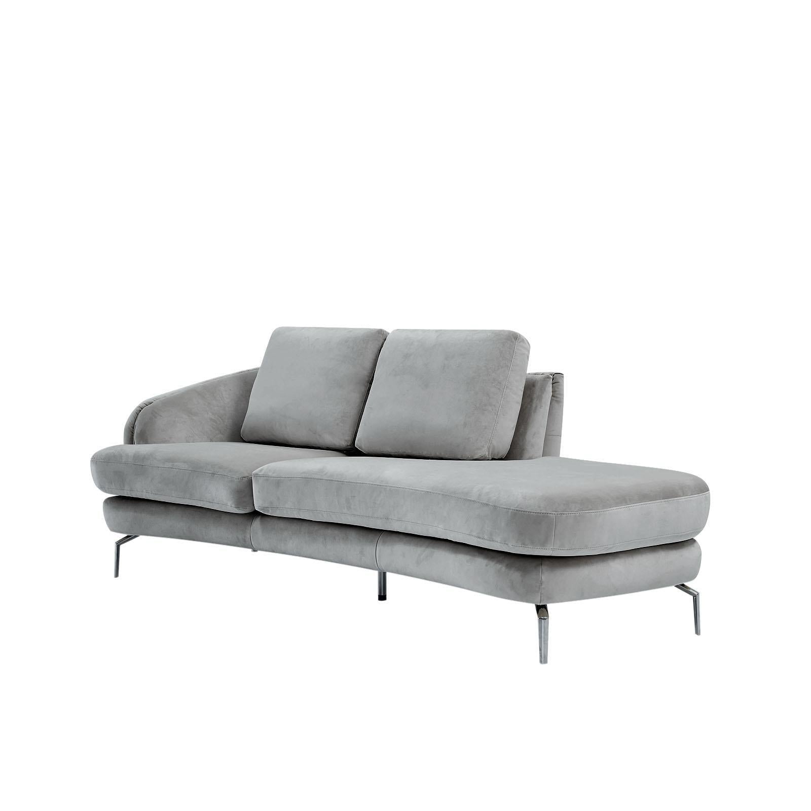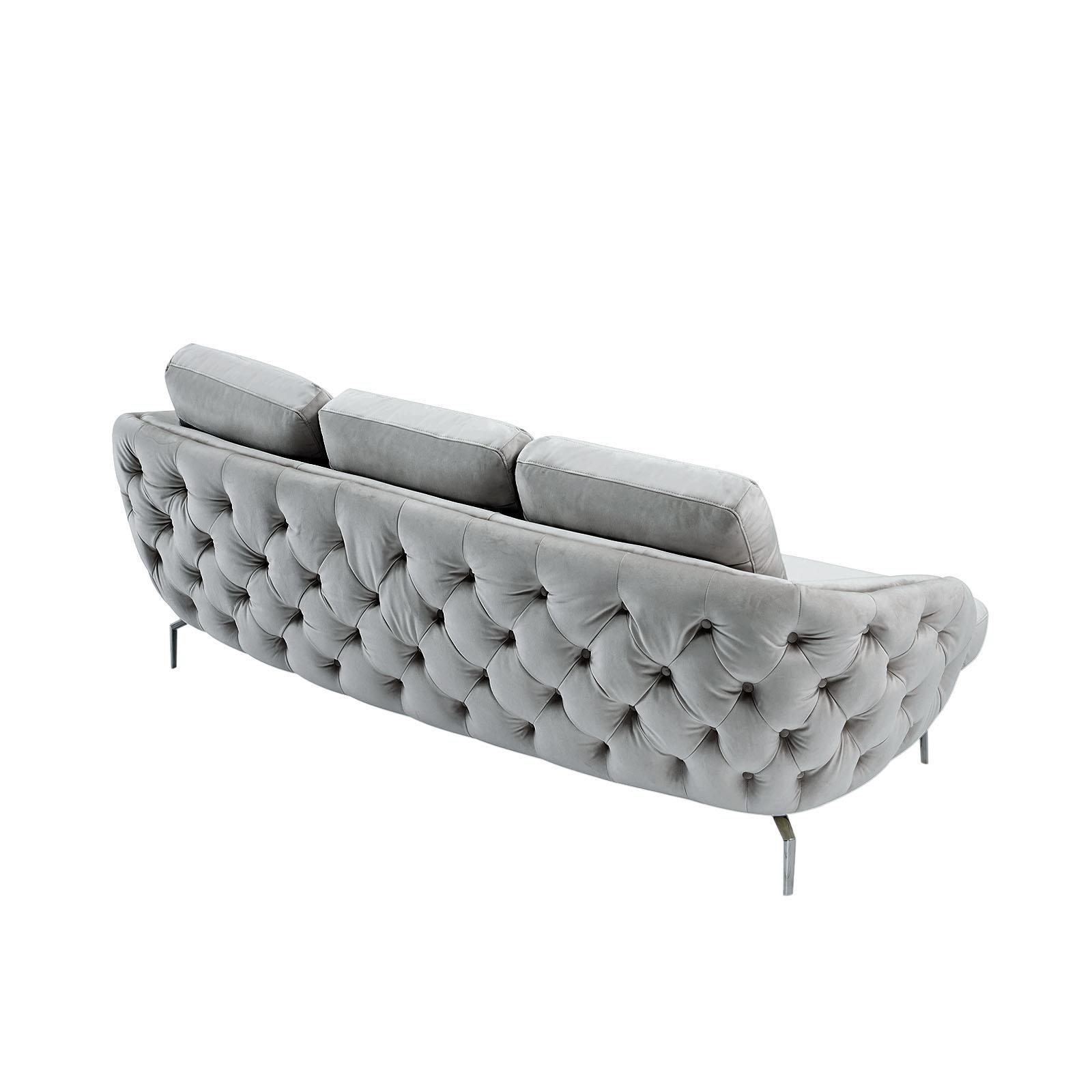 Guilia Sofa set features a sofa loveseat and a chaise, it is upholstered in a velvet fabric and features an elegant, tufted back with polished stainless-steel legs. Features a compact arm detail and it is perfect for smaller spaces.