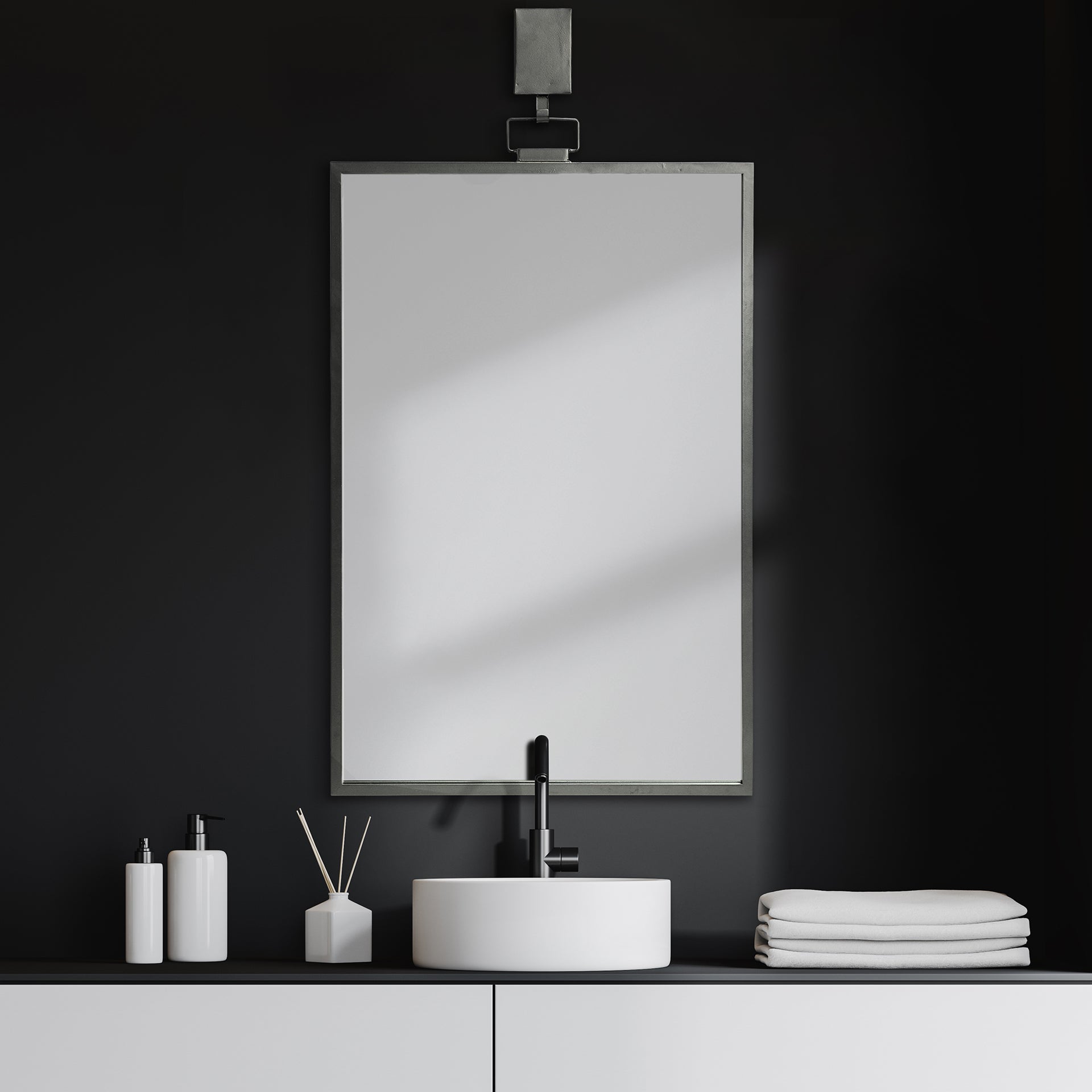 The Grimm is a classy, wall-mounted mirror that can be hung from a solid metal block equipped with a hook.