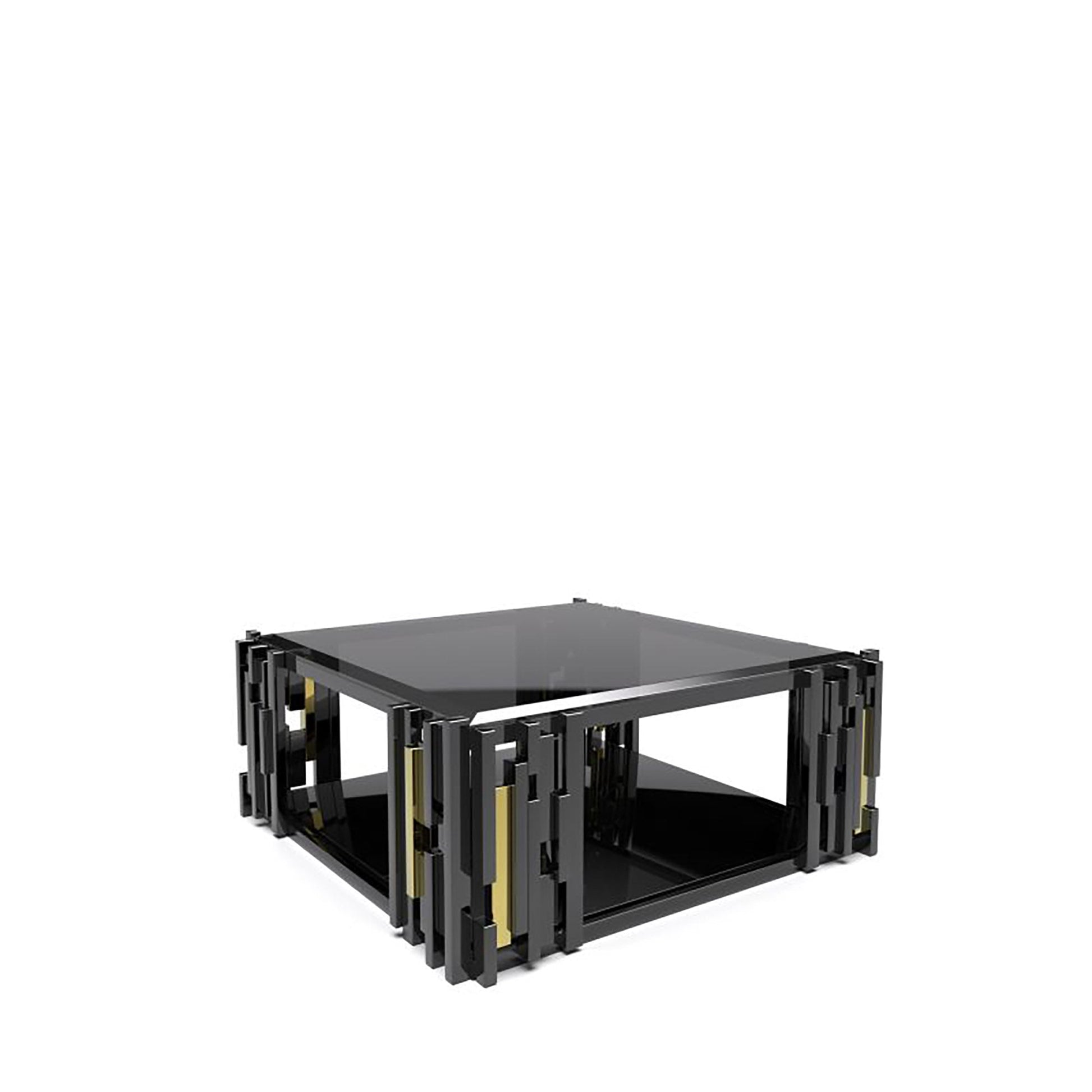 Illusion square coffee table with an astonishing titanium gold stainless-steel frame. The top has a mirrored glass which exposes the eye-opening contemporary design of the Illusion set. The black bottom glass fulfills all the attention to detail needed for this wonderful piece.