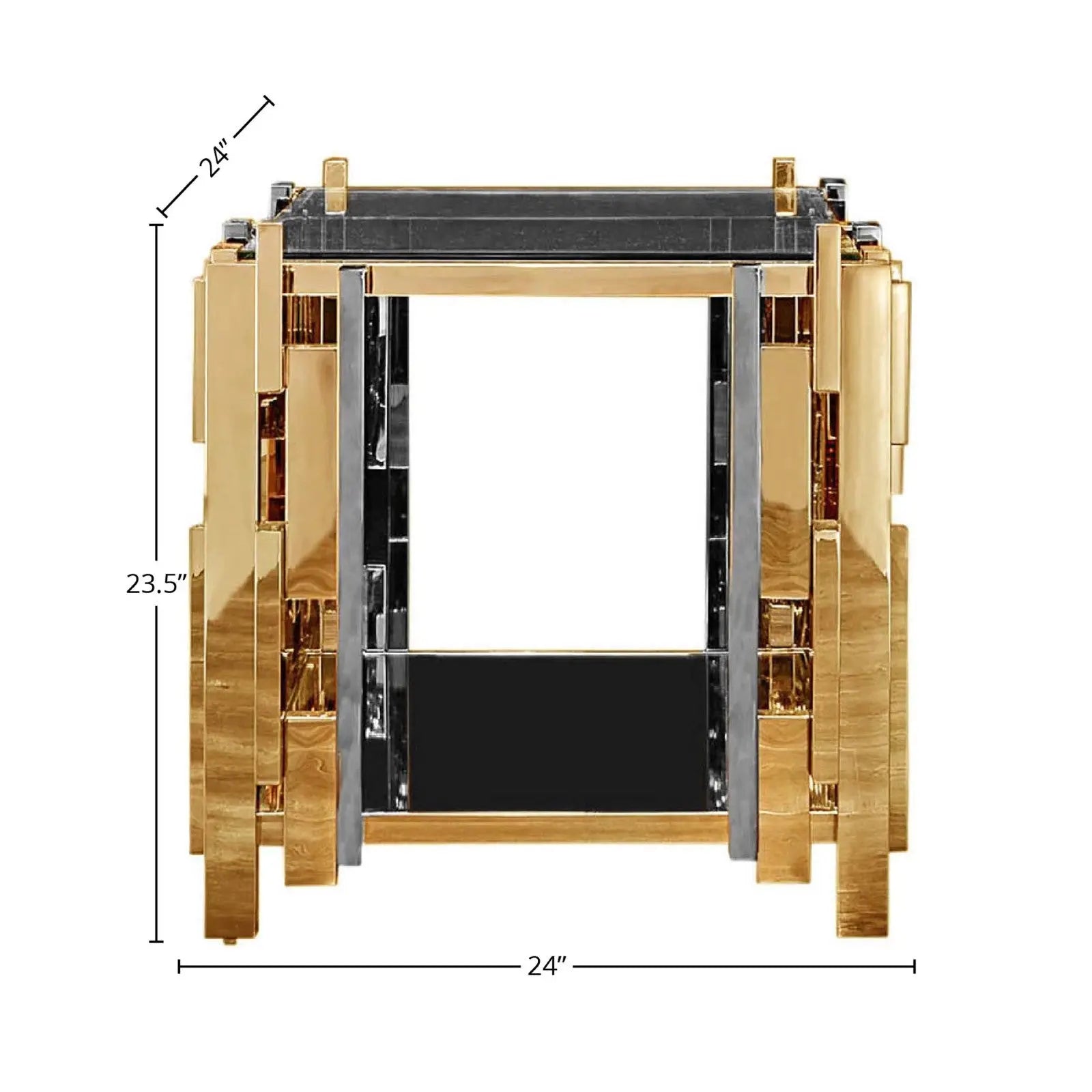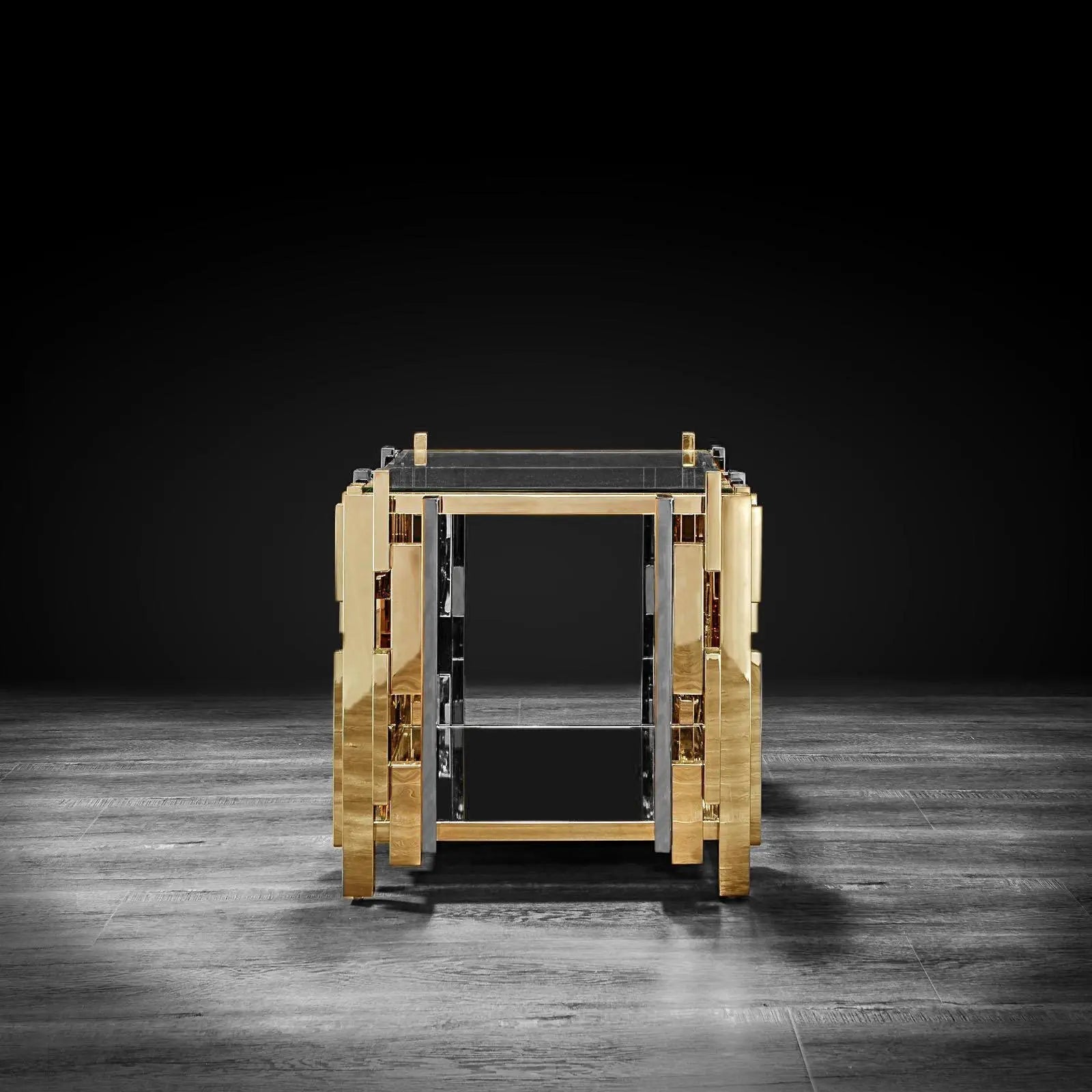 The illusion square end table with a robust titanium-gold polished stainless-steel structure. This contemporary piece can hold your drink and snacks on its mirrored glass top which exposes the eye-opening contemporary design of the Illusion set. The main gold color is complimented with stunning silver touch in few parts of the design and the bottom black glass guarantees luxury for this wonderful piece.
