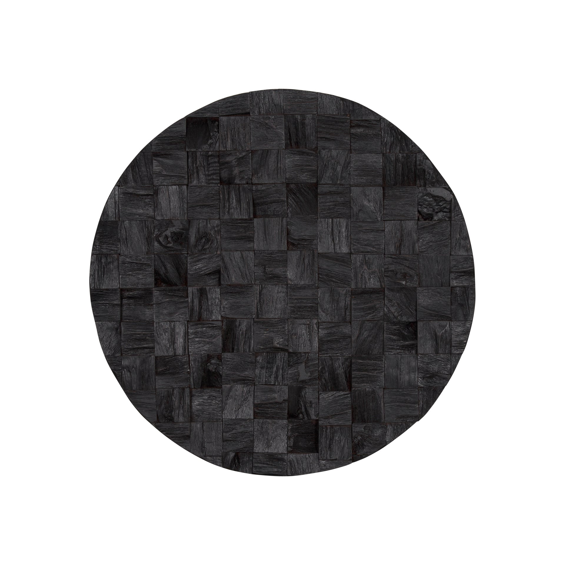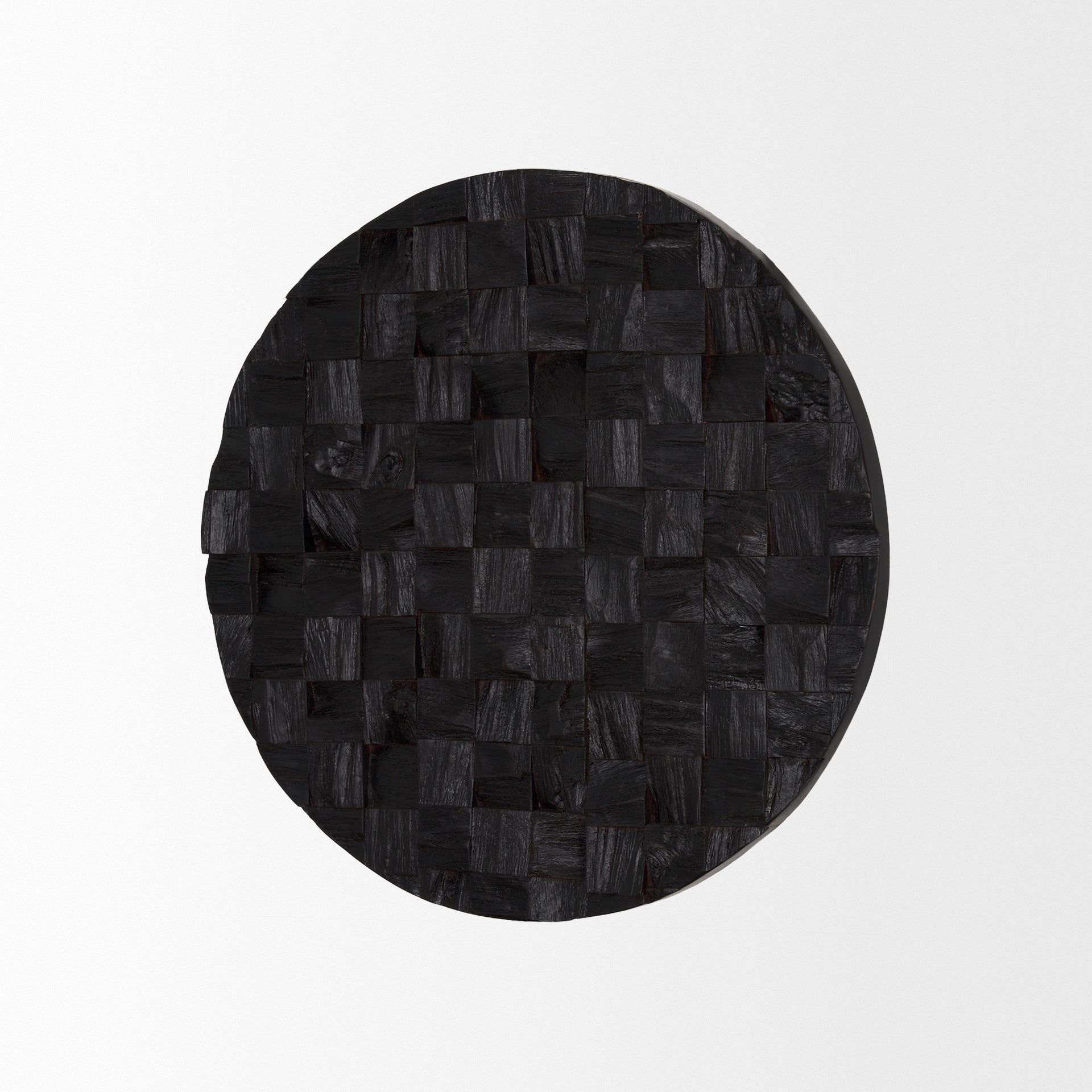 Into the Abyss is a dark brown circular textural piece of wall art that is comprised of solid, rough cut wood that flaunts deep set or raised square-shaped cuts.