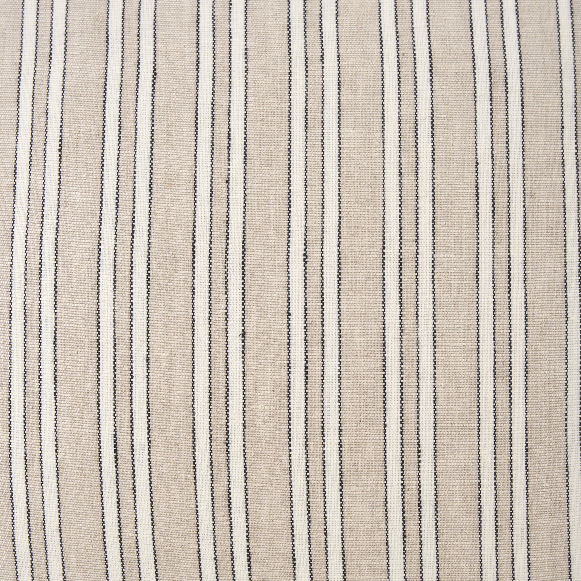 Jaxon is a woven beige cotton-linen decorative square pillow cover featuring wide cream and thin black striped patterning.