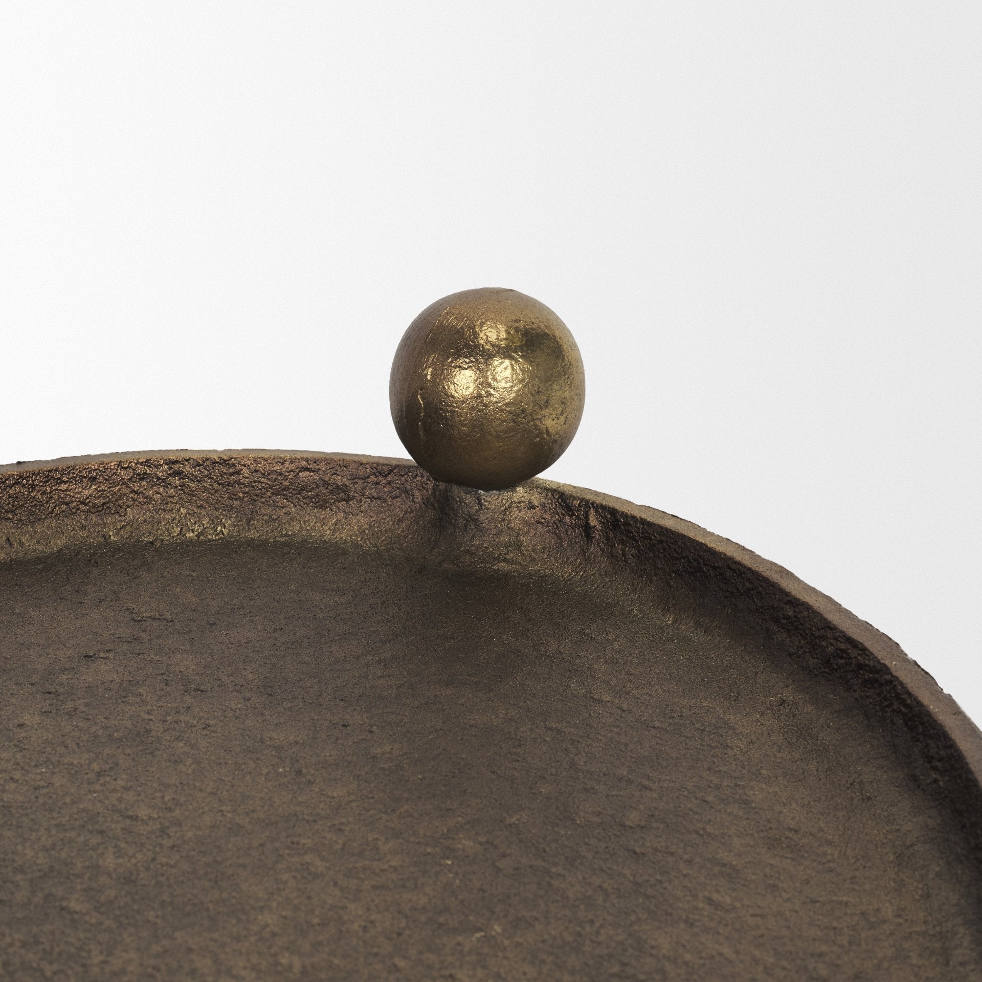 Cast aluminum with an antiqued gold finish and sandcast texture