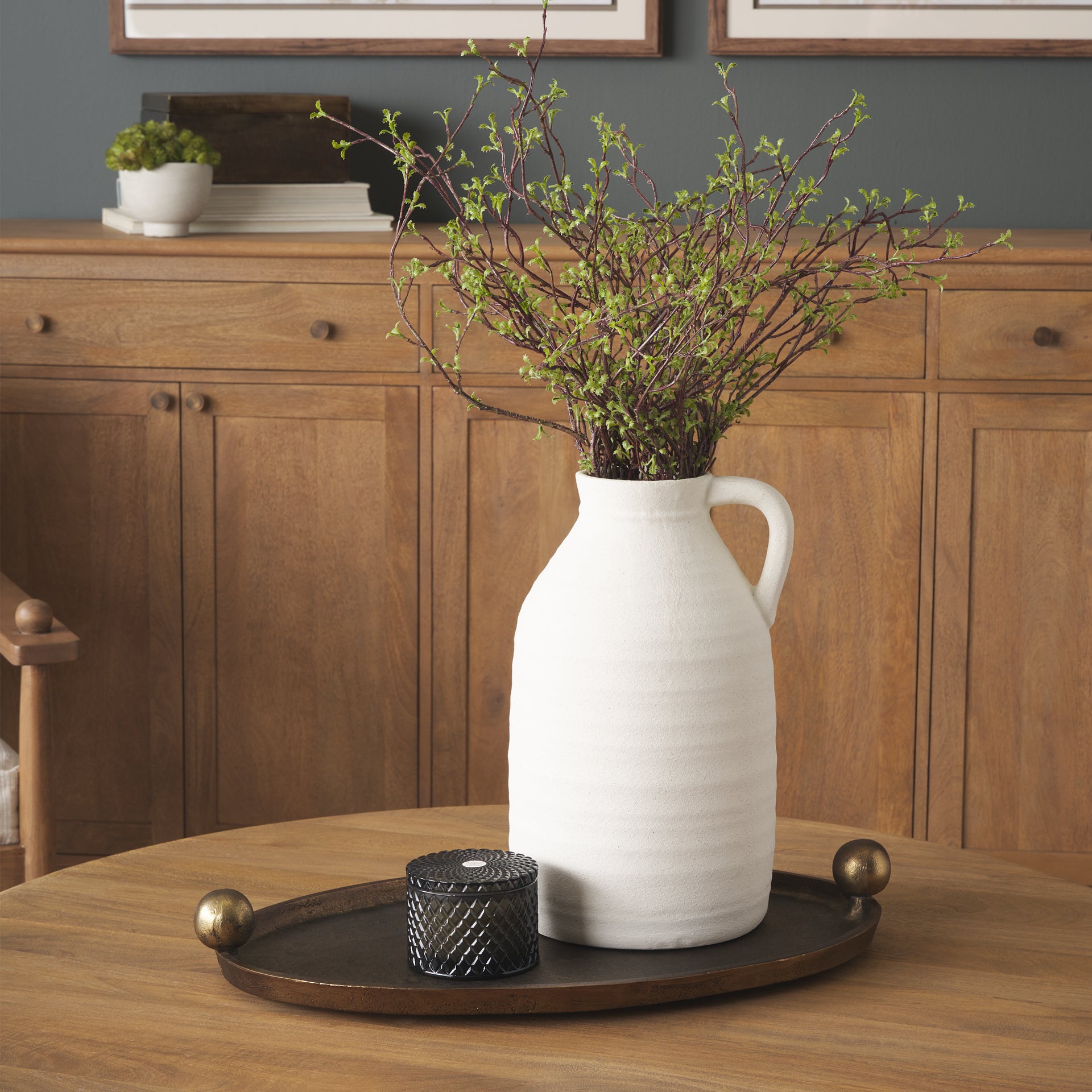 Jianna is an oval metal tray with a sandcast texture, finished in antiqued gold and detailed with a raised lip and integrated handles.