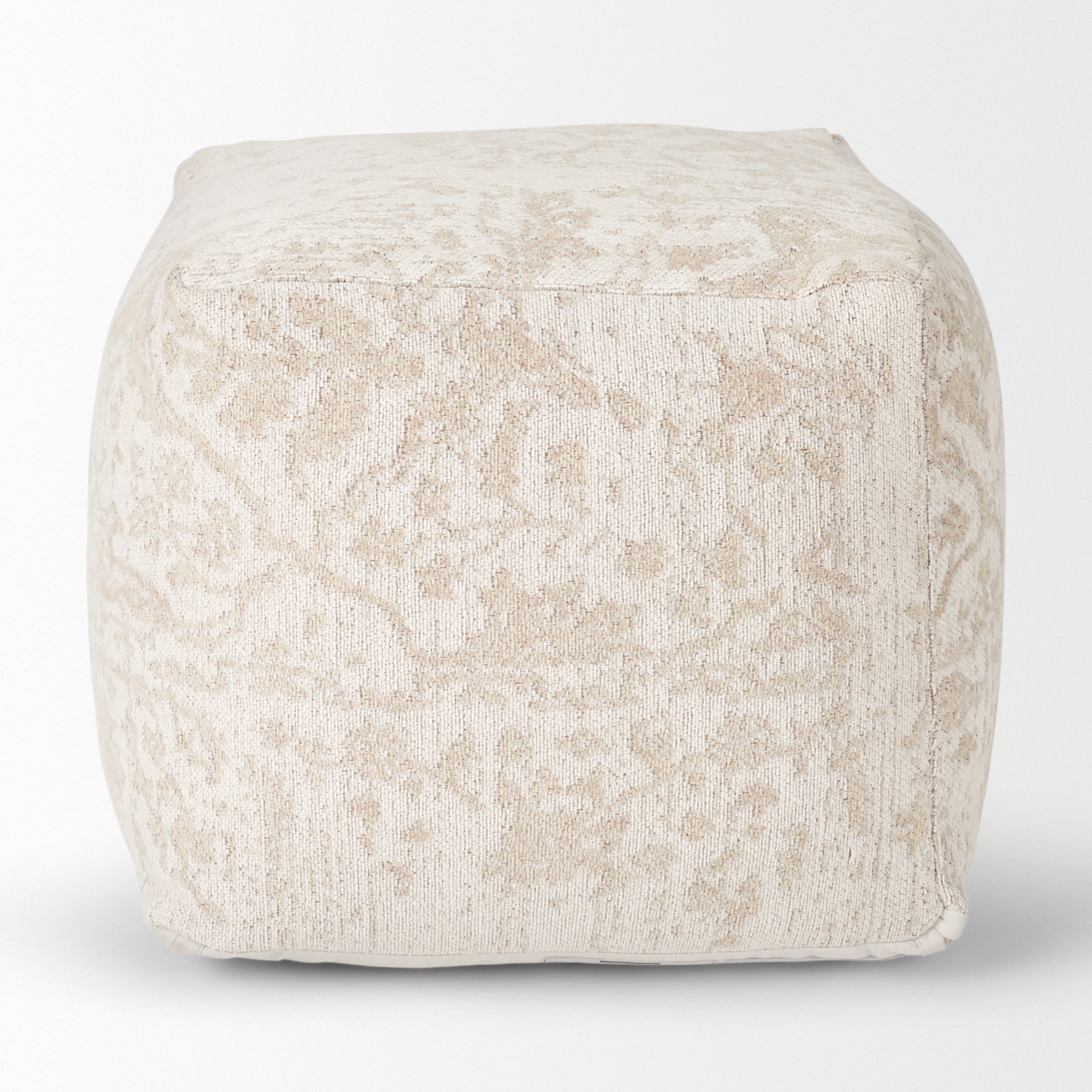 The Khloe Pouf is a rectangular, cream pouf made of jacquard woven cotton chenille.