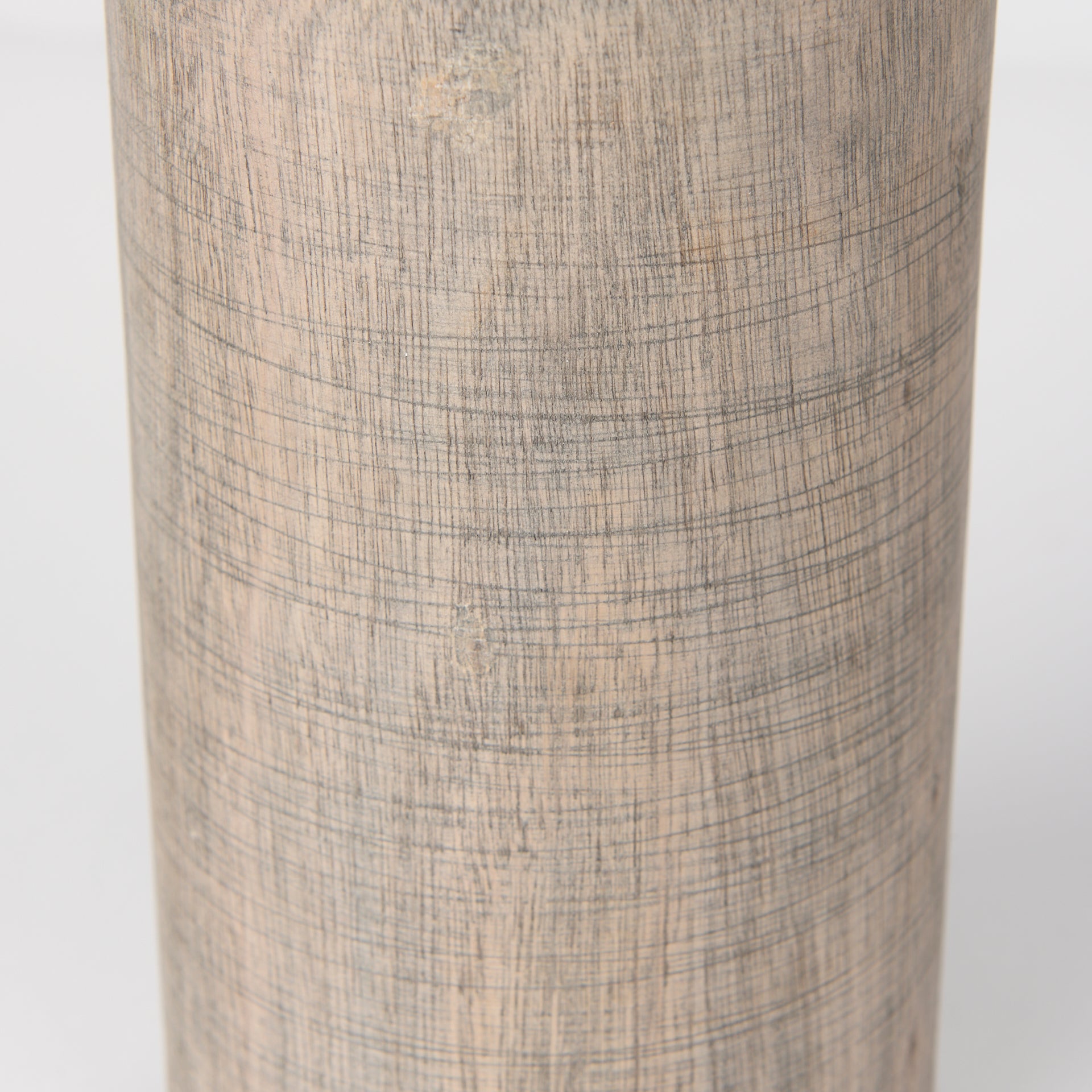 The gray-wash gives a matte, muted brown finish to the wooden cylindrical objects.
