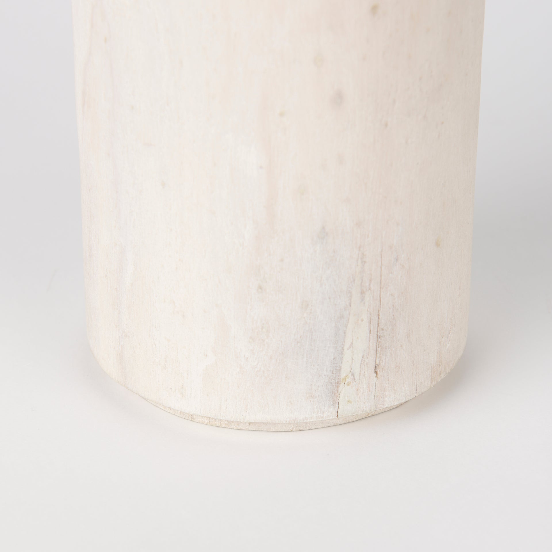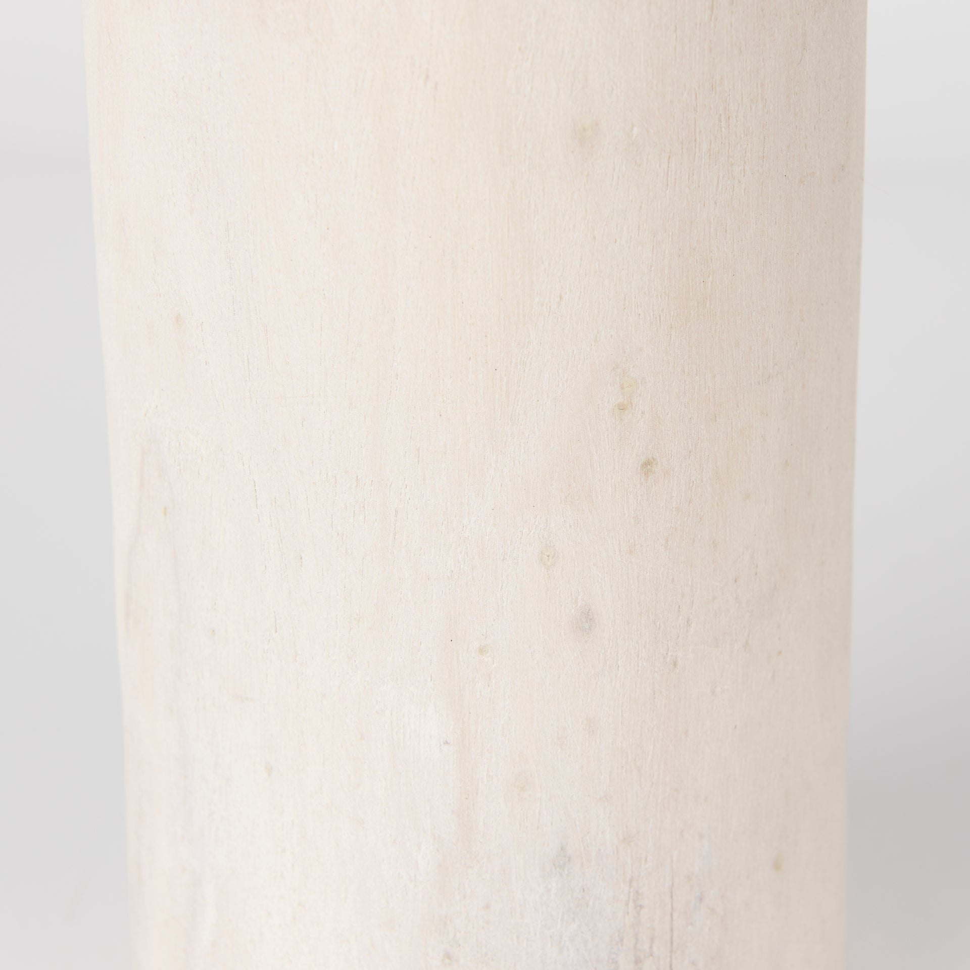 A wooden cylindrical tower object with a delicate white-wash.