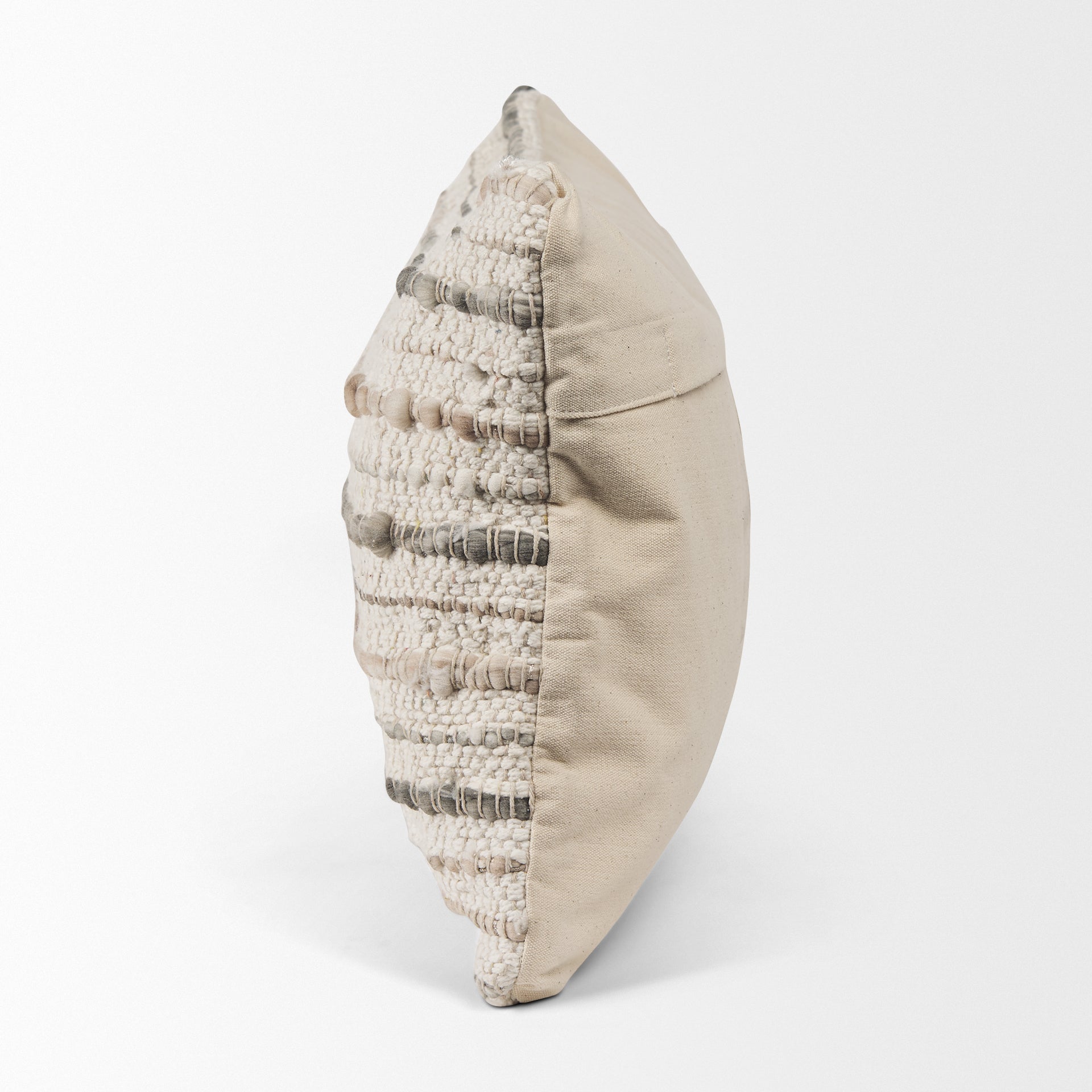 The Kodi Pillow Cover is a decorative, handwoven lumbar pillow cover with soft, neutral tones in a striped pattern.