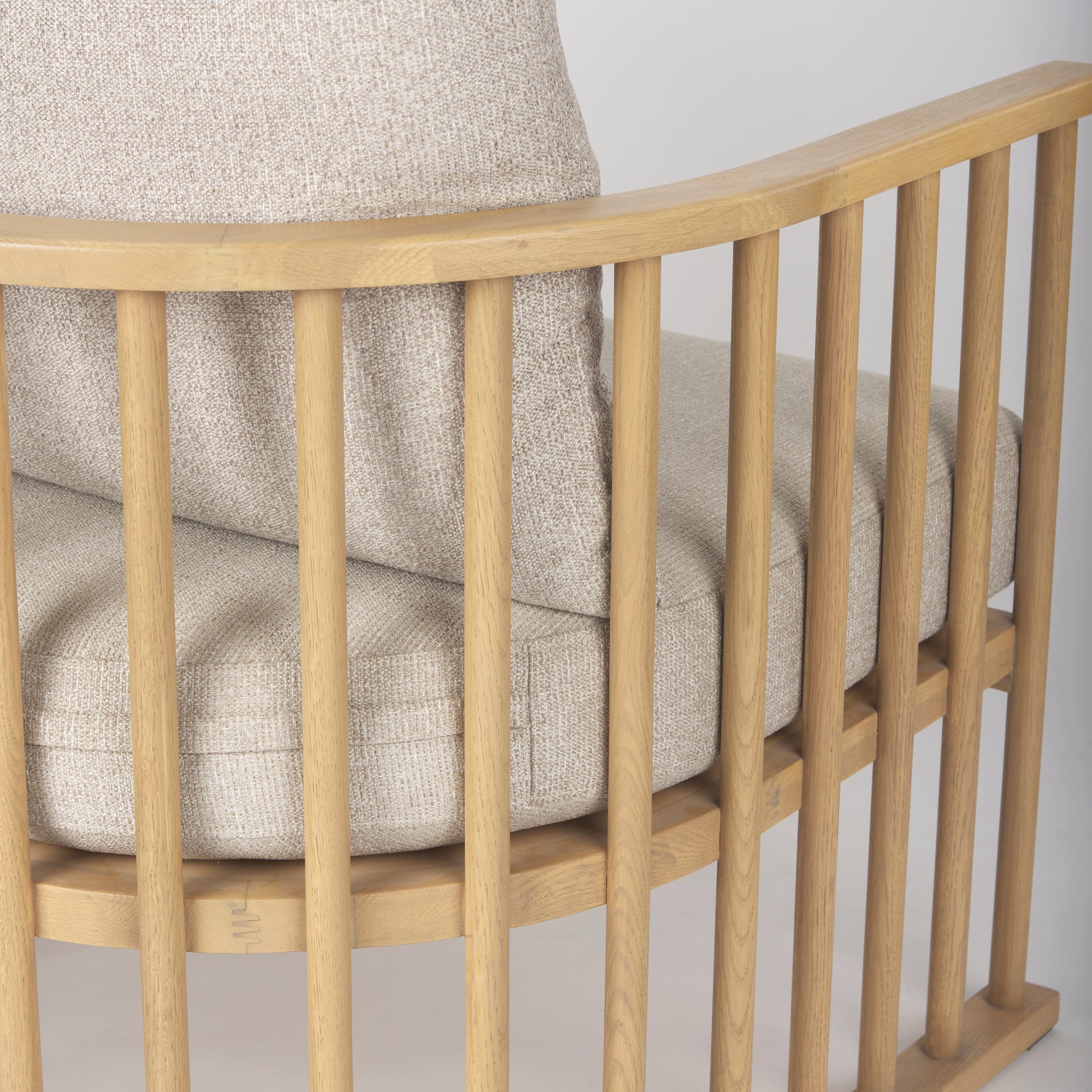 Kopari is a beige tweed fabric chair with a warm toned, light brown wood framing.