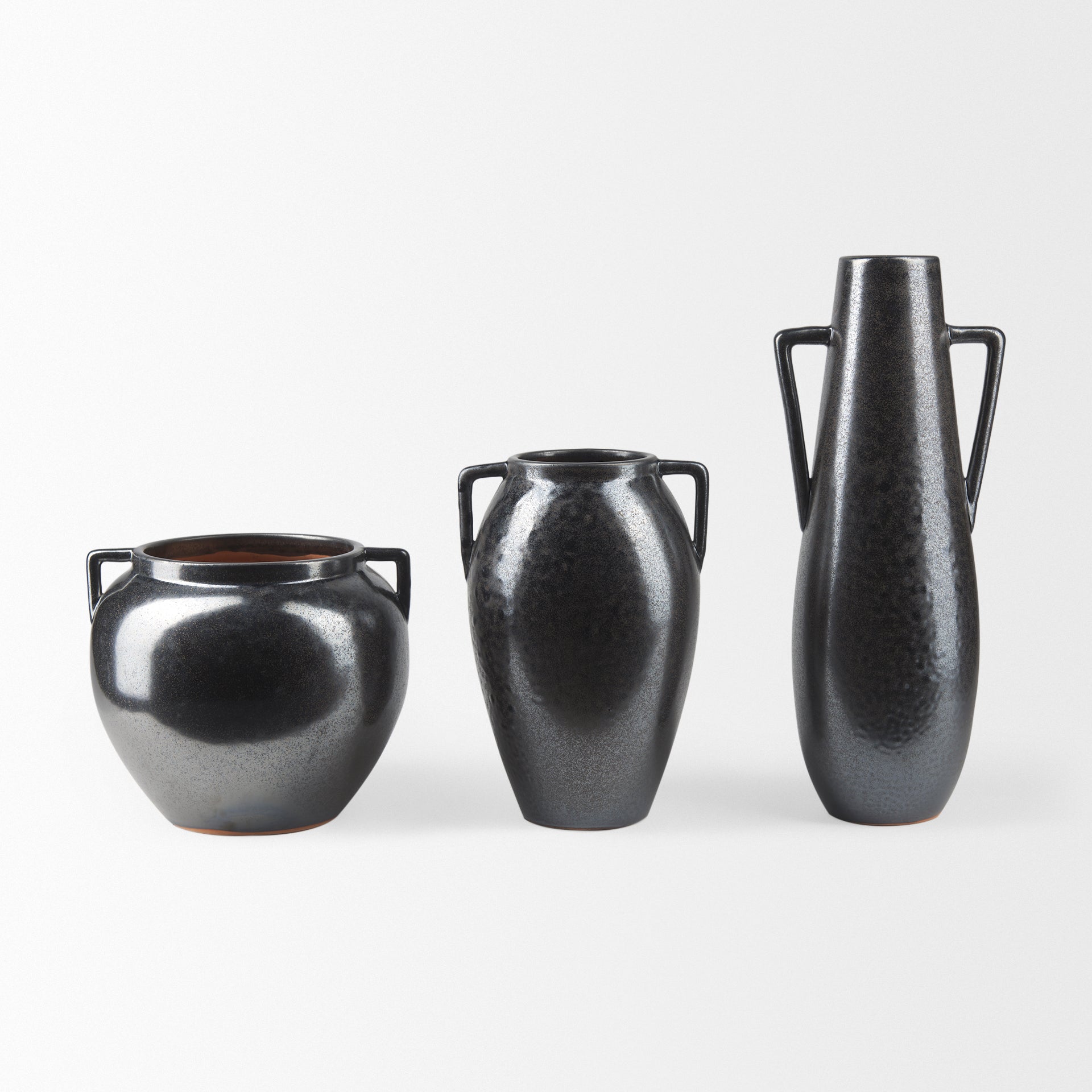 A contemporary vase with triangular ears in a unique, metallic dark gray-brown finish.