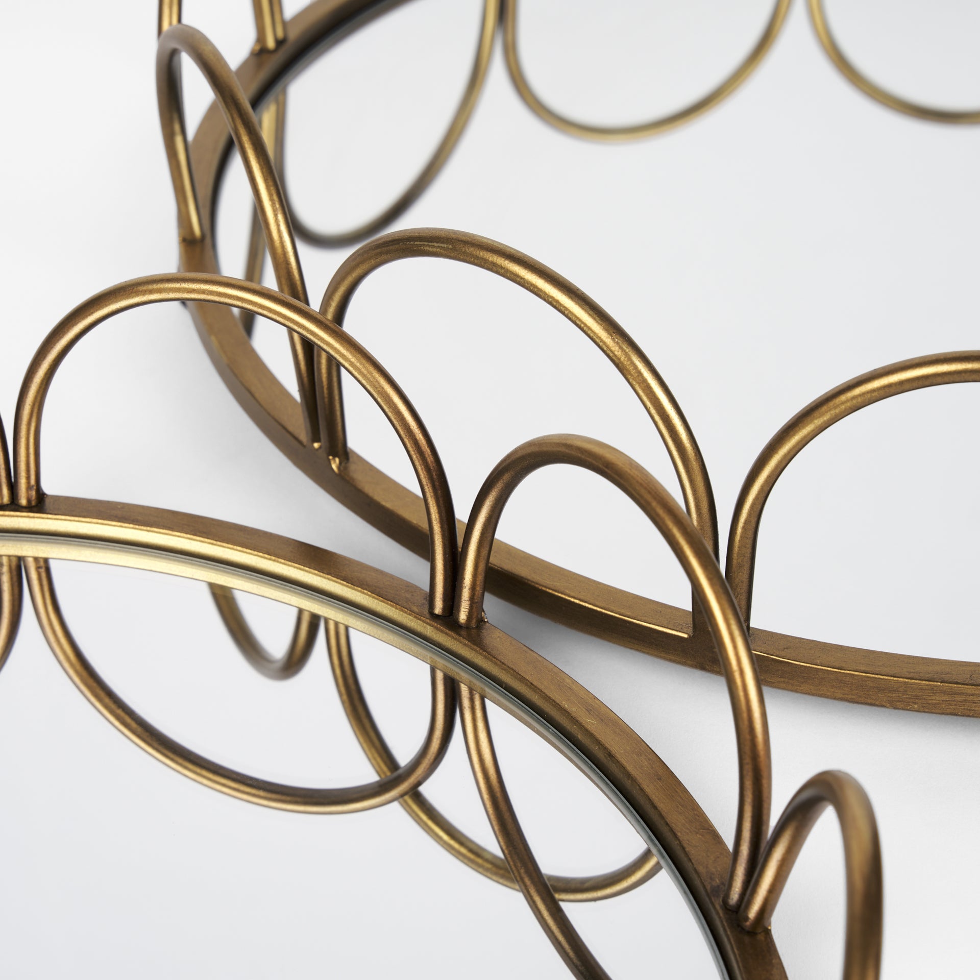 The Lenore Mirror Tray is a set of 2 round, mirrored trays with a scalloped metal trim finished in painted antiqued gold.