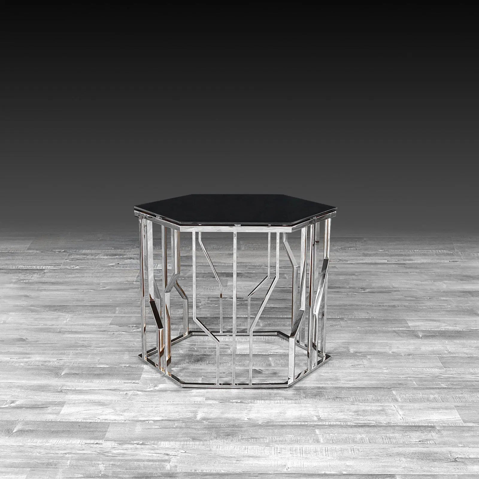 The Lorensia end table, by Roberto Grassie, is perfect for living rooms, bedrooms, or any space where you need a stylish accent piece. Its distinctive octagon shape not only provides ample surface area but also enhances the visual interest of your decor. The combination of the black glass top and polished stainless-steel base creates a striking contrast, making this end table a standout addition to your home.