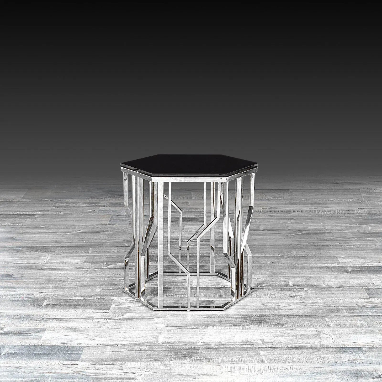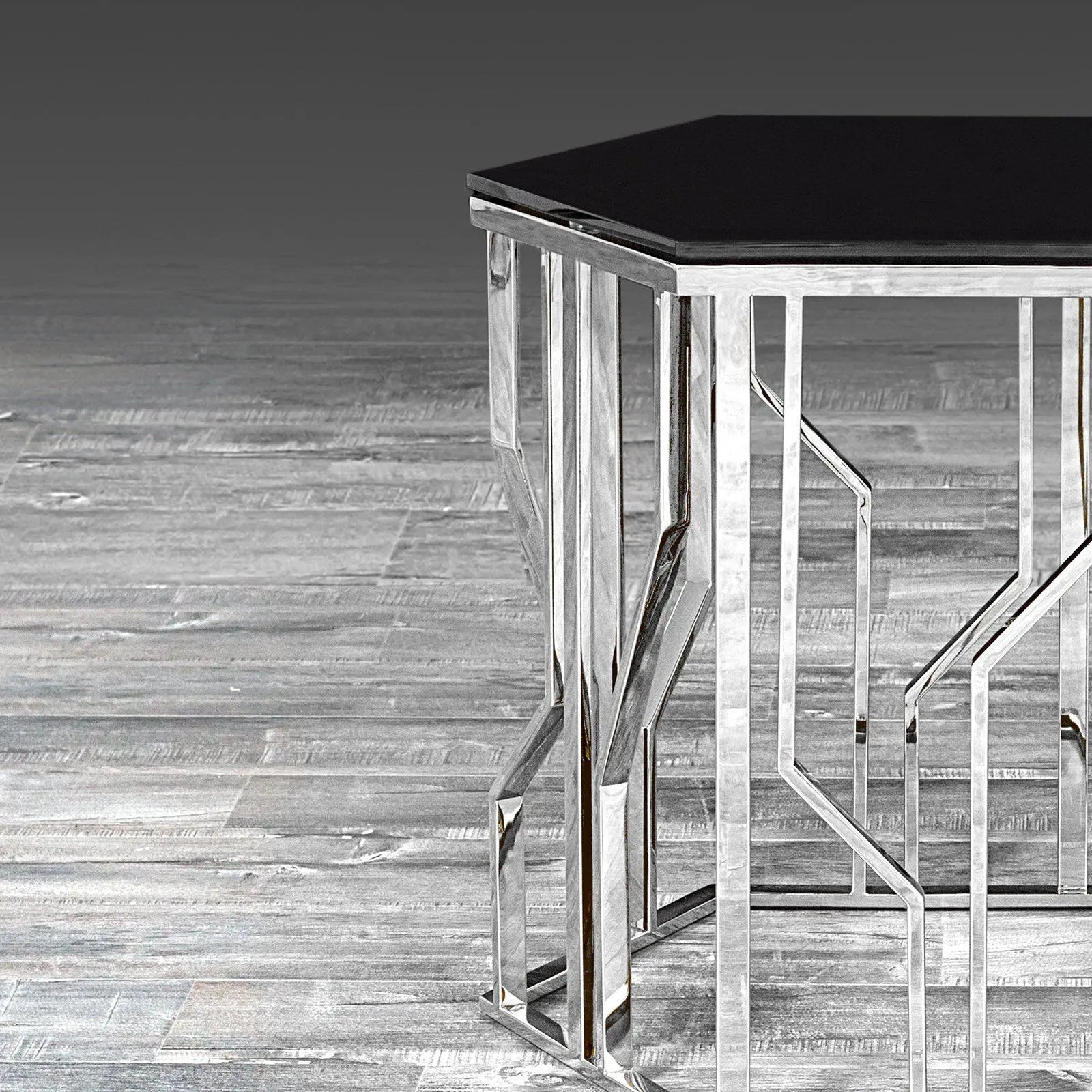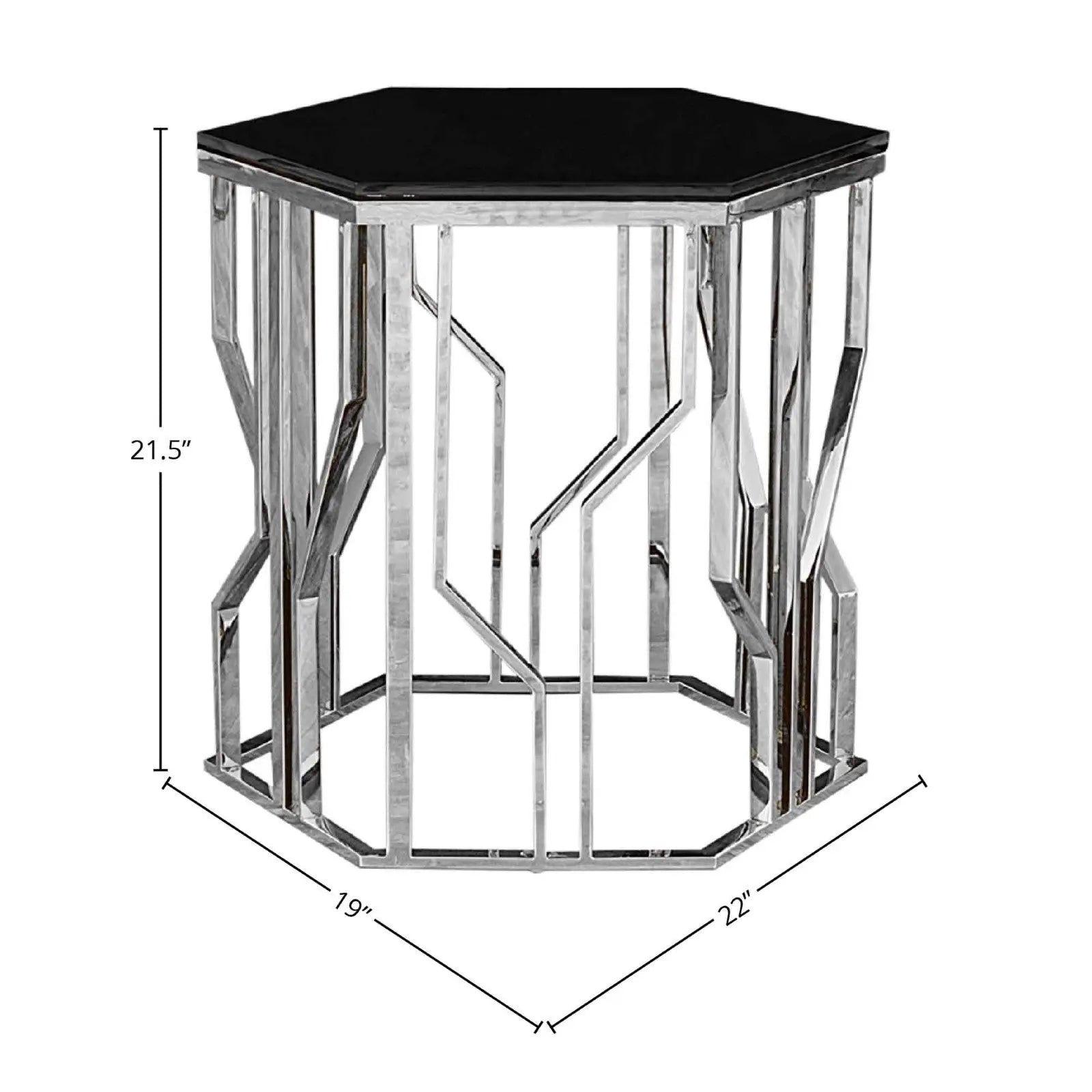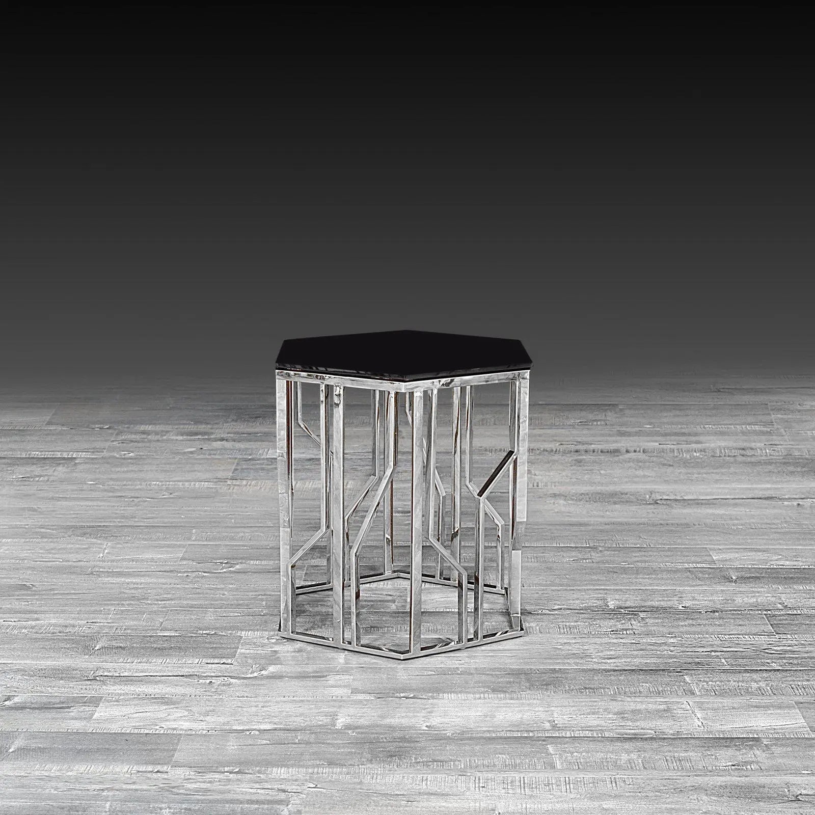 Introducing the Lorensia Luxury Small End Table, by Roberto Grassie, a perfect blend of modern design and functionality. This exquisite end table features a unique hexagon black glass top that adds a touch of elegance to any room. The top is beautifully supported by a polished stainless-steel base, available in a stunning silver finish that enhances the tableβs contemporary aesthetic.