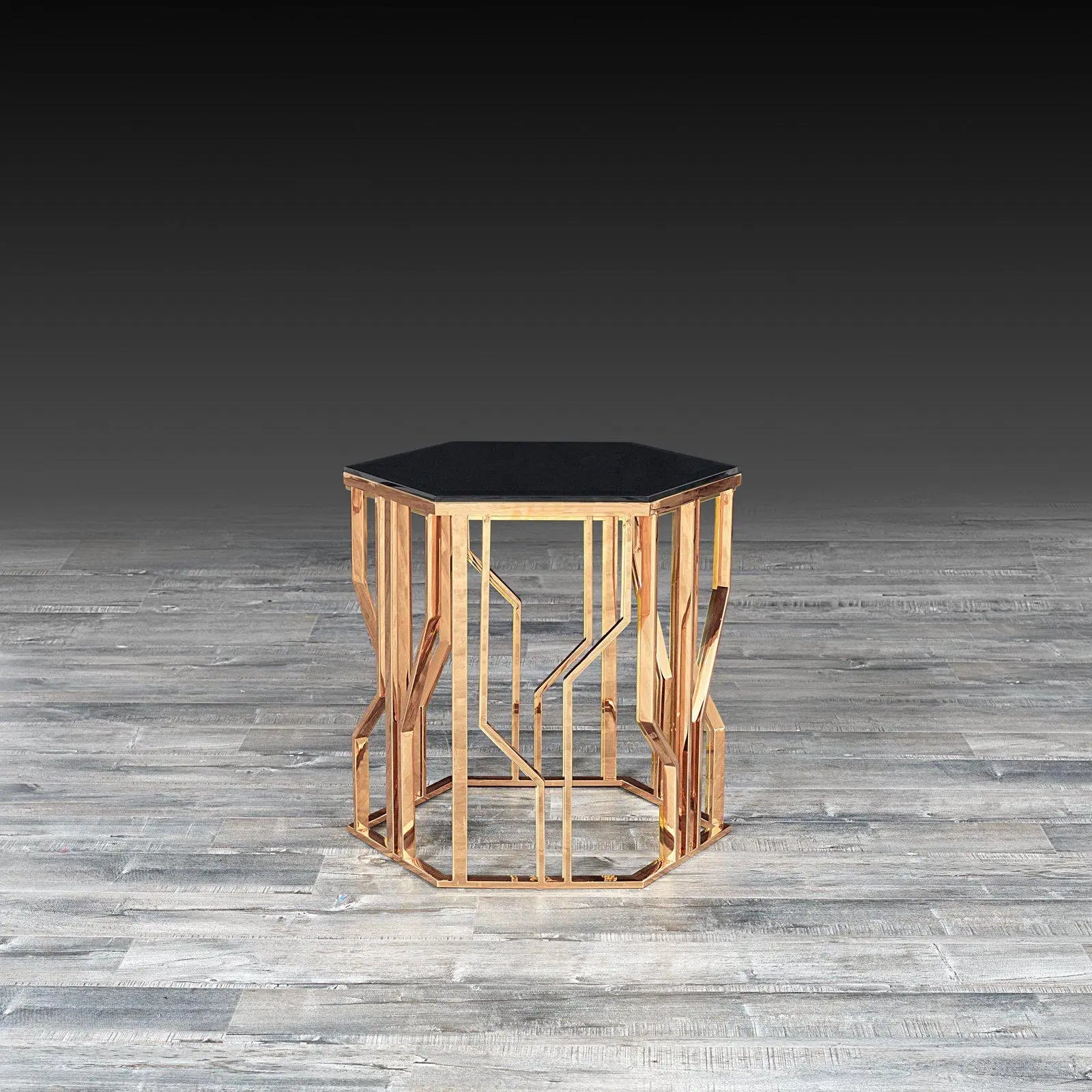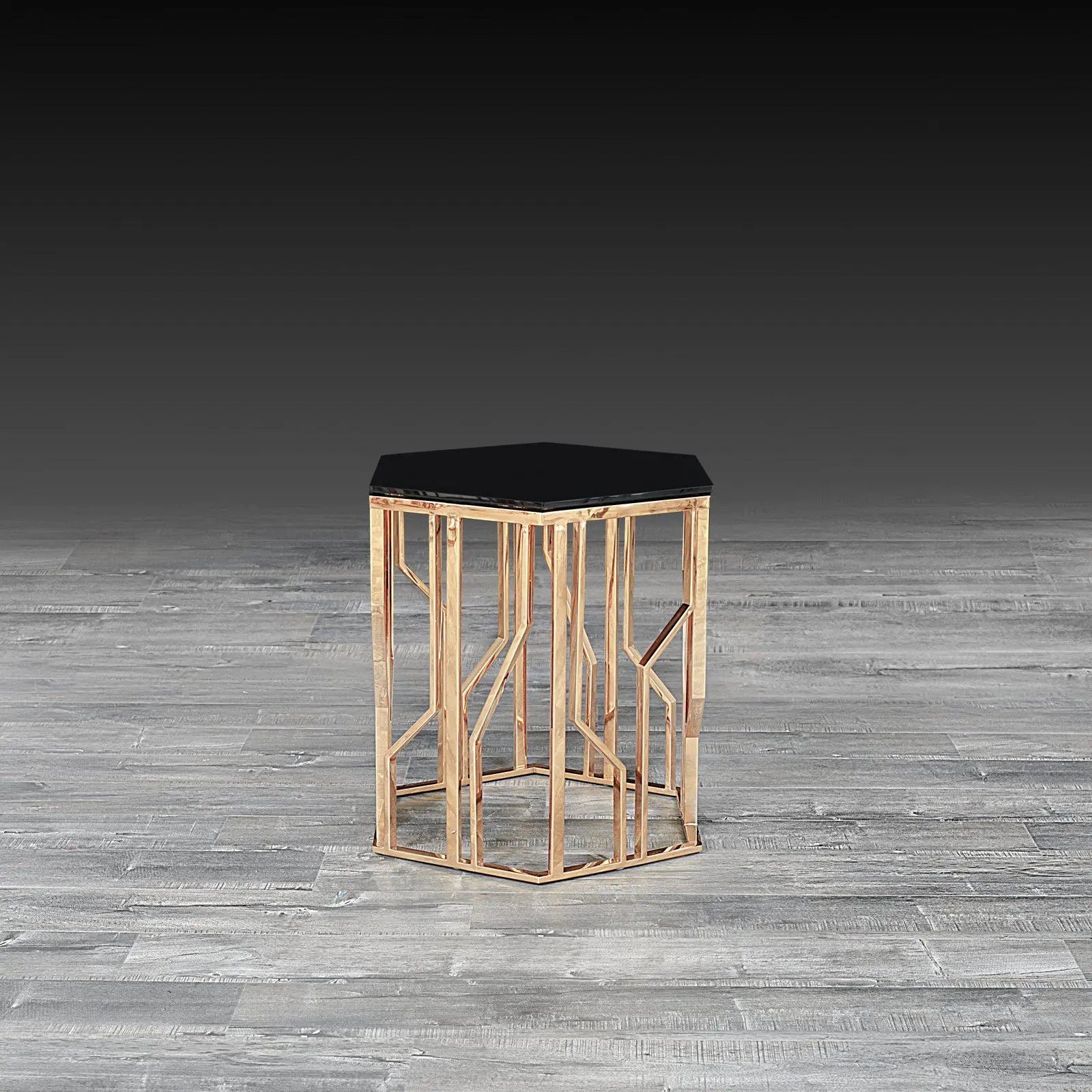 The Lorensia end table, by Roberto Grassie, is ideal for living rooms, bedrooms, or any space where you need a stylish accent piece. Its compact size makes it perfect for tight spaces, providing functionality without sacrificing style. The combination of the hexagon top and the polished stainless steel base creates a striking contrast, making this end table a standout addition to your home decor.