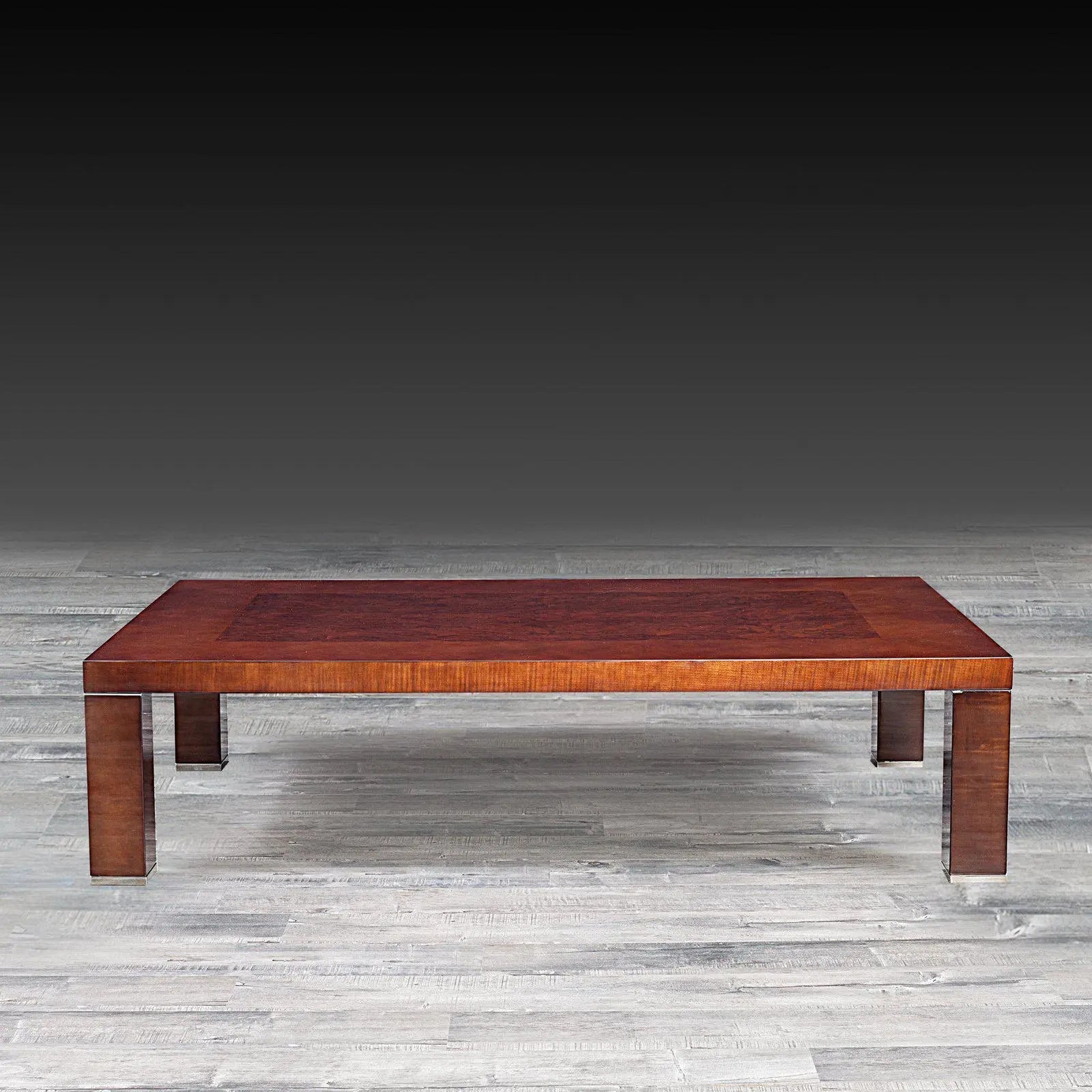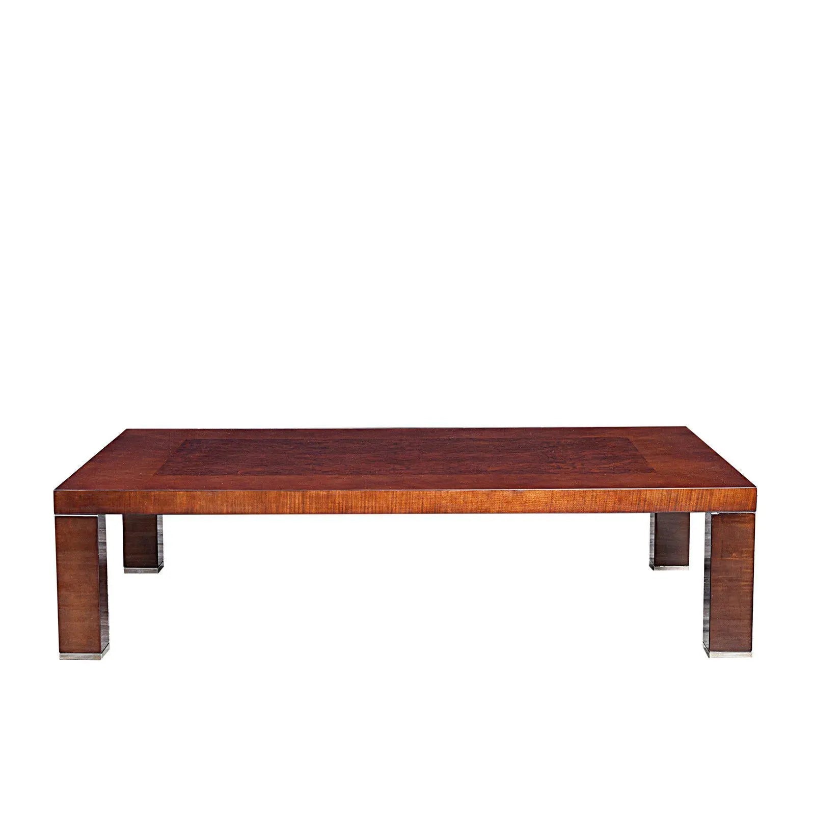 Lotus Luxury Rectangular Coffee Table by Roberto Grassie is crafted by maple and burl wood veneers and finished with high gloss lacquered top and base with silver polished stainless-steel details.